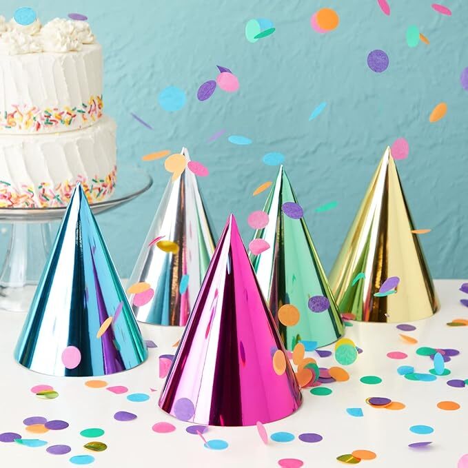 50 Pack Birthday Party Cone Hats for Kids and Adults, Bulk Set in 5 Colors (M... Birthday Cone Hats: These metallic party hats come in 5 colors, including blue, green, gold, silver, and hot pink; perfect for retro themed parties and gatherings Pre-Strung: These birthday hats are pre-strung with an elastic string; making them conveniently adjustable for both kids and adults; the hats are also easy to assemble so it can save you time for any party preparation Easy to Assemble: These shiny party hats are made of sturdy and durable cardstock paper, also great for your party guests to do customization with markers and stickers Dimensions: Each cone hat measures 5 x 7 inches after assemble; one size fits most children and adults with elastic string, perfect for a large group of guests What's Included: You'll receive 50 metallic cone hats suitable for rainbow party favors, graduations, baby showers, Christmas holiday, and New Years celebrations Shipping We offer FREE shipping on all orders! We ship within Three business days of payment, usually sooner. We use a selection of shipping services such as UPS, FedEx, USPS etc. We only ship to the lower 48 states, no APO/FPO addresses or PO Boxes allowed. Local pickups and combined shipping options are not provided at this time. Return You can return a product for up to 30 days from the date you purchased it. Any product you return must be in the same condition you received it and in the original packaging. Please keep the receipt. Customer satisfaction is very important to us. If you have any problem with your order, please contact us and we will do our best to make you satisfied. Contact Us If you have any queries, please contact us via ebay. We usually respond within 24 hours on weekdays. Please visit our eBay store to check out other items for sale! Thank you for shopping at our store.