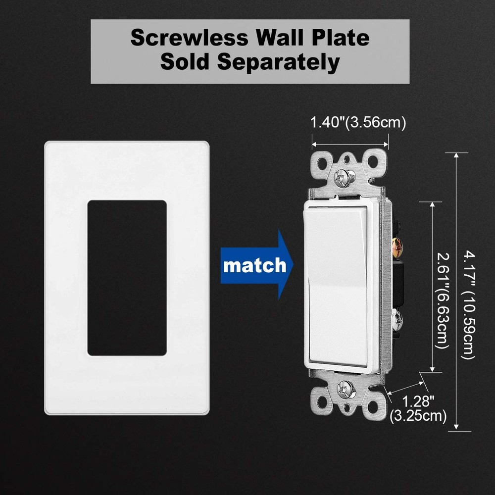 (50 Pack) Single-Pole Decor Switches 15A/120-277V, White switches are built to withstand a high duty cycle commercial environment using high-quality internal components and impact-resistant polycarbonate housing to provide a lifetime of reliable function. The quiet, smooth, yet positive switch action emphasizes the quality and finish with which these switches are made. The durable white glossy finish gives any home, shop, or office a stylish, sleek and modern look. Installation Easy installation switches with both push-in or side terminal wiring. Warranty 3-year worry-free warranty. Sturdy impact-resistant polycarbonate construction for residential and commercial use 10,000+ cycle test approved rocker switch Single pole. 15A 120-277V Terminal screws accept copper or copper-clad wire (up to 12 AWG). Quick push-in terminals accept 14 AWG solid copper wire only CML provides 3-year replacement warranty