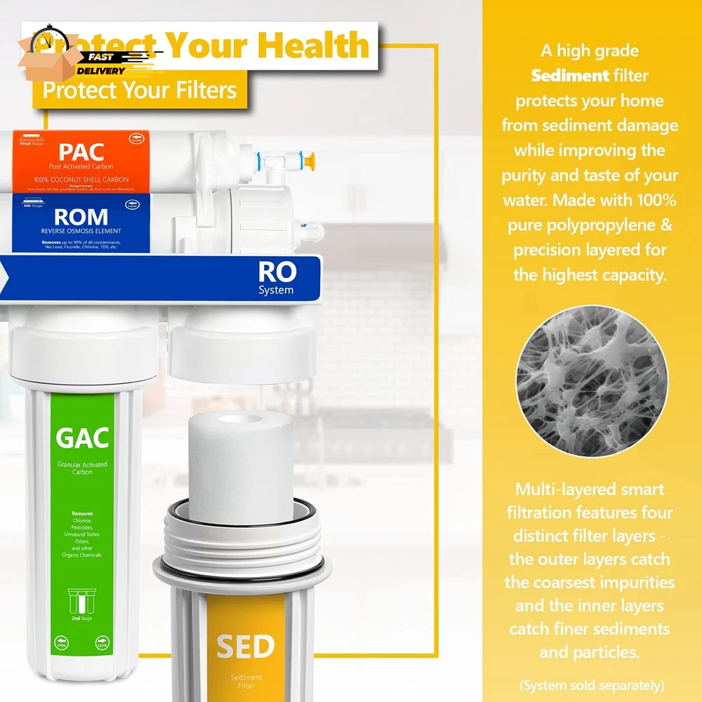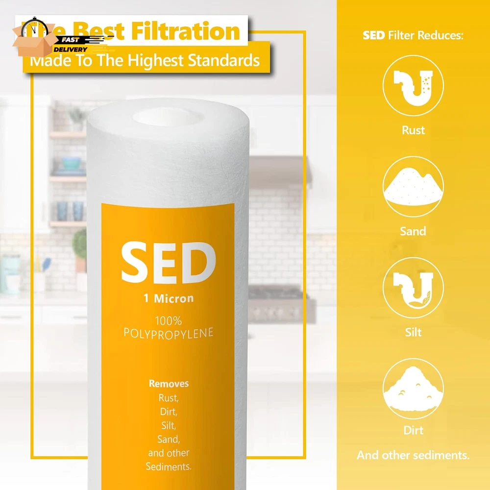 Store New Arrivals Add to Favorite View Feedback Contact – 50 Pack Sediment Water Filter Replacement – 1 Micron, High Capa Description Item model number FLTSED0150 Unit Count 50.0 Count Style 1 Micron External Testing Certification ANSI, NSF Item Weight 15 Pounds Material Polypropylene (PP) Country of Origin Taiwan Product Benefits Removes Impurities Global Trade Identification Number 00641990966206 Number of Items 50 Is Discontinued By Manufacturer No Product Dimensions 2.5"D x 10"W x 2.5"H Size 50 Count (Pack of 1) Reverse Osmosis Filter Replacement: Experience what water should taste like with the Express Water reverse osmosis water filtration system removing up to 99.99% impurities. RO Water Filter Replacement: Each Express Water replacement filter is specially designed to work together and compliment each other. Get the cleanest water and the best value in your reverse osmosis water filter. Sediment Water Filter: Made with 100% pure polypropylene and food grade materials, Express Water’s sediment filters keep the most damaging sediments out of your drinking water system and protect your other filters from coarse impurities including rust, sand, dirt and silt. Replacement Water Filter: Express Water filters are made with the highest quality materials for long-lasting filtration and value. On Demand Support: Support from experts who can answer any of your questions about your replacement water filters Reverse Osmosis Filter Replacement: Experience what water should taste like with the Express Water reverse osmosis water filtration system filters out up to 99.99% impurities. RO Water Filter Replacement: Each Express Water replacement filter is specially designed to work together and compliment each other. Get the cleanest water and the best value in your reverse osmosis water filter. Sediment Water Filter: Made with 100% pure polypropylene and food grade materials, Express Water’s sediment filters keep the most damaging sediments out of your drinking water system and protect your other filters from coarse impurities including rust, sand, dirt and silt. Replacement Water Filter: Express Water filters are made with the highest quality materials for long-lasting filtration and value. On Demand Support: Support from experts who can answer any of your questions about your replacement water filters. Protect your home, health, and appliances by filtering your water with a water sediment filter. The Express Water Sediment Filter reduces major sediment impurities from your water and provides clean water for all home uses. This 1-micron water filter reduces sediment impurities like Rust, Dirt, Sand, Silt, Dust, and Scale. The Sediment filter is good for up to 6 months. This is based on average water quality. Your replacement filter life may be different depending on your water quality, temperature, and incoming pressure. This durable sediment filter can deliver up to 1 gallon of water per minute. The sediment filter cartridge works with 45-80 psi and water temperatures between 40-100°F. The water filter replacement cartridge is vacuum sealed and 100% pure food-grade polypropylene complete with density layering. Filter your water with high quality polypropylene for maximum sediment retention. Choose the replacement sediment filter that lasts longer to give you the best value in filtration: The Express Water Sediment Filter FLTSED0150 is the best in sediment filtration. ABOUT US We offer the best prices around on high quality products. Our E-store includes media such as books, movies, music and games while offering electronics, toys, sporting apparel, clothing, tools, general home, garden items and more. SHIPPING We are always working hard to ensure your package arrives as soon as possible. Please understand that some factors like weather, high postal traffic, and the performance of shipping companies are outside of our control. We offer free shipping to the lower 48 states and ship within 2 business days of payment, usually sooner. We do not accept P.O. Boxes. Please provide a physical address. For shipping outside of the continental USA, we only use eBay's Global Shipping Program.The item is shipped to KY and then sent to the rest of the world. International customers are responsible for all duties and taxes. Continue to check out in order to calculate costs for shipping the item to your country. Messages regarding eBay's Global Shipping Program MUST be directed at eBay EXCLUSIVELY. RETURNS We offer a 30-Day Return Policy on items which you are not completely satisfied with. You have the option for a full-refund or an exchange of the item. No returns are available on items shipped outside of the USA. PAYMENT We accept PayPal. CONTACT US This page content is yet to come Please ad us to your favorite seller and visit again later Thank You CUSTOMER SATISFACTION We try our very best to make sure every customer is completely satisfied. If there's a problem, message us! We're happy to help. WE ACCEPT Copyright © 2021 AutoDS. | All Rights Reserved