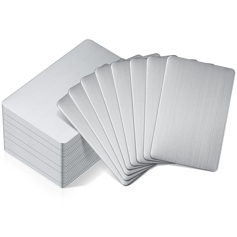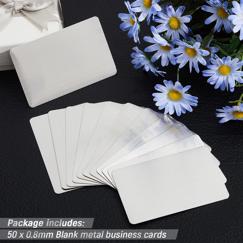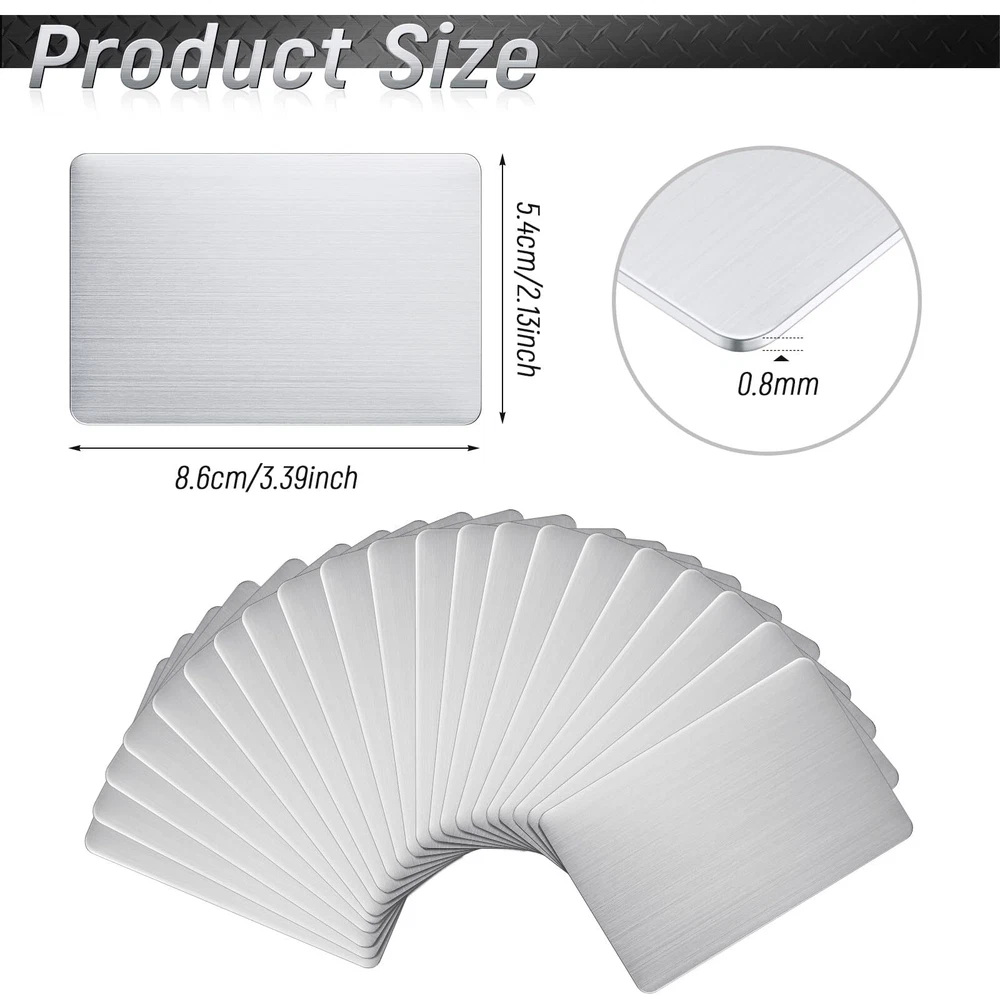 50 Pack Stainless Steel Metal Business Cards Blank Metal Cards for House Office Features: Package Including: our package contains 50 pcs metal engraving cards; The abundant quantity can easily meet your daily application and replacement requirements, you can also share them with others Delicate Design: our portable business cards are blank on both sides, you can carve prints, texts, words, and others you want, which are hard to wear; You can also create your own exquisite cards, showing your style and taste in this way Wide Application: our blank playing cards can be made into different items according to different needs, such as gift cards, VIP cards, table cards, labels, business cards, nameplates, and many others, provide you with a lot of convenience Quality Material: made of 304 stainless steel, our blank metal business cards are solid and hard, not easy to bend, deform, or break under pressure, smooth and flat for you to touch, and can accompany you for a long time Proper Size: our metal engraving cards measure approx. 0.8 mm in thickness, thick and firm, easy for you to carve; And it is approx. 3.39 x 2.13 inches/ 8.6 x 5.4 cm in size, compact and portable, light in weight, convenient for you to carry around and store in pockets, bags, and more Description: Features: Nice gift: Our delicate metal cards can be written on according to your preference, so they can be a suitable gift for friends, family and neighbors who need stainless steel cards. Reliable material: Our home blank cards are made of 304 stainless steel, which are solid and hard, not easy to bend, deform, or break under pressure and can accompany you for a long time. Specifications: Material: mainly stainless steel Color: as the picture shows Size: approx. 3.39 x 2.13 inches/ 8.6 x 5.4 cm, approx. 0.8 mm in thickness Package includes: 50 x Stainless steel cards Notes: Manual measurement, please allow slight errors on size. The color may exist a slight difference due to different screen displays. 🌻 If you need more quantity than shown available - just send me a message and I'll increase the purchased limit for you 🌻 SHIPPING We are always working hard to ensure your package arrives as soon as possible. Please understand that some factors like weather, high postal traffic, and the performance of shipping companies are outside of our control. We offer free shipping to the lower 48 states. We do not accept P.O. Boxes. Please provide a physical address. Thank you 🌻 TRANSLATE with x English Arabic Hebrew Polish Bulgarian Hindi Portuguese Catalan Hmong Daw Romanian Chinese Simplified Hungarian Russian Chinese Traditional Indonesian Slovak Czech Italian Slovenian Danish Japanese Spanish Dutch Klingon Swedish English Korean Thai Estonian Latvian Turkish Finnish Lithuanian Ukrainian French Malay Urdu German Maltese Vietnamese Greek Norwegian Welsh Haitian Creole Persian