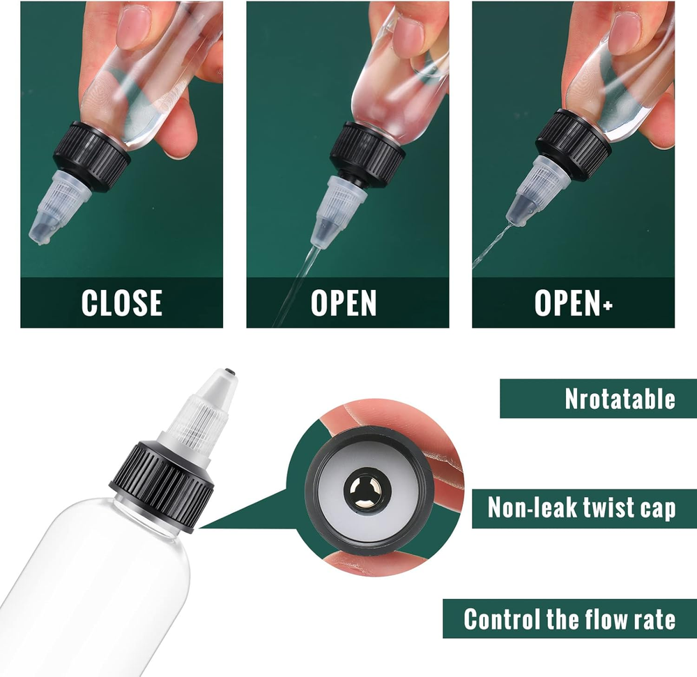 Rich Package: you will be provided with 50 pieces of 4 oz/ 120 ml condiment squeeze bottles in a package, adequate quantity can fully meet your daily needs, also you can share with intimate mates and family members PET Material: made of low density PET plastic material, 4 oz plastic bottles are sturdy yet squeezable, feature good flexibility and high temperature resistance, which will not deform in most solvents, and can be widely applied to tattoo, industrial, scientific laboratory Twist Cap Spout Design: empty squeeze bottle is designed with a twist cap spout, twist the upper cap and the dropper can be well controlled, thus convenient for you to apply a small amount of product to the targeted area, such as applying for cakes, candies, cookies etc., effectively controlling flow, avoiding spills due to over squeezing, and performing well in anti leaking Easy to Use: adopting clear color, plastic squeeze bottles for liquids are easy for you to see the level of contents in the bottle, keeping your items organized and reminding you to replenish the bottle solution in time Wide Application: twist top applicator bottle is indispensable for storing and dispensing a wide variety of liquids and thinners, including oils, solvents, also ideal for white and yellow glues for crafting and woodworking, even to store inks, paints Product description Made of low-density PET plastic material, strong and easy to extrude, good flexibility and high temperature resistance. Screw lid has good sealing, leak-proof performance, suitable for most liquid. Designed with a screw lid nozzle, screwing the top lid gives you good control of the dropper, making it easy for you to apply a small amount of product to the target area.