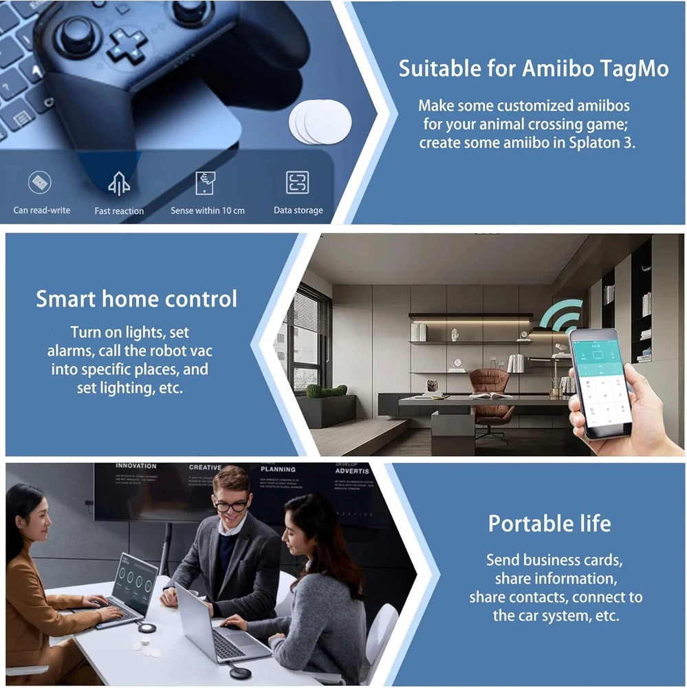 50 Pieces NFC Tags, NTAG215 NFC 215 Tags Blank NFC Coins White NFC Stickers Cards with Adhesive Back, Compatible with TagMo and NFC Enabled Devices Item Description ★ Small NFC Coins: The package contains 50 pcs NTAG215 NFC coin cards, diameter 25mm/1 inch, each NFC tag comes with an adhesive back for easy attachment. Small and portable to carry. The quantity is just the right amount for fun and needs; good choice as a small gift for your friend or family. ★ Quality NFC Stickers: Thoughtfully designed and rigorously tested, constructed with durable, waterproof new PVC material while abrasion-resistant and non-toxic. with adhesive back for easy fixing, our NFC tags stickers can be placed virtually anywhere and even if near water without the risk of losing functionality. Note: not designed for use on metal surfaces. ★ Wide Application: Compatible with TagMo and most NFC-enabled Android phone & devices, you are able to write the NFC tag easily and make a tag for any weapon, pet, mount or fashion item you want. Quickly share your social messages, music, connect to WiFi,business card, URL, text, security, authentication purposes, ect. The NFC cards are rewritable, which means you can use them over and over again to store different data and information (for amiibos can only be edited once and cannot be reused). ★ NTAG215 Chip: High quality NTAG215 Chip, with 504 bytes of available NDEF memory. Providing enough storage space, you can quickly write the information you want. It has a read-write lock function that makes the NFC cards can be edited repeatedly or read-only, cannot be edited or reset after set as read-only tag. The NFC blank tags can be read and written over 100,000 times, please note that it is not suitable for use in strong magnetic environment. ★ Hassle Free Warranty: We are confident that you'll love our NFC Tags. If, for any reason, you're not satisfied with the NFC stickers, we will issue you a full refund or an exchange! Any questions, please do not hesitate to send the seller a message through Amazon and we will respond within 24 hours. Payment Shipping . Return