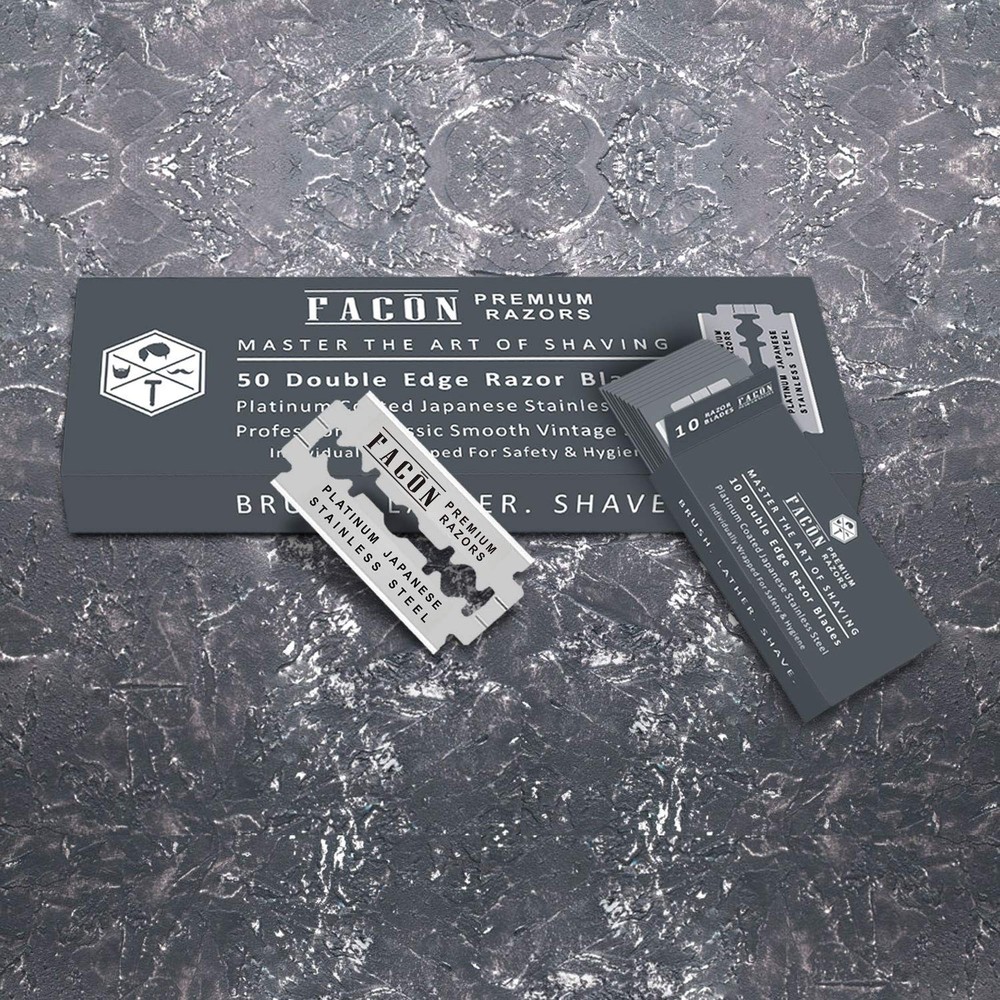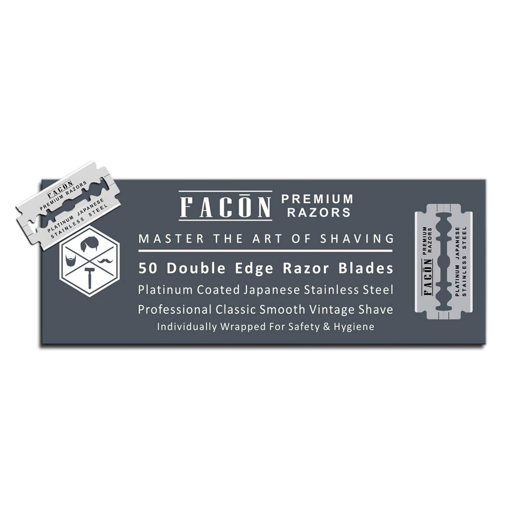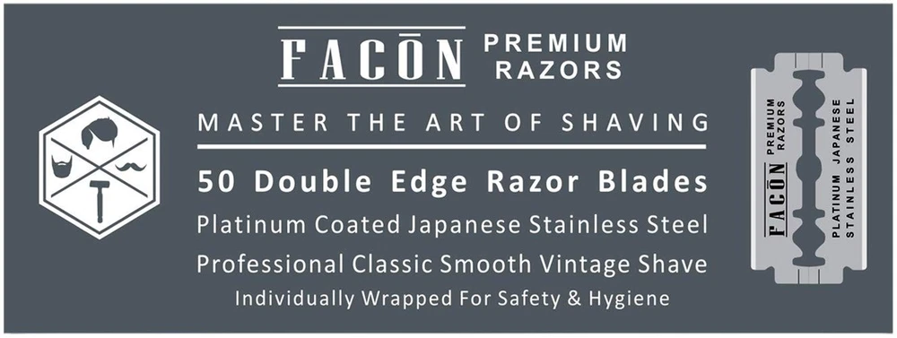 50 Facón Platinum Japanese Stainless Steel Double Edge Razor Blades for Safety Razor - Close Smooth Shaving Experience - 200+ Shaves Product Details Is Discontinued By Manufacturer : No Product Dimensions : 5.5 x 2 x 0.5 inches; 1.76 ounces Item model number : Facón 50 Manufacturer : Facón Razors Brand: FACON Number of Blades: 50 Recommended Uses For Product: Shaving Age Range (Description): Adult Skin Type: All SIGNATURE BLADES - Extremely sharp, smooth and comfortable. Barbershop/Salon Favorite! PREMIUM QUALITY - Japanese stainless steel blades, designed for smooth shaving experience ELITE STYLE - Fits all brands of safety/straight/barber razors, Genuine imported materials CONVENIENCE - Each blade is individually wax paper wrapped for safety and hygienic purposes