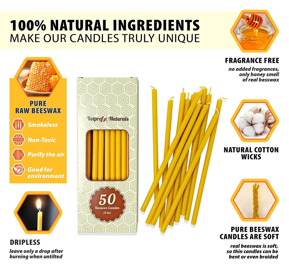 ABOUT US: We are a small family-operated company committed to provide our customers with the best eco-friendly nontoxic candles. The small scale of our business allows us to deliver personalized attention to every order and customer. WHAT MAKES OUR PURE BEESWAX CANDLES REALLY GREAT: 🐝 Beeswax candles are good for your health because beeswax doesn’t pollute the air. When burned, they give off negative ions that neutralize dust, toxins and allergens. They are considerably better for people with allergies or asthma than paraffin candles. 🐝 Our dripless taper candles burn much longer than typical paraffin candles, which makes them more cost-effective. 🐝 Our beeswax candles have a mild and pleasant smell of honey. They burn clean with no smoke and no drips, leaving nothing behind but one small beeswax drop. 🐝 They are eco-friendly, don’t pollute the environment and are better for the planet. Unlike paraffin candles, beeswax candles don’t rely on any petroleum products. Unlike soy, beeswax production doesn’t require the use of huge areas of agricultural land. Instead, it supports crop pollination for a healthy food supply around the world. 🐝 Our honey candles are very universal and work perfectly for home decor, candlelight dinners, prayer, churches, any religious purposes, any holidays and even birthday cakes. They also make a perfect gift for any occasion. You can never go wrong with them! Check out our beautiful ceramic holders in our store. Never leave a burning candle unattended! NATURAL RAW BEESWAX - We use only 100% pure natural raw beeswax to make our taper candles. They have a natural deep yellow color (shades may vary depending on the season). NATURAL SWEET SCENT OF HONEY - Our bee wax candles have a mild and pleasant natural smell of honey. They are nontoxic and more suitable for people with allergies or asthma than paraffin candles. DRIPLESS AND SMOKELESS - Our dripless taper candles leave behind only one small bee wax drop after burning. They are smokeless and purify the air instead of polluting it like typical paraffin candles do. BURN BEAUTIFULLY - All our beeswax candles have natural lead-free cotton wicks and burn purely. The diameter of each candle is about 1/4 in and the burning time is about 1 h. Holders are not included, but you can buy them separately in our store. REASONABLY PRICED – For a reasonable price, you get 50 high-quality beeswax candles that will last long. The total weight of 50 taper candles is 7 oz.