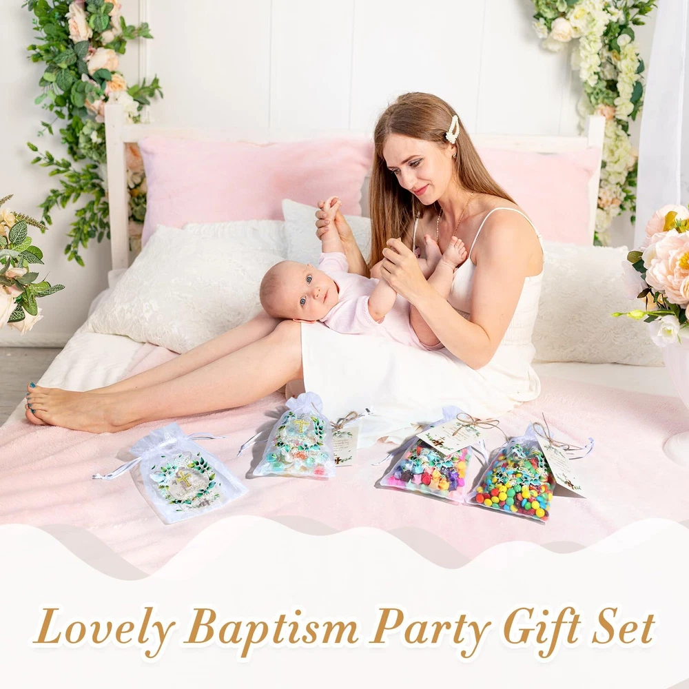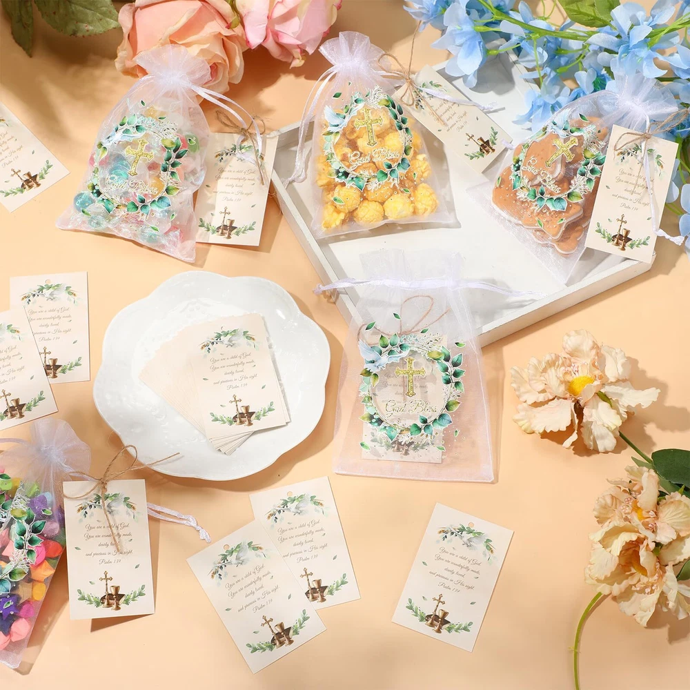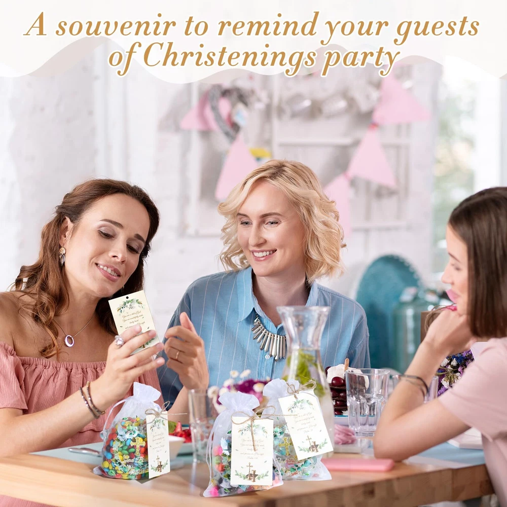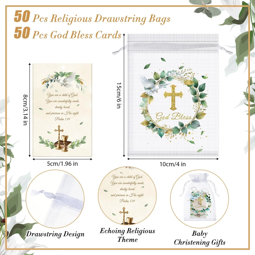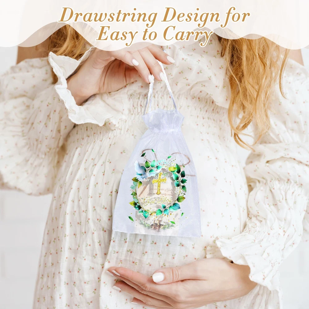 Features: Practical drawstring design: These small baptism drawstring bags come with a drawstring closure, you can open or close the bag by adjusting the drawstring, which is easy to operate and convenient for you to quickly access your items, and also avoid the things falling off, practical and thoughtful. A memorable keepsake: These religious party tags, embedded on the first communion organza bag, are ideal choices for guests to cherish the occasion. They serve a dual purpose of being a gift carrier and a beautiful token of the occasion of baptism or first communion party bags, and also can be kept as cherished keepsakes for other special days. Specifications: Material: Favor bag: organza Gift tag: paper Color: mainly green and yellow Size: Favor bag: about 4 x 6 inches Gift tag: about 2 x 3.2 inches Package includes: 50 x Religious party drawstring bags 50 x Baptism gift tags 50 x Hemp ropes Notes: Manual measurement, please allow slight errors on size. The color may exist a slight difference due to different screen displays. The words on the product are only decorative and are not applied as trademarks. Package Include: our package comes complete with 50 pieces of greenery baptism party favor bags, 50 pieces of baptism gift tags, and 50 hemp ropes, such a rich combination ensures that each of your guests can take home a lovely baptism party gift set after your celebration Dainty and Delicate: with a white base color and green border, these first communion organza bags won't fail to catch the eye; Highlighted with a symbolic gold cross pattern framing the [ God Bless] letters, echoing the baptism theme, these organza bags lend a touch of elegance and sophistication to your religious baptism gathering Quality Material: these greenery god bless goodie bags are crafted from quality organza, durable and tear resistant, chic and stylish; Accompanied with religious christening tags that are made of paper, sturdy and reusable, ensuring long lasting use, adding a touch of elegance to your religious party Ideal Size: with a size of about 4 x 6 inches, these god bless gift bags can hold a variety of items like candies, small toys, or special keepsakes; Paired with about 2 x 3.2 inches greenery baptism paper tags, you can jot down sweet messages or use them as baptism gift tags; They are not just favor bags, but a souvenir to remind your guests of your special event Wide Applications: our god bless party gifts can be applied to baby showers, kids birthday parties, church activities, prayer meetings, family gatherings, weddings or Easter parties, they are apt not only for favor giving but also as decorative pieces, enhancing the religious atmosphere effectively