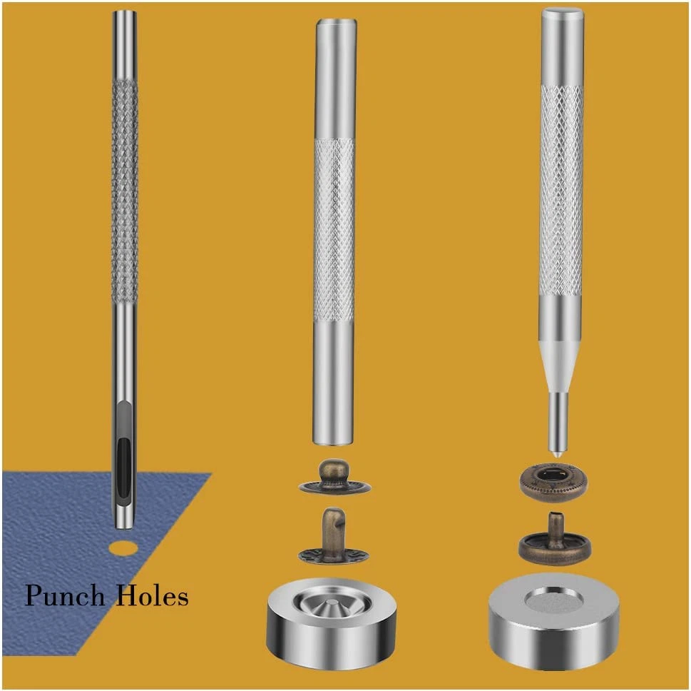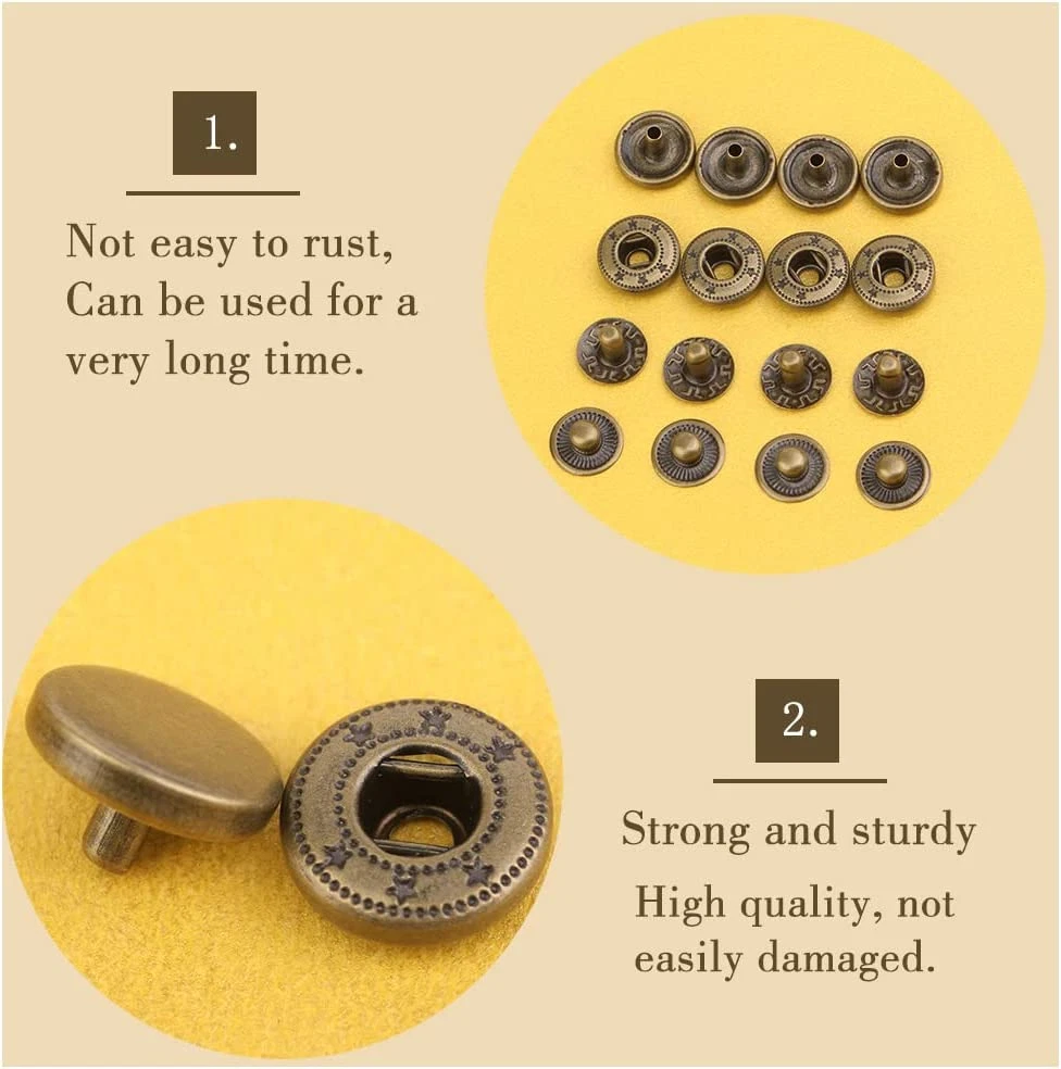 Store New Arrivals Add to Favorite View Feedback Contact 50 Sets Leather Snap Fasteners Kit 10Mm Bronze Metal Snap Buttons Kit Stainless Steel with 4Pcs Snap Fastener Installation Tools for Sewing Clothing, Bracelets, Jackets, Bags Belt, DIY Crafts Description Item model number 01 Unit Count 50.0 Count Style Bronze Color Bronze Material Stainless Steel Country of Origin China Item Weight 5.4 ounces Head Style Button Model Name Leather Snap Recommended Uses For Product Belt Product Dimensions 1.97 x 1.18 x 0.79 inches Manufacturer 01 Snap Button Kit Includes: 50 pairs of snaps kits, each pair has 4 small parts, caps, washers, sockets and studs, also comes with 4 installation tools. These will be packaged in a transparent plastic box, convenient for your storage and use. High Quality Material: The snap button is made of alloy, high quality and not easy to rust, long service life, suitable for indoor and outdoor use, even in wet environments. Simple Installation: This metal snap button kit is very easy to install and use, after you are familiar with the 4 installation and punching tools, you only need to tap hard, even a beginner can easily learn to use it. Precautions: Snaps are suitable for thick to medium weight fabrics, not for thicker or denser fabrics or silks. The snap fasteners cap has a diameter of approximately 10mm/0.39 inches. Please refer to the dimensional diagram to confirm that the snap button is the size you need. Wide Range of Applications: These leather snaps can be used to make leather handicrafts, clothes, shoes, hats, canvas, belts, backpacks and more, can fulfil your various leather decorative demands or clothing repair supplies. Product Description Set Includes: 50 Sets Leather Snap Fasteners Kit, 1 * Punch Tool, 1 * Double-sided Base, 1 * Concave Installation Tool, 1 * Pointed Installation Tool Features: Snap fasteners made of metal materials, hard, sturdy and durable, will not easy to get erosion and rust. These buttons are widely used, you can apply them in jackets, backpacks, hats, suits, trousers, shirts, sweaters, belts, jeans, etc. Please Note: These buttons are small items, please keep them away from children to avoid suffocation by misuse. Complete Snap Installation Tool: Made of durable solid steel with high hardness and good wear resistance. An ideal complete multi-tool for all your needs for quick and easy drilling and snap fit. 1 * Punch Tool 1 * Double-sided Base 1 * Concave Installation Tool 1 * Pointed Installation Tool How to Use: 1. Measure the hole location and mark it on the fabric with a pencil. Use the provided punch tool to punch a hole at the mark. 2. From the front of the fabric, thread the tube of the button through the hole you just punched and snap the stud onto the tube of the button. 3. Using the concave tool, tap it vertically so that the snaps engage the fabric. 4. Using the hole punch tool on the other fabric, make a new hole. 5. From the front of the fabric, thread the tube of the button through the hole you just punched and snap the female stud onto the tube of the button. 6. Using a pointed tool, tap it vertically so that the snaps engage the fabric. 7. Check that the snaps are securely installed. ABOUT US We offer the best prices around on high quality products. Our E-store includes media such as books, movies, music and games while offering electronics, toys, sporting apparel, clothing, tools, general home, garden items and more. SHIPPING We are always working hard to ensure your package arrives as soon as possible. Please understand that some factors like weather, high postal traffic, and the performance of shipping companies are outside of our control. We offer free shipping to the lower 48 states and ship within 2 business days of payment, usually sooner. We do not accept P.O. Boxes. Please provide a physical address. RETURNS We offer a 30-Day Return Policy on items which you are not completely satisfied with. You have the option for a full-refund or an exchange of the item. No returns are available on items shipped outside of the USA. PAYMENT We accept PayPal. CONTACT US This page content is yet to come Please ad us to your favorite seller and visit again later Thank You CUSTOMER SATISFACTION We try our very best to make sure every customer is completely satisfied. If there's a problem, message us! We're happy to help