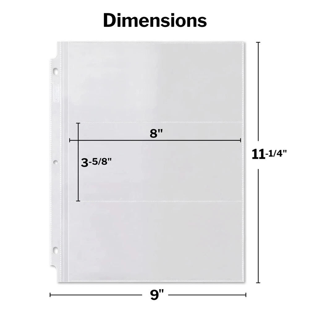 Dunwell Binder Currency Sleeves for Collectors - (50 Pack), Acid-Free 3-Pocket Clear Plastic Refill Pages for Currency Collection Album, 3-Ring Binder Sheet Protectors for Bills, Banknotes or Coupons Use refillable 3-hole punched plastic sleeves for money collection binders, Bill collection book, Coupon organizer, or regular 3-ring binders. 50-Pack: Stores and displays 150 banknotes (showing front and back), Dollar bill plastic sleeves have 3 side-loading pockets, keep valuable paper money collection more secure than top-loading pages. Keep Collectibles Safe and Protected: PVC and acid free currency sleeves are constructed of durable heavyweight poly, archival quality, no ink transfer. Perfect for long term storage. Dimensions: Three pockets, each is 8” wide, 3-5/8” high, Currency holder for bills measures 9 x 11.25", including three-hole punched strip, Fits standard three-ring binder (not included). Many Uses: Plastic protector sleeves can be used for coupons, collectible sports or concert tickets, foreign currencies, old confederate bills or other paper money. Keep your collections organized. Shipping We offer FREE shipping on all orders! We ship within Three business days of payment, usually sooner. We use a selection of shipping services such as UPS, FedEx, USPS etc. We only ship to the lower 48 states, no APO/FPO addresses or PO Boxes allowed. Local pickups and combined shipping options are not provided at this time. Return You can return a product for up to 30 days from the date you purchased it. Any product you return must be in the same condition you received it and in the original packaging. Please keep the receipt. Payment We accept payment by any of the following methods: PayPal Please pay as soon as possible after winning an auction, as that will allow us to post your item to you sooner! Feedback Customer satisfaction is very important to us. If you have any problem with your order, please contact us and we will do our best to make you satisfied. Contact Us If you have any queries, please contact us via ebay. We usually respond within 24 hours on weekdays. Please visit our eBay store to check out other items for sale! Thank you for shopping at our store.