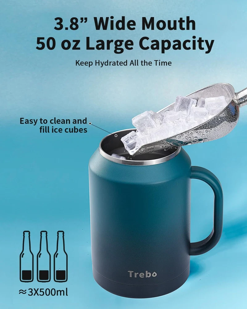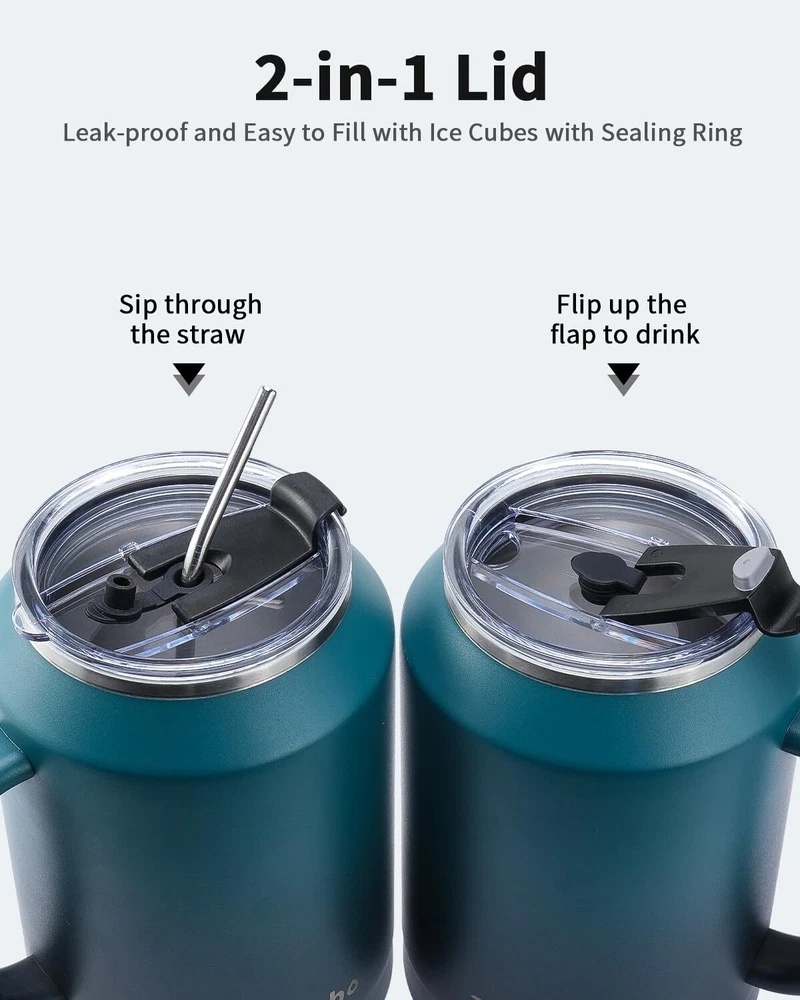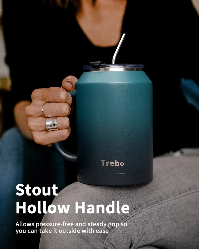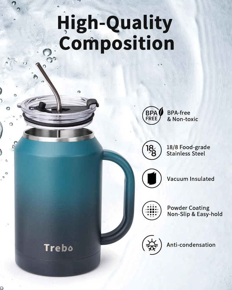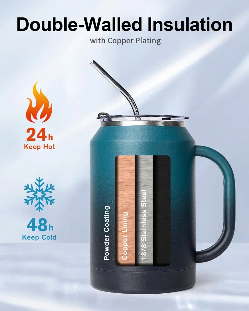 BPA-Free & Vacuum Insulated: The insulated cup with handle is made of 18/8 food-grade stainless steel that's BPA-free and non-toxic. The double-wall stainless steel makes good insulation that keeps water cold for 36 hours and hot for 24 hours. Pressure-free Handle & 2-in-1 Lid: The stainless steel handle features curved-edge design for comfortable grip.Gradient skin makes the coffee mug tumbler eye-catching. The multifunctional lid allows you to sip, drink, and swig. Large Capacity & Wide Mouth: Keep hydrated all day long and enjoy less refill with super 32/50 ounces large travel mug tumbler.The wide mouth is easy to fill ice cubes and clean.With this water bottle, your drinking experience goes better. Perfect for Everyday Life: The bottom is thickening treated to make the water jug flask more stable and durable.Powder coating offers a steady grip without slipping from sweaty palms.The stainless steel cup with lid and straw is perfect for home,work,travel,garden,camping. Professional Support: Includes 2 lids, 2 straws, and 2 straw brushes. Our friendly customer care is always happy to help.