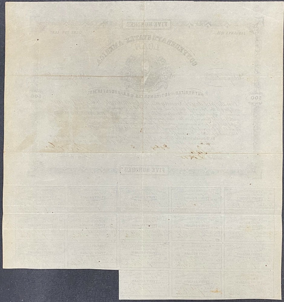 $500 Confederate States Coupon Bond – Criswell 62, Ball 77 Offered for your consideration is a $500 coupon bond issued by the Confederate States of America under the Act of August 19, 1861. It was catalogued by the late Grover Criswell as Cr. 62 and by the late Dr. Douglas Ball as B. 77. The central vignette features a portrait of John Henninger Reagan, a pre-war United States representative, as well as the Confederate Postmaster General, presented in an oval frame and surrounded by an ornate floral design. Immediately above, printed in an arc, is “CONFEDERATE STATES OF AMERICA LOAN” , with the maturation date and the interest rate at the upper left and right, respectively. Below the vignette, printed in a lovely italic scrip, is a lengthy financial obligation which states (in part) that “ On the first day of January, 1873, The Confederate States of America will pay to the Bearer of this Bond … the sum of FIVE HUNDRED DOLLARS with Interest thereon … at the rate of Eight per Cent. per annum … ”. This is followed by a statement that “… This debt is authorized by an Act of Congress, approved August 19, 1861, entitled ‘An Act to authorize the issue of Treasury Notes, and to provide a War Tax for their redemption …’” . It further states that, “… the Register of the Treasury, in pursuance of the said Act of Congress, hath hereunto set his hand and affixed the seal of the Treasury at RICHMOND, this 3 day of Feby 186 3 …” , with the signature of the register, “Ro. Tyler” , appearing at the lower right. A decorative, rectangular border, with the denomination repeated at the top and bottom, as well as on each side, encloses all of the foregoing elements, neatly separating them from the remaining eighteen interest coupons. Each of these coupons is valued at “TWENTY DOLLARS” and hand-signed by “N Giles” , an employee of the Confederate Treasury. This bond was printed by “B. DUNCAN COLUMBIA. S.C.” , as evidenced by their imprint at the lower center. In common with most government bonds of this era, the reverse of this piece is blank. Confederate fiscal records indicate that 1,338 bonds of this type were originally issued, though how many have survived the intervening 150+ years is unknown. A great bond to frame with a piece of Confederate currency for display in a den or office. Robert Tyler was the son of John Tyler, the 10 th President of the United States, and served as the register of the Confederate Treasury from August 13, 1861 until the close of the war. He received his position mainly through the influence of his father and not due to any special abilities of his own. It is interesting to note that during his father’s administration, Robert spent a great deal of time in the White House, and his wife served for some time as the official hostess. This piece exhibits light toning across the entire surface, imparting to the document an off-white to beige hue, somewhat darker at the top corners and along the edges (these can be hidden if the bond is matted for framing). Numerous light stains are scattered throughout the design, somewhat more visible on the blank back. The contrast is average for the issue, with the manuscript additions being sharp and fully legible. Due the acidic nature of the period ink, minor erosion is present when the bond is viewed from the back. The Criswell number, “62” , appears in pencil at the upper right, as well as a price “ 140 - ” (the practice of writing the catalogue number and price on bonds and currency was commonplace for years, though it is currently frowned upon and generally not done). In common with virtually all documents of this type, numerous horizontal and vertical folds are present (these folds occurred when the bonds were placed in safes or the cubbyholes of desks), with wrinkles noted at the edges (possibly from being wet in the past). The margins are wider than frequently seen, though the bottom is slightly irregular. Measuring approximately 13¾ x 14½ inches, this bond, due to the floral design around the portrait, is very popular with framers. An attractive and historic memento of that turbulent period in American history. There will be free shipping on this item. If you have any questions concerning this item, please ask before purchasing. Buy or Bid with Confidence – American Coins & Collectibles President Richie Self has worked 6 years as a paper money grader/authenticator. He has contributed to numerous reference books within the industry, as well as being a co-author of “The Comprehensive Catalog and History of Confederate Bonds, 2 nd Edition” with Douglas B. Ball, Ph.D., Henry F. Simmons, M.D., Ph.D. and James R. Desabaye. Mr. Self is a life member of the American Numismatic Association, the Society of Paper Money Collectors, as well as numerous regional numismatic associations. He is an authorized submitter to NGC, PCGS, and PMG, a diamond founding member of Coin Dealers Helping Coin Dealers and a supporter of the Industry Council for Tangible Assets. American Coins and Collectibles can be found at many of the state and local coin shows. American Coins and Collectibles Shreveport, LA