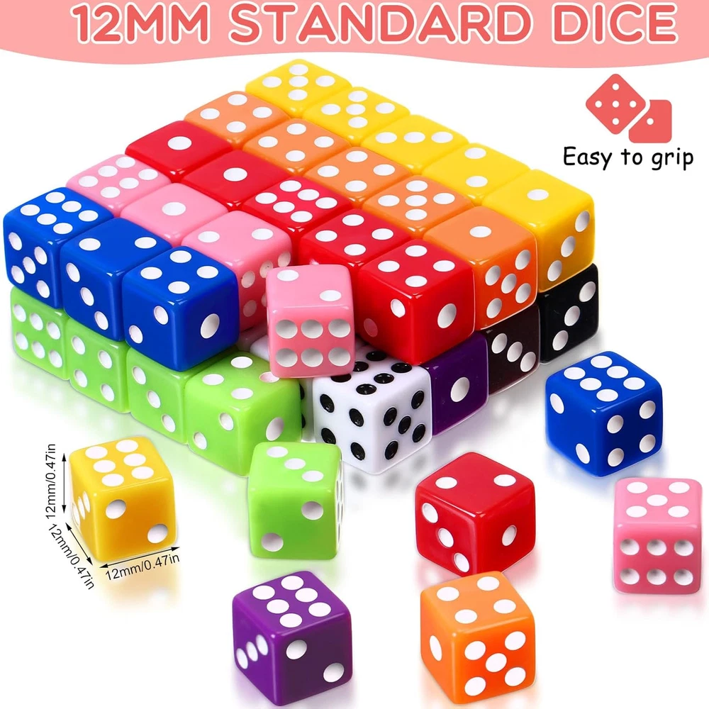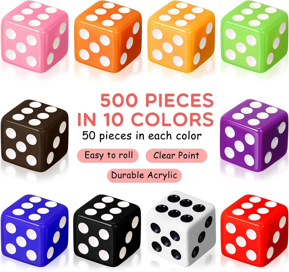 Package Include: you will receive 500 pieces of bulk dice and 5 pieces of black drawstring pouches; Each colored dice has 10 different colors with 50 pieces per color; The carrying bag not only ensures easy portability but also ensures convenient storage Size: these 0.47inch ( 12mm) colorful dice have square borders and are simple to roll; Suitable for board games, family dice games, or math instruction Quality Material: these dice set, made of durable acrylic, could keep for a long time with no fading, wear, scratches, or stench; The dice pips are clear and easy to read Vivid Colors: the multi colored dice will meet your varied needs and preferences, offering a delightful visual experience and upgrading your gaming experience; These vibrant dice set can be a choice for the dice game or any other game demanding distinct colors Multipurpose Utility: these colorful dice are not just limited to playing dice games like Liar's Dice, Yathzee, Farkle, casino; They're also suitable for teaching mental math skills to kids in the classroom; It's also a better stack toys for kids to build their own shapes Features: The vibrant color and reliable quality make the dices suitable gift choices for you to share with your classmates, friends, or colleagues to let them enjoy the convenience of our products. Measuring at approx. 12 mm, the colorful dice is easy for you to carry without taking too much space. Specifications: Material: acrylic Color: as pictures shown Size: approx. 12 mm Package includes: 500 x Dices 5 x Drawstring pouches Notes: Manual measurement, please allow slight errors on size. The color may exist a slight difference due to different screen displays.