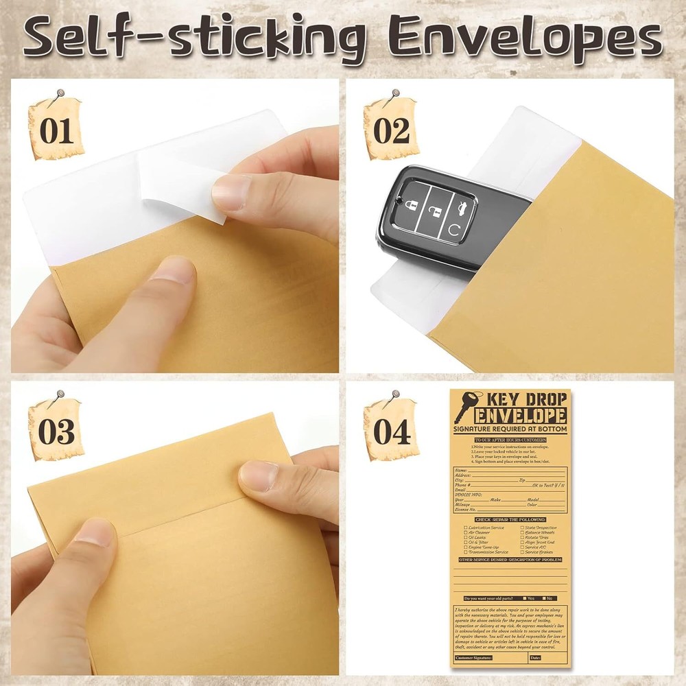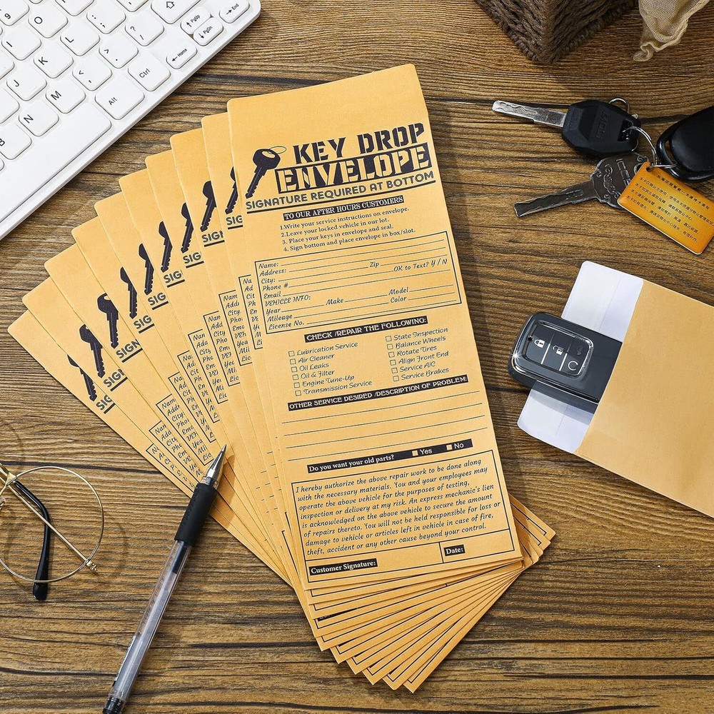 These drop key envelopes are a lifesaver for auto shops and mechanics! The 500-piece pack is more than enough for daily use, and the sturdy kraft material holds up well. The self-adhesive backing makes sealing quick and hassle-free—no extra tape needed. Perfect for organizing keys, receipts, or small parts. Great value for the quantity and quality!