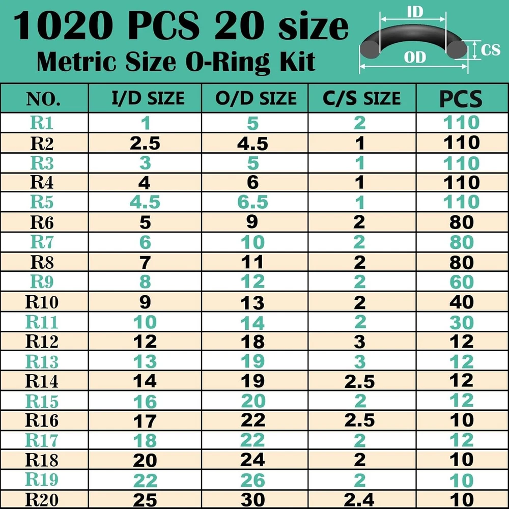 BRAND NEW 1020 Pcs Multiple Sizes:o-ring assortment kit contains standard 20 metric rubber o-rings, o-rings with inner diameters from 1 to 25mm and thicknesses of 1mm, 2mm, 2.4mm, 2.5mm, 3mm, which can meet almost all of your needs High quality material: O-ring bushings are made of commercial grade NBR material with a working temperature range of -40℉/-40℃ to 248℉/120℃. With excellent resistance to high and low temperatures, it is very suitable for thermal machinery, automotive, and faucet pipe sealing repair Wide applications: O-ring classification is very suitable for faucets, high-pressure washers, motorcycles, boats, car engines, pumps, solenoid valves, meters, sensors, mechanical bearings, pressure pipes and other accessories for sealing DIY repairs Easy to use and store: Various o-ring kits, 20 sizes of o-rings are placed in order in a sturdy plastic storage box, each size comes with a detailed label paper, very easy to use, o-rings are stored in order of size, easy to retrieve and store Quality service: XBVV always provides excellent customer service so you can buy with confidence. If you have any questions about Metric O-Ring Kits, please let us know and we will be happy to assist you 500 Pcs Wide Range of Applications: This O-ring assortment kit is ideal for use in faucets, plumbing, pressure washers, hose nozzles, sinks, filters, and automotive engines.It's good for sealing and repairing mechanical bearings, pumps, boats, oil and gas control valves, spray systems, air conditioners, kitchens, bathrooms, and more.Whatever your industrial project, this kit offers reliable sealing solutions for multiple uses. Assortment of Sizes: The kit includes 500 rubber O-rings in 20 different sizes, ensuring you always have the right fit for your projects. These O-rings are essential for various sealing tasks, making it a must-have for both professionals enthusiasts.With multiple size options, you’ll be able to tackle a wide range of repairs and installations efficiently. Premium Quality Rubber O-Rings: Made from high-grade Nitrile Butadiene Rubber (NBR), these O-rings are highly durable and resistant to wear, deformation, corrosion, and extreme temperatures ranging from -40°F to 248°F (-40°C to 120°C).Whether you're dealing with hot or cold environments, the O-rings maintain flexibility and effectiveness, making them for demanding industrial applications. Convenient Classification: Each O-ring is stored in a sturdy plastic case with individual compartments, clearly labeled for easy identification and retrieval. The detailed size chart helps you find the exact O-ring quickly, saving you time and effort during installation or repair work.It's a convenient solution for keeping all your O-rings in order and ready for use. Use in Plumbing and Machinery: Designed for high-performance sealing, these rubber washers and O-rings are ideal for use in plumbing, hydraulic systems, and mechanical equipment.They provide excellent sealing in faucets, engines, pumps, and pressure washer hoses, ensuring a tight and reliable seal to prevent leaks.Suitable for various industries, from home repairs to heavy duty industrial work.