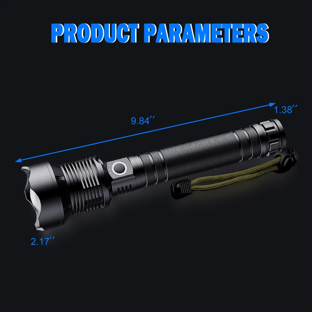 With an astonishing 5000 lumens, this flashlight is incredibly bright, capable of illuminating even the darkest corners of your home, campsite, or tactical environment. Designed with a rechargeable battery, this flashlight not only saves you money by eliminating the need for constant battery replacements, but it's also eco-friendly. Simply charge it up and you're ready to go, no matter where your adventures take you. 3 Lighting Modes: With 3 different lighting modes, you can customize the brightness to suit your needs, whether it's for camping, home use, or tactical purposes. High Lumens: Boasting 5000 lumens, this flashlight is incredibly bright, illuminating even the darkest areas. Heavy-Duty Design: Built to last, this flashlight can withstand tough conditions and is perfect for a variety of uses. Adjustable Focus: Easily adjust the focus to zoom in or out, making it versatile for different situations.