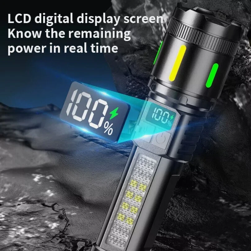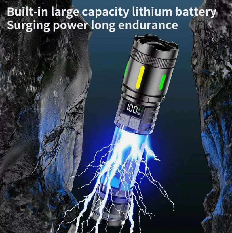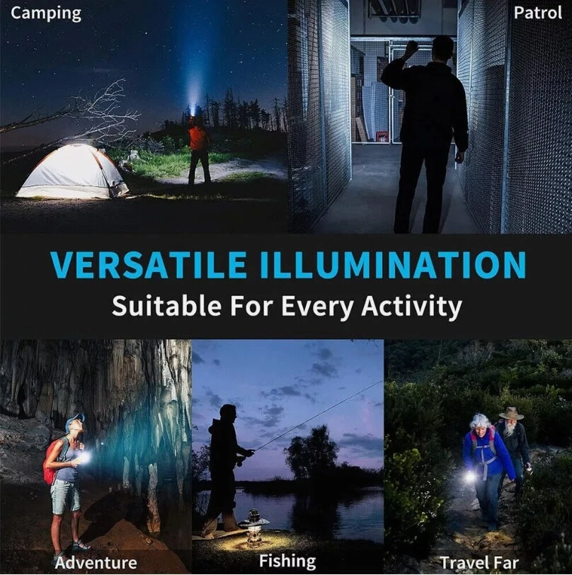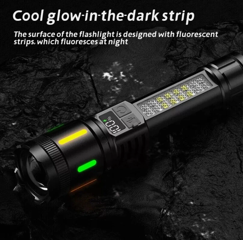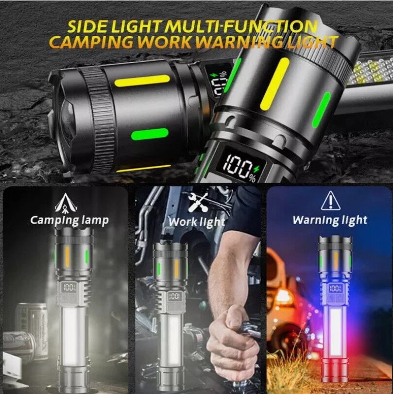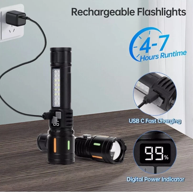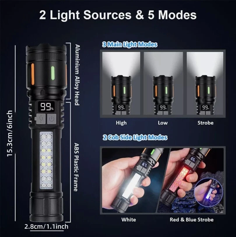 Description : Super Bright Rechargeable Flashlight: Equipped with upgraded efficient laser Chip LED chips, the rechargeable flashlight emits a stable and super bright lighting. Since the light penetration is stronger than other same-level lamp beads', its beam can pass through dust and fog well, especially suitable for foggy and rainy days with low visibility. 5 Light Modes & Zoomable Focus: There are 5 modes of the rechargeable flashlight: High / Low / Strobe for the main light, and White / Red&Blue Strobe for the COB side light. Equipped with zoomable head, the small rechargeable flashlight high lumens can emit a powerful focused lighting and an extensive extended lighting by adjusting the light head. Fast Charging & Power Indicator: Built-in a rechargeable lithium-ion battery and equipped with more energy-efficient chips, the rechargeable flashlight battery powered working time is up to 7 hours with the low mode. The USB C fast charging input achieves 30% reduction in charging time. It can be charged by power bank, USB plug, etc, with the USB C charging cable. You can clearly see the remaining power at the digital power indicator. IPX6 Waterproof: This flashlight head adopts the high grade black aluminium alloy, and the frame adopts the ABS plastic. The waterproof grade of this flash light reaches IPX6 Waterproof. This rechargeable flashlight is non-slip, shockproof, waterproof, rainproof, dustproof. It can work well in severe outdoor weather conditions, such as rain and snow. It is an ideal outdoor handheld flashlight for working, hiking, camping, repairing, hunting, and Sogidon fishing. Easy to Carry: Led flashlight is equipped with lanyard and pocket clip, which can be hung on your wrist or attach to your pocket , backpack shoulder strap, hat and belt. As its compact design, you carry this small handheld flashlight in your pocket or the car glove compartment. Specification : Product Type: Flashlight Color: Black Weight: 180g Waterproof: IPX6 Working Time: 4-7hrs Charging Time: 3.5-5hrs Material: Aluminum, Plastic Battery Capacity: 3000mAh Power Source: ‎ Battery Powered Charging Method: Type-C Charging Size: 15.3*3.5*2.8cm / 6.02*1.38*1.1inch Lighting Mode: 5 Modes(High / Low / Strobe for the main light; White / Red&Blue Strobe for the COB Side Light) Package Included: 1 x Flashlight 1 x USB Cable Note: Due to the different monitor and light effect, the actual color of the item might be slightly different from the color showed on the pictures. Thank you! Please allow 1-2cm measuring deviation due to manual measurement.