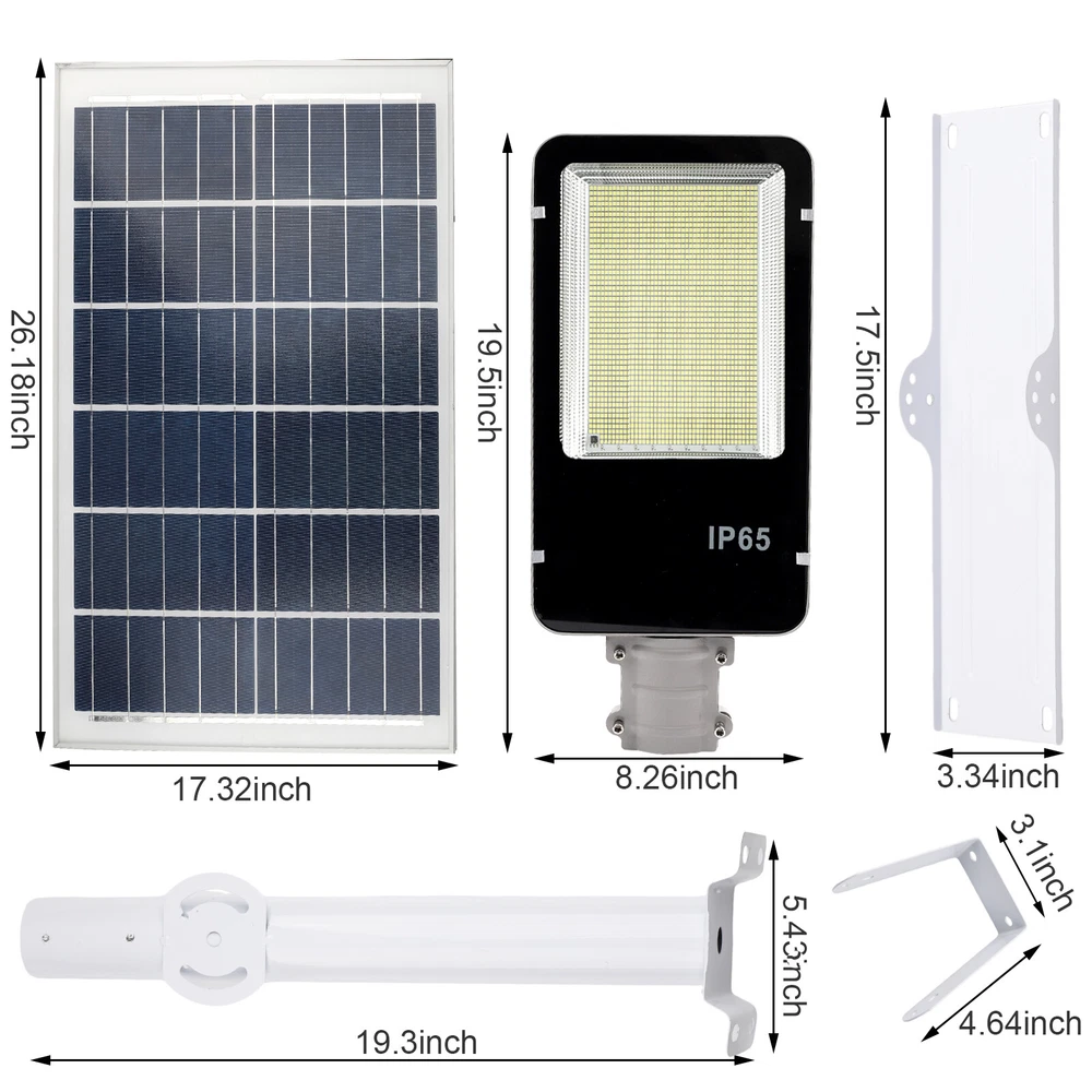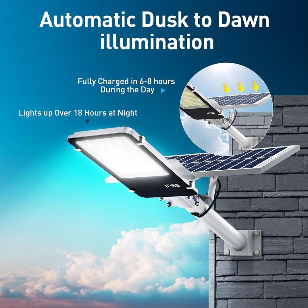 Please note that the LED beads of 2000W is 1845 LED. And the 5000W solar street light has 2014 LED beads. [Exceptional Energy Efficiency,NO ELECTRICITY BILL]: The solar panel of this solar street light has a photovoltaic conversion rate of up to 21%, ensuring you get the most out of every ray of sunshine.Save on your electric bill.Rechargeable even in rainy days. [Full LED Lighting Panel]: The entire panel is covered with 2014 high-performance LED beads,Low light decay.The overall brightness is 80% brighter than ordinary solar street lights outdoor,and the light has a range of up to 2192sq.ft.Can be used in backyard, parking lot, parking garage, patio, etc. [Extended Illumination Time]: Outdoor solar light is equipped with a 120,000mAh high-capacity battery.Charge your lights for just 6-8 hours and enjoy a generous 16-20 hours of continuous, energy-efficient lighting, perfect for long evenings and overnight use. [Weather-Resistant Reliability]: Outdoor split solar street light upgraded die-cast aluminum and tempered glass panel material.IP67 waterproof design ensures that your lights will shine brightly, regardless of the weather conditions, making them a reliable choice for outdoor use. [Remote Control and Dusk-to-Dawn Mode]: The Solar led street light comes with a convenient remote control, allowing you to adjust between 9 different brightness levels effortlessly. It also features a dusk-to-dawn mode with intelligent sensing, automatically turning on at dusk and off at dawn. [Wall Mount + Pole Mount]: Led solar street light comes complete with all the necessary hardware tools for installation (excluding the pole) and a comprehensive installation guide. We can easily mount it on a wall, post, tree or any outdoor structure. No matter your choice of installation, we will quickly enjoy efficient outdoor lighting. [WORRY-FREE WARRANTY]: provides 2 years after-sales warranty. Please feel free to contact us if you have any questions and we will reply to you within 24 hours.