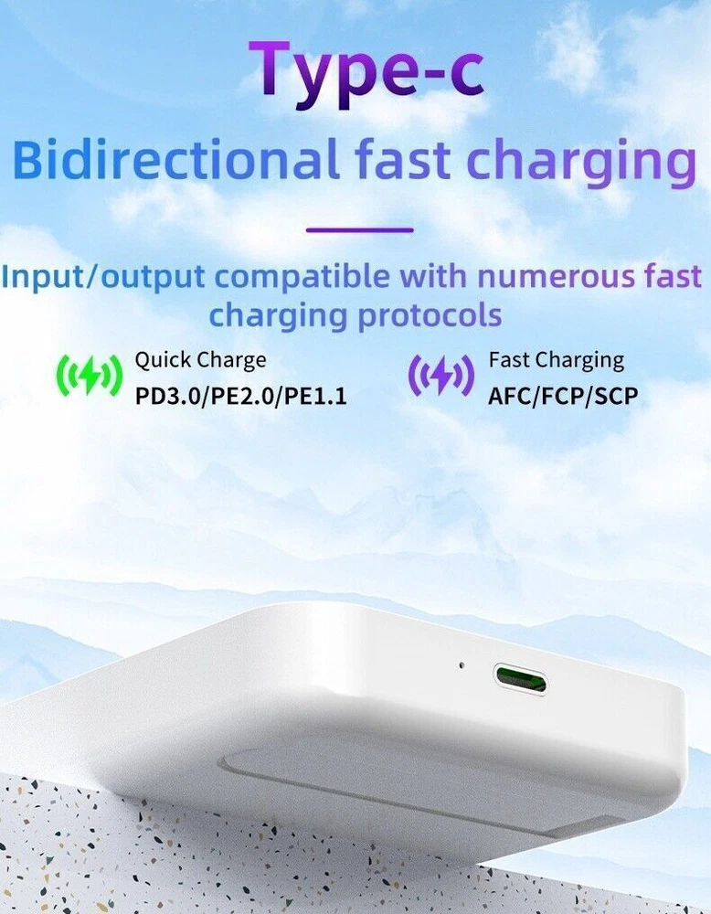 Magnetic Power Bank Battery Pack Fast Charger For iPhone 15/14/13/12 Description: 【Strong magnetic suction function】 Only for Wireless/magnetic Charging. 【The convenient way to charge】 Just attach this compatible battery pack to your iPhone 15/14/13/12 Series for magnetic wireless charging. No more alignment problems, the built-in magnets keep the magnetic power bank in place and prevent slipping. 【Perfectly designed for iPhone 15/14/13/12 Series】 Works flawlessly with iPhone 15/14/13/12 Series and the case with magnetic. This power bank does not overlap the camera and has no overhanging. 【Charge in a Snap】 The power bank detects and automatically charges your phone without the press of a power button, and strong magnets securely hold your phone in place. so there's no need to turn it on or off. Note: We recommend charging with a magnetic phone case or without cases to get enough suction. 【Reminder】 The battery pack is only applicable to iphone12/iphone13/iphone14 series /iphone15 series phones. It is recommended to use it more firmly without a phone case or with a magnetic phone case Note : Recommended to use with a 20W USB-C Power Adapter and USB-C Cable (for iphone)(NOT INCLUDED). Compatibility: For iPhone 15 Series For iPhone 14 Series For iPhone 13 Series For iPhone 12 Series