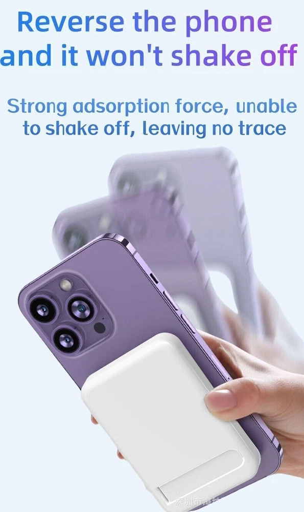 Magnetic Power Bank Battery Pack Fast Charger For iPhone 15/14/13/12 Description: 【Strong magnetic suction function】 Only for Wireless/magnetic Charging. 【The convenient way to charge】 Just attach this compatible battery pack to your iPhone 15/14/13/12 Series for magnetic wireless charging. No more alignment problems, the built-in magnets keep the magnetic power bank in place and prevent slipping. 【Perfectly designed for iPhone 15/14/13/12 Series】 Works flawlessly with iPhone 15/14/13/12 Series and the case with magnetic. This power bank does not overlap the camera and has no overhanging. 【Charge in a Snap】 The power bank detects and automatically charges your phone without the press of a power button, and strong magnets securely hold your phone in place. so there's no need to turn it on or off. Note: We recommend charging with a magnetic phone case or without cases to get enough suction. 【Reminder】 The battery pack is only applicable to iphone12/iphone13/iphone14 series /iphone15 series phones. It is recommended to use it more firmly without a phone case or with a magnetic phone case Note : Recommended to use with a 20W USB-C Power Adapter and USB-C Cable (for iphone)(NOT INCLUDED). Compatibility: For iPhone 15 Series For iPhone 14 Series For iPhone 13 Series For iPhone 12 Series