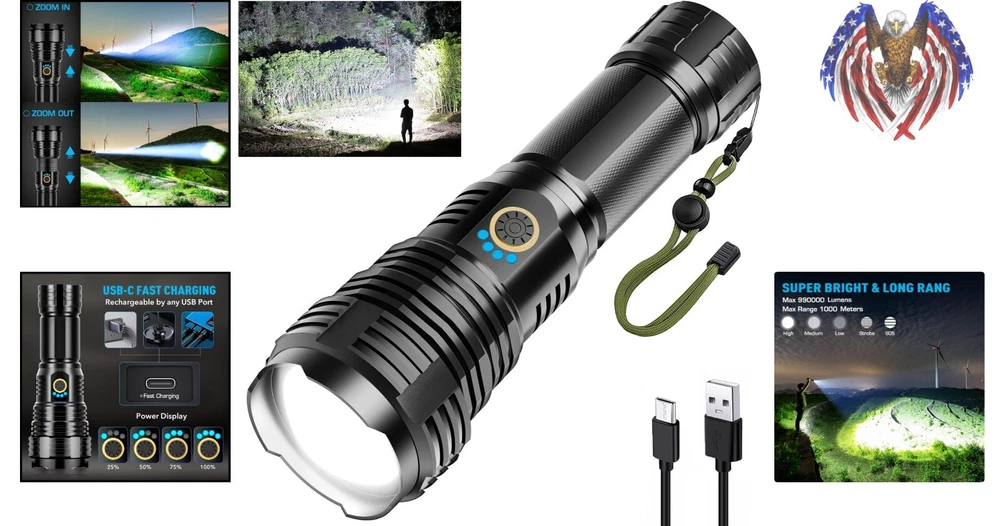Item Weight: 12.3 ounces White Brightness: 900000 Lumens Type: Flashlight Light Path Distance: 3280 Feet Battery Description: Lithium-ion Brand: Unbranded Voltage: Rechargeable Flashlight Light Direction: Adjustable Number of Lights: 1-3 Runtime: 24 Hours Batteries Included?: Yes Number of Batteries: 1 Lithium Polymer Batteries Required. (included) Water Resistance Level: Waterproof Style: Rechargeable Led Tactical Flashlight Recommended Uses For Product: Outdoor Activities And Emergencies Operating Range: 1000 m Light Source Type: Led Battery Technology: Lithium ion Item Package Quantity: 1 Item Height: Rechargeable Flashlight UPC: Does Not Apply Personalize: No Lumens: 990000 Features: Rechargeable, Waterproof, Batteries Included, Zoomable, Handheld, Fast Charging, Portable, Shockproof, Durable, Dustproof, Weatherproof, Telescopic Zoom, Power Display Power Source: Battery Color: Black Batteries Required?: No gtin13: Does Not Apply Batteries: 1 Lithium Polymer Batteries Required. (included) Brightness: 990000 Lumen Battery Cell Composition: Lithium Ion Operating Time: More Than 10 Hours IP Rating: IPX7 Lighting Technology: LED Item Length: Rechargeable Flashlight Material: Aluminum Product Dimensions: 7"d X 3"w X 5"h Number of LEDs: 1