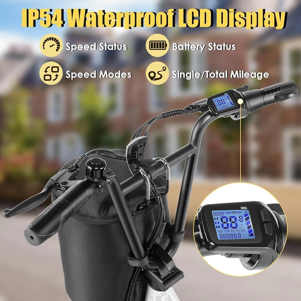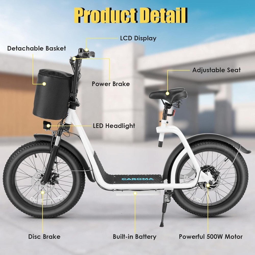 Product Description About this item 【20"X3" Fat Tire】Puncture-proof 20"*3" oversized fat tires can provide superior grip, stability and comfort on various terrains. Whether on sand, mountain roads, snowy roads or various terrains, Caroma electric scooters can bring you a comfortable riding experience. 【Upgraded Brushless Hub Motor】The upgraded 500W(Peak 819W) brushless hub motor has stronger climbing ability. In pure electric mode, it can reach speeds of up to 20MPH(32KM/H) and easily conquer slopes of up to 15 degrees. For all your riding needs. 【Long-lasting Battery Life】High-capacity lithium battery (48V/10.4Ah) certified by UL 2272, which can travel up to 30 miles (48KM) per full charge. Equipped with safe and reliable fast charging technology, it only takes 5-6 hours to fully charge, making it ideal for short trips, picnics, and shopping. 【Off-road Suspension System】The electric scooter is equipped with 2 front fork spring shock absorbers, 2 seat shock-absorbing springs and 2 puncture-resistant 20"X3" fat tires, which can effectively absorb ground impact while riding and provide better control. Combined with front and rear mechanical disc brakes and an EABS system, you can enjoy a comfortable ride and powerful braking, even on steep slopes, rough terrain, or other extreme terrain.