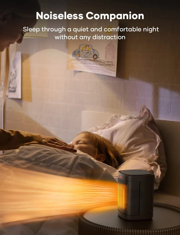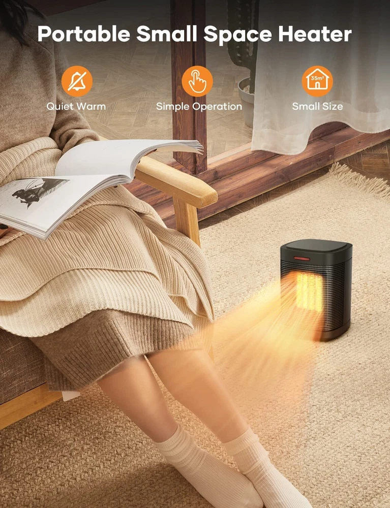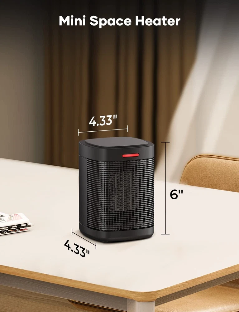 500W MINI HEATER: Reliable and sturdy, this heater provides continuous heat. It's best used for personal heating. It's small for localized close up, you can put this under, or on your desk. 500 watts of power to put out more heat with very low noise. Offering quiet operation and unique PTC ceramic heating elements. PORTABLE CONVENIENCE: Designed for ease of mobility, it fits almost anywhere. It features an impressively compact design and one-button operation. ON/OFF switch. Straight 500 watts. It's good for you if you are sitting in one spot, like snuggled up on a couch or chair watching a movie, or sitting at a desk in your office space. Getting your hands warm. CONVENIENT & SAFE FEATURES: Our space heaters have built-in safety overheating and tip-over protection, the heater will auto-turn off if accidentally tipped over or overheated. With its tip-over and auto shut-off overheating protection, you can sleep peacefully knowing you’ve got a heater with excellent safety features. The power indicator light lets you know when it's plugged in. SAFE AND HASSLE-FREE: Perfectly safe around children and pets, with no exposed heating elements that could cause a fire. ETL certification ensures the highest safety standards - tip-over and overheats shut-off protection. The heating device provides users with a safer and more comfortable operating experience. DEFEAT COLD IN 2S: Nothing beats a great basic, this sleek black heater is essential in any home, heating up quickly in just 2 seconds. Discover the ceramic desk heaters that can be placed on the floor or desktop. Makes a great addition to an office, bedroom, or any other enclosed area.