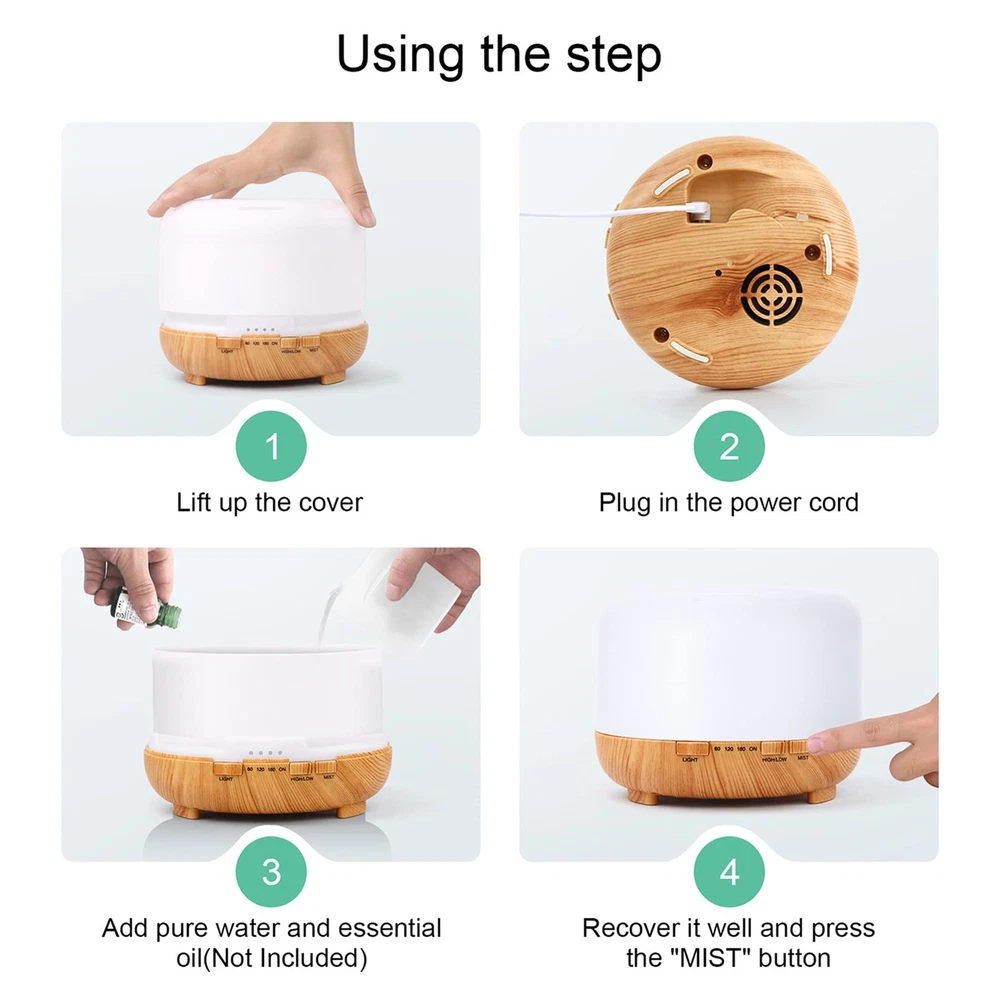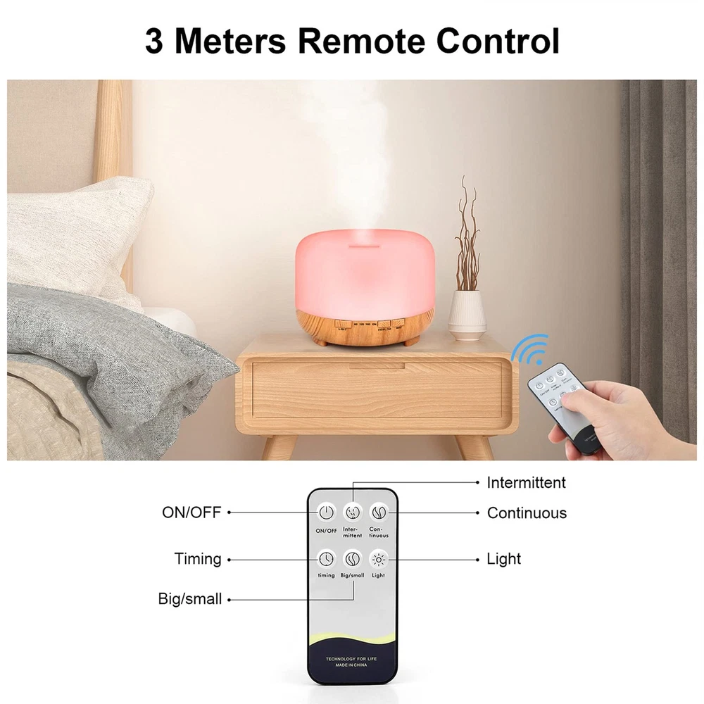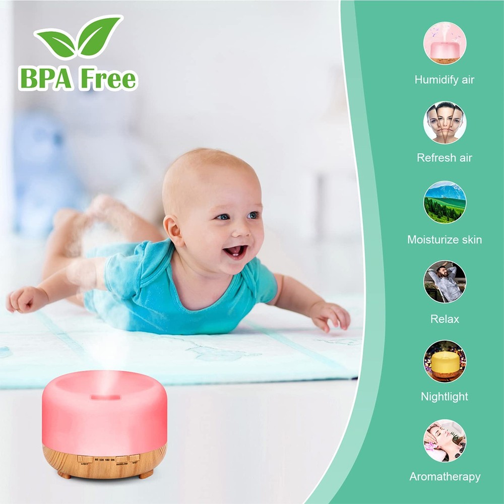 500ML ultrasonic diffusers: This essential oil diffuser for large room works up to 8 to 12 hours, 3 timers (30Min/ 120Min/ 180Min), and Steady On. Two justable cool mist mode. It's a aroma diffuser with remote control. Essential oils diffusers 7 colors changing lights: This electric aromatherapy mister has 7 colors LED lights, you can adjust any color you like (monochrome/continuous color switch). It can also be a night light diffuser for sleeping. Safety aromatherapy diffusers: The aromatherapy vaporizer is made of BPA-Free material. It's also a quiet aromatherapy machine, under 35 decibels, widely used in baby room, yoga and office. It's a safe and reliable air diffuser. Auto-off water diffuser: When this aroma diffuser runs out of water, it will stop working automatically. This is a reassuring essential oil diffuser. Humidifier and diffuser two in one: It can be used as a diffuser and add essential oils as an aromatherapy machine to experience aromatherapy, or as a humidifier to dry air. It can also be used as a night light and beautiful decoration, an ideal gift for friends.