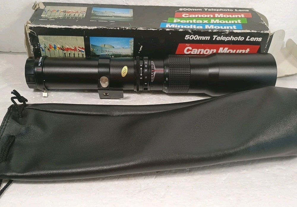 The Kimunor 500mm Telephoto Lens for Canon/Pentax/Minolta, made in Japan, offers high-quality optics and precision engineering for vintage movie and photography enthusiasts. With a brand name synonymous with top-notch equipment like Canon, this lens guarantees sharp images and reliable performance. Perfect for capturing detailed close-ups and long-distance shots, this lens is a valuable addition to any vintage camera collection.