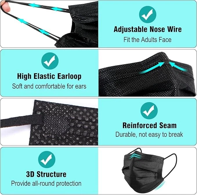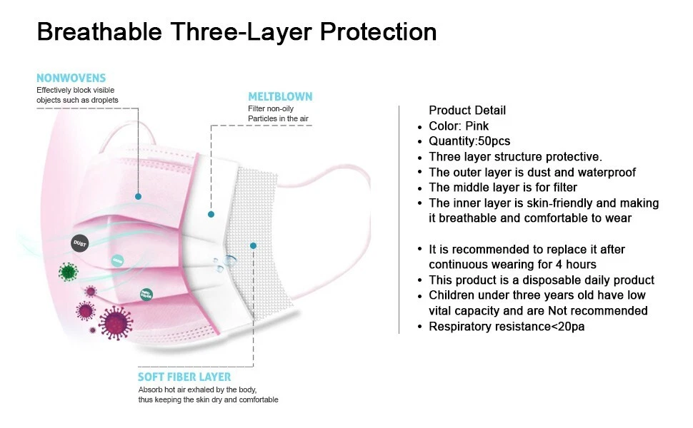 100% Nonwoven Imported Disposable Sanitary Face Mask 3-Layers of Non-Woven Fiber Fabric to Provide Fine Filtration and Maximum Breath-ability Comfortable to Wear for Hours and Maximize the Protection at the Same Time
