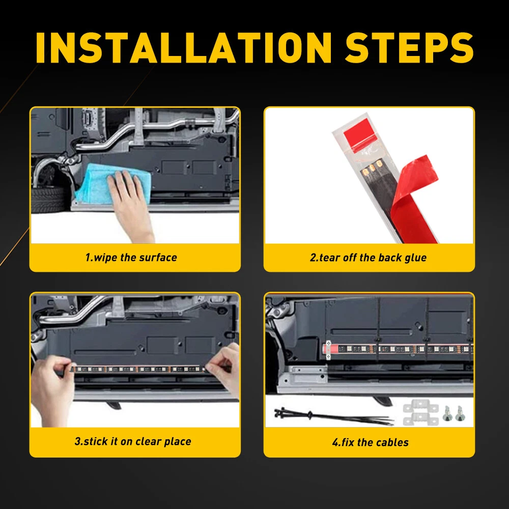 Suitable models: Universal, including cars, SUVs, JEEP, truck, etc Remote control: APP+ Remote control Product length: 90cm and 120cm (35.4inch and 47.2inch), split wire length: 170cm (66.9inch) LED type: 5050 SMD LED Quantity: 210PCS Connection mode: red wire to the positive pole, black wire to the negative pole Control range: 1-10 meters Color: red, green, blue, white, orange, yellow, blue, purple and other colors Waterproof grade: IP68 Service life: 50000+ hours Features: *Double control Model: APP + 24 key wireless remote control,easy to operate. Multiple Modes to choose for meeting all your needs(with music mode, DIY mode, multi-color mode, timing function). 5050 SMD RGB LED Strip Under Car Tube Underglow Underbody System Neon Light Kit Suitable models: Universal, including cars, SUVs, JEEP, truck, etc Remote control: APP+ Remote control Product length: 90cm and 120cm (35.4inch and 47.2inch), split wire length: 170cm (66.9inch) LED type: 5050 SMD LED Quantity: 210PCS Connection mode: red wire to the positive pole, black wire to the negative pole Control range: 1-10 meters Color: red, green, blue, white, orange, yellow, blue, purple and other colors Waterproof grade: IP68 Service life: 50000+ hours Features: *Double control Model: APP + 24 key wireless remote control,easy to operate. Multiple Modes to choose for meeting all your needs(with music mode, DIY mode, multi-color mode, timing function). *Brilliant brightless: High intensity SMD 5050 LED chip, lighting up the entire under car. *Wateproof design: High waterproof rating (IP68)with long service life. *Superior 3M tape: 3M tape is used for sticking and fixing firmly. *Heavy-duty construction: Silicone-injected tubing, both ends of the lamp body are well sealed, it will shine well whatever in rainy or snowy days. 2 Control Methods You can control the Car Underglow Lights by APP or Remote Control It is equipped with a remote control to switch on and off, change modes and colors. Scan the QR code to download APP (compatible with iPhone and Android), connect the Bluetooth device to set your own lighting effect. Packaging included: 4 x led strips 1 x mounting hardware set Item Specifics To Fit Indicator Superseded Part Number Car Tube Strip Underglow Body Neon Light Phone APP Control 5050 LED super bright Interchange Part Number Car Exterior LED RGB lamps for honda Civic 2000-2020 for Subaru Impreza Legacy 2000-2020 for Mitsubishi Lancer Evo for Nissan GT-R Light Color RGB Type Decoration Lights Bulb Fitment Code Universal Manufacturer Part Number 2820 Placement on Vehicle Front Rear Left Right Other Part Number App Control Under Glow Body Light Kit Brand Unbranded Fitment Type Performance/Custom Color Temperature Red Blue Green Yellow Number of Bulbs 4 strips/ 1 set Manufacturer Warranty 30 Day Voltage 12V Length 2 pieces 120CM and 2 pieces 90CM Lighting Technology LED Suitable For Underbody Light Features CANbus Compatible OE/OEM Part Number AUXITOLED Lumens 3000 lm Performance Part Yes Universal Fitment Yes Vintage Part Yes Bulb Life Hours Up to 30,000 Hours Payment 1. Instant PayPal payment is the preferred method of payment. We also accept payment via PayPal, DebitCard, Visa, MasterCard, Discover. 2. Before payment,Please keep the consistency of Paypal address and ebay address. 3. Quantity orders are welcome! Shipping 1. All items will be shipped in 24 hours after receiving your payment . 2. We ship this item to US only via USPS first class mail. It usually takes 3-6 working days to deliver. Returns 1. We offer free return & money back guarantee. If you are not satisfied with your purchase for any reasons, you can return the item for refund or replacement/exchange. All returns must include the original packaging. (Please refer to our return policy for details.) 2. If you don't return goods within 60 days from date of purchase, your right to cancel will be revoked. Any items damaged because of incorrect installation will not be refunded. Please contact us for return or troubleshooting help prior to returning any products. Contact Us 1. Negative feedback will not help resolve any problems you have, please contact us via eBay messages before leaving negative feedback, our customer service will make best effort to help you with the issues. 2. We maintain high standards of excellenceand strive for 100% customer satisfaction! Feedback is very important to us. We request that you contact us immediately Before you give us neutral or negative feedback, so that we can satisfactorily address your concerns. FAQ 1. Can you tell me when my order will be shipped? Actually we will ship the item within 1 business day after receiving orders. But USPS need to take longer time to update tracking info and arrange delivery during the challenging time for now. If your order was not shipped more than 3 business days, please contact us with your order number to get quick support. 2. My item has not arrived, what's taking so long? Sometimes items take longer than expected, especially if it's going far or to rural area. Check with your post office to see if your item has been held up. Sometimes USPS will not update a tracking number until it has arrived at its destination. If your item still has not arrived after a few days, let us know so we can double check for you and help solve it asap. 3. Do you ship to Canada, United Kingdom, Australia, etc.? Unfortunately, we could only ship to United States (Domestic shipment) at the moment. 4. I bought the wrong items/ the items were not compatible with my vehicle. Please contact us via ebay message to get quick support. DESCRIPTION PAYMENT SHIPPING RETURN POLICY CONTACT US Hot Item For 1996-2022 Toyota Sequoia 4Runner LED 24SMD License Plate Tag Light Lamp USD 13.99 2pcs Pigtail Female Wire Socket 3157 S Two Harness Universal Front Turn Signal USD 11.99 LED License Plate Light Assembly For Chevrolet 2018-2022 Equinox 15-20 Suburban USD 14.99 2pcs For Ford 2019-2021 Ranger EcoSport AUXITO LED License Plate Light 