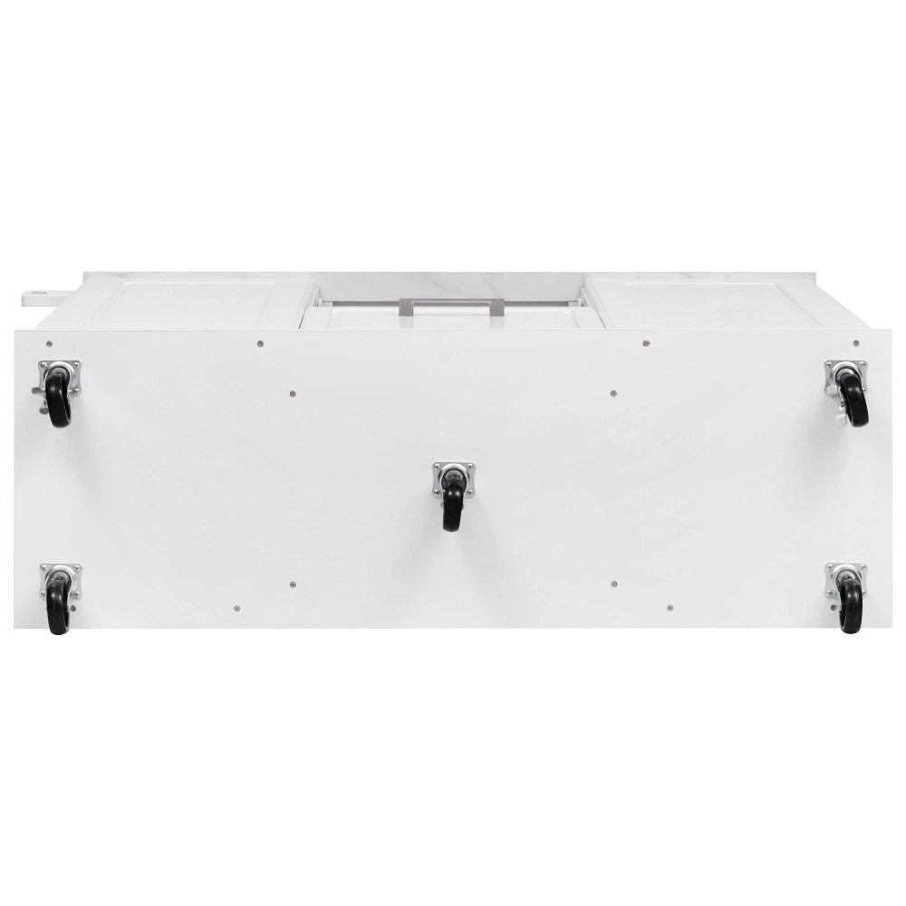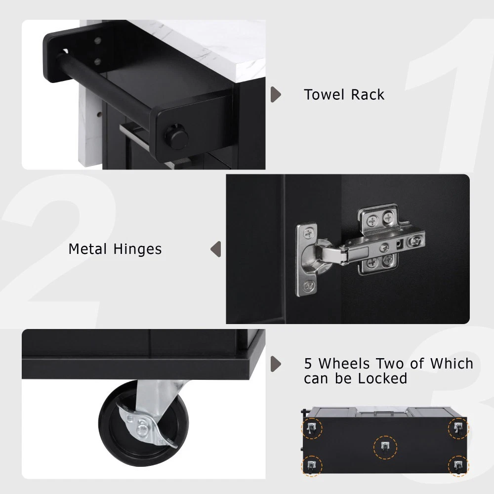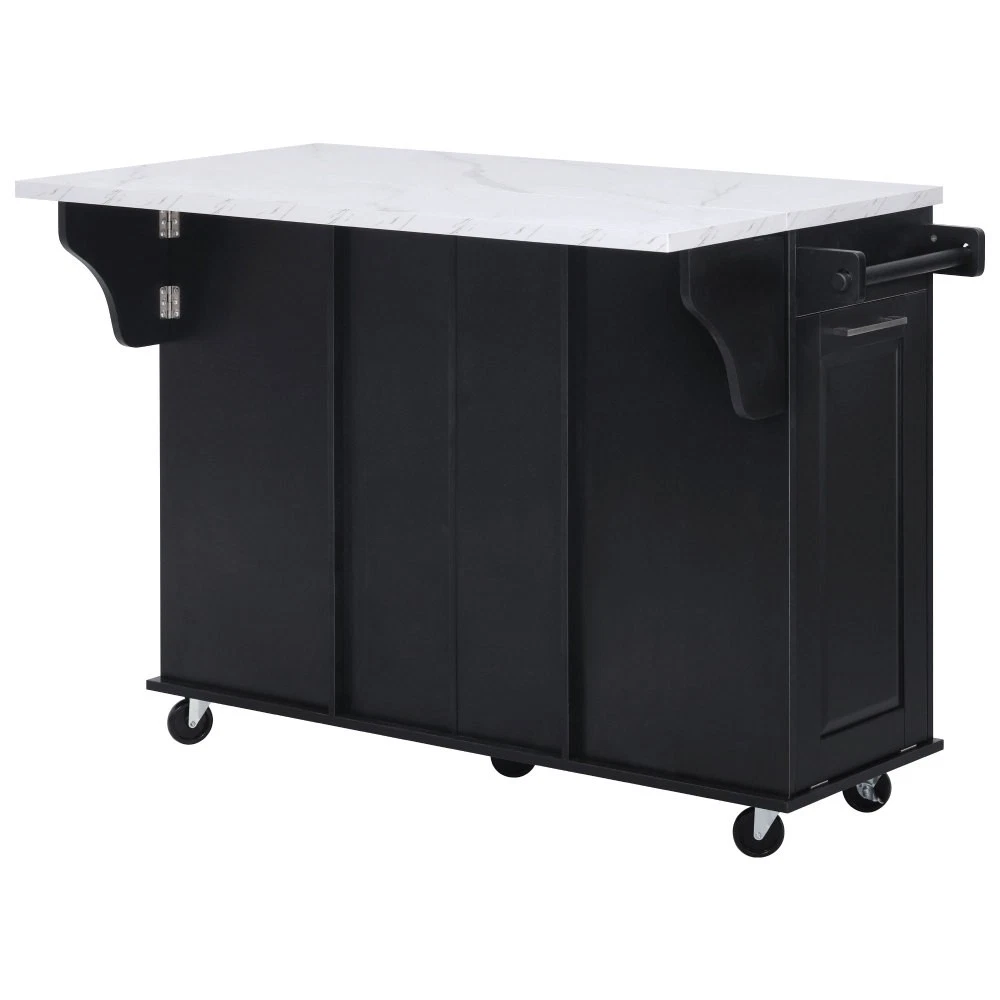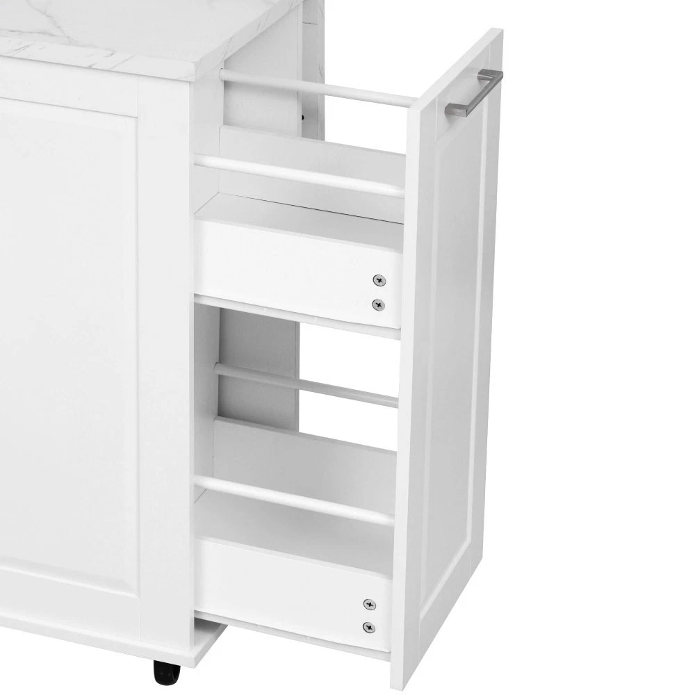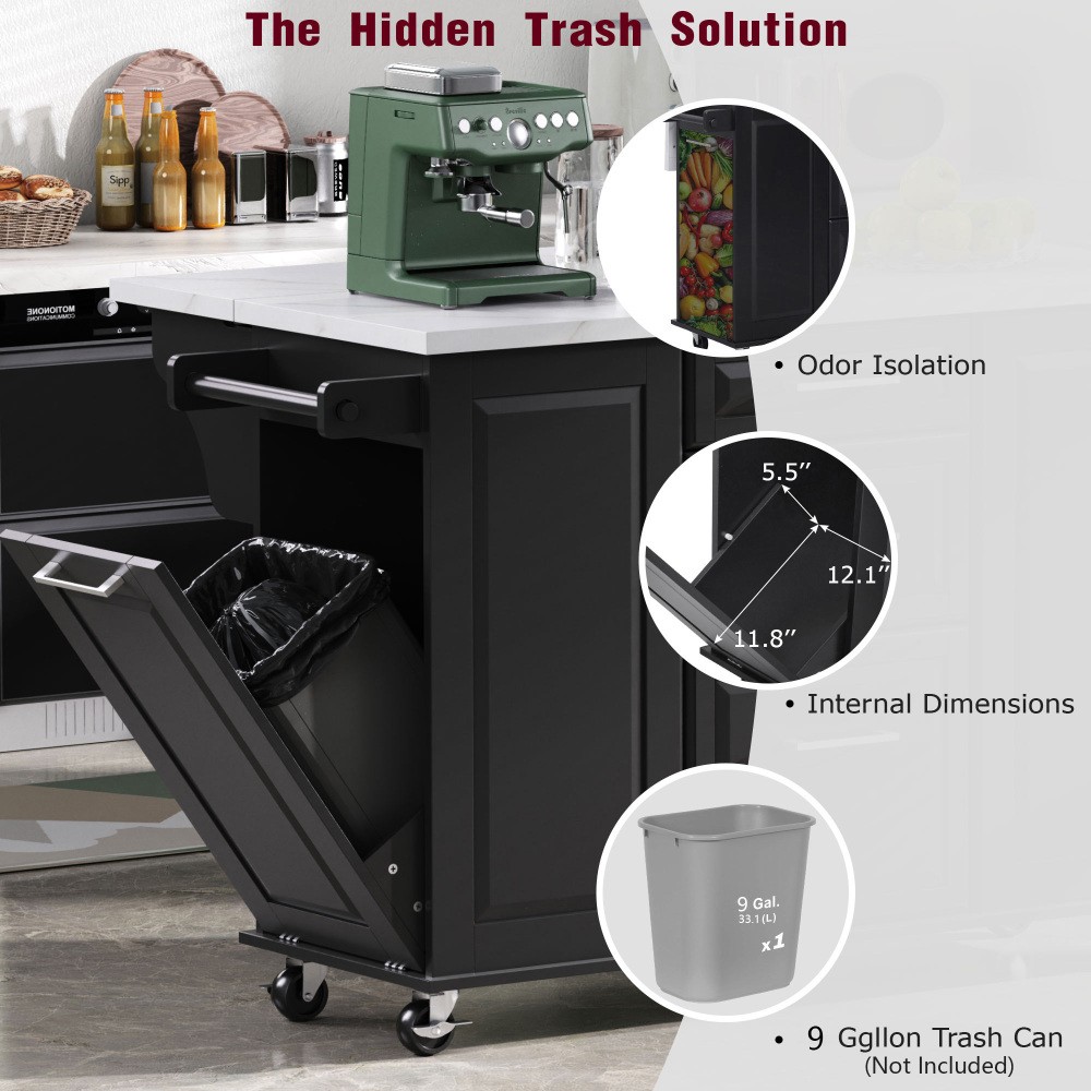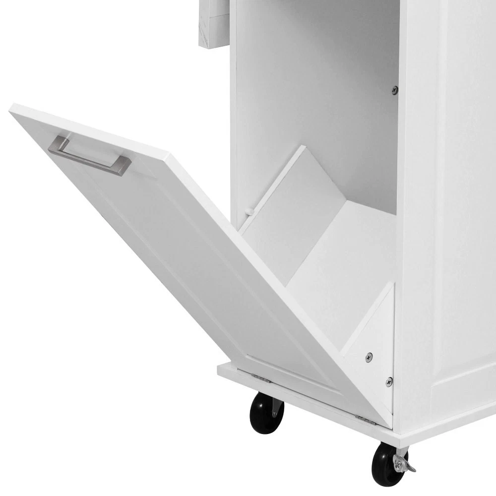 50.7" Kitchen Island with Storage Tilt Trash Can Cabinet and Pull Out Cabinet Features [Vintage Meets Fashion] Embrace the timeless appeal of traditional vintage design while incorporating modern fashion trends. Convex door and drawer panel design with white faux marble veined wood tabletop. It is sure to impress you in terms of aesthetics. [Concealed Tilt Trash Can Cabinet] Say farewell to unsightly garbage cans! The garbage bin storage cabinet is a fantastic addition to your kitchen island. It can accommodate a 9-gallon trash can (not included), effectively concealing the trash and keeping the kitchen looking tidy while also preventing pets from knocking over the bins. Additionally, it helps to block any unpleasant odors from escaping. [2 Tier Pull Out Cabinet Organizer] Our kitchen island comes with a convenient 2-tier pull-out cabinet organizer. Each tier of storage measures 11.4" x 13.3" x 3.9". The maximum pull-out length can be up to 10.2 inches. This can definitely meet your different placement needs and allow you to categorize items of different sizes. [Ample Storage Space] Measuring 50.7"W x 26.4"D x 35.4"H. In addition to the trash cabinet and double-tier storage shelves, this product is paired with 2 drawers and 1 storage cabinet for organizing dishes, cups and other items. The divider bars in the center drawer provide the flexibility to hold and separate kitchen items of different sizes. [Convenient Drop Leaf Design] The counter of this kitchen island is equipped with a foldable drop leaf. When you run out of scope, you can open it to get more operating space, so you can put more things on the counter and increase storage space. Of course, you can fold it when you don't need to use it, and leaning against a wall or corner is a good storage option. [Mobile Kitchen Island] Our mobile kitchen island on wheels has five movable universal wheels, four at the bottom four corners and one in the middle. In this way, you can move freely and ensure the stability of the movement. Two of the wheels are lockable so you can stop and secure them at any time. Greatly enhance your convenience when using indoors. [Sturdy and Secure] Our kitchen cart is built with CARB Phase II certified MDF. It has a robust structure and a 0.95” thick tabletop that can bear up to 400 lbs. We place a high value on your well-being and health. That's why we offer a durable, smooth, and scratch-resistant laminate finish tabletop. This tabletop can serve as both a cutting board and a stand for your microwave or roaster. The well-designed structure is made to endure the rigors of long-term use. [Buy with Confidence] This kitchen island with storage is accompanied by comprehensive step-by-step assembly instructions and labeled parts and hardware to ensure a seamless assembly process. Should you encounter any challenges during the assembly of this kitchen cart, please do not hesitate to reach out to us for assistance. Notice: 1.Real Product’s Color may be a little different from the image due to the lighting or monitor’s display. 2.Manual measurement has been used, there may be some reasonable error. Description Vintage Convex Door & Panel Design The vintage retro convex design never goes out of style. The smooth surface of the product harmoniously blends vintage elements, injecting personality and charm into your kitchen. Faux Marble Textured Wood Deskop Balancing sturdiness with beauty, it combines a marble-veined finish with a smooth wood tabletop. Maintaining the overall vintage flavor while incorporating a strong contemporary feel. Concealed Tilt Trash Can Cabinet Say farewell to unsightly garbage cans! The garbage bin storage cabinet is a fantastic addition to your kitchen island. It can accommodate a 9-gallon trash can (not included), effectively concealing the trash and keeping the kitchen looking tidy. 2 Tier Pull Out Cabinet Organizer Our kitchen island comes with a convenient 2-tier pull-out cabinet organizer. Each tier of storage measures 11.4" x 13.3" x 3.9". The maximum pull-out length can be up to 10.2 inches. This can definitely meet your different placement needs and allow you to categorize items of different sizes. SturdyTowel Rack The product has a solid towel rack on the side. It's perfect for holding your wet towels that you have nowhere else to put them. Of course it can also be used as a mobile pusher. So you won't be stuck pushing the island. Compartmentalized Storage Drawer Design The divider bars in the center drawer provide the flexibility to hold and separate kitchen items of different sizes. Large Drop Leaf Design A folding rolling kitchen island countertop can offer additional workspace and storage when needed, and can be effortlessly folded up to create more space. Soft Close Hinges The soft closing function is one of the best indicators of the quality of the hinges. The soft closing feature prevents all disturbing noises from the kitchen and extends the lifetime of the doors, cabinets, and hinges. Highlights&Summary Highlights [Tilt Trash Can Cabinet for 9 Gallon Trash Can] [Pull-Out Cabinet Organizer][2 Drawers and 1 Door] [Vintage Convex Door & Panel Design][Metal Handles & Metal Hinges] [Faux Marble Textured Wood Deskop][Drop Leaf Design] [Compartmentalized Storage Drawer Design] [Ample Storage Space][Towel Rack] [5* 360 Rotation Wheels with 2 Lockable Casters] [Eco-friendly manufactured P2 MDF Board] Summary The design of this kitchen island is sure to bring a different work experience to your kitchen area, skillfully combining practicality with style. The product is very sturdy, it's made of safe CARB phrase Ⅱ certified MDF boards. Equipped with a tilt trash can for a 9-gallon bin on its left side (trash can not included), and a double tier pull-out cabinet organizer on its right side. The top drawer holds utensils. The center drawer holds a variety of dishes and cups, and multiple divider bars inside allow you to separate different items. And of course there is a separate 