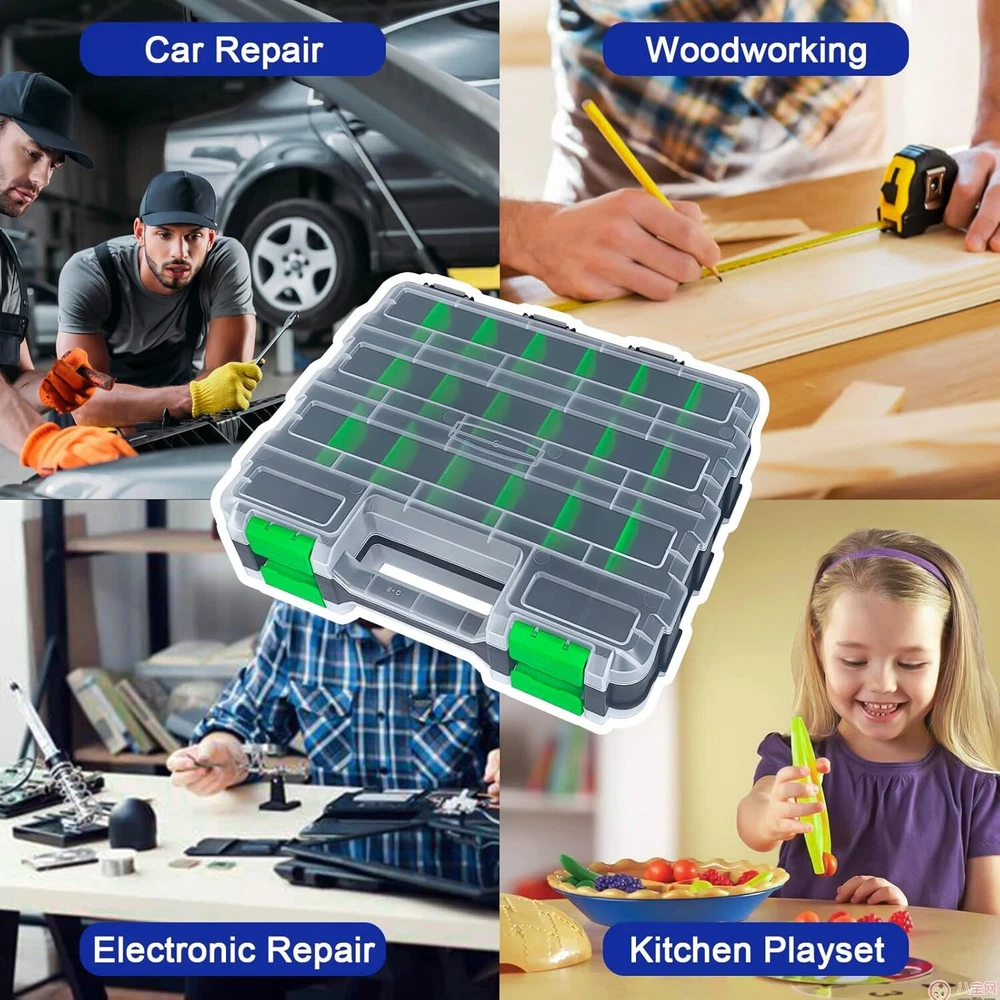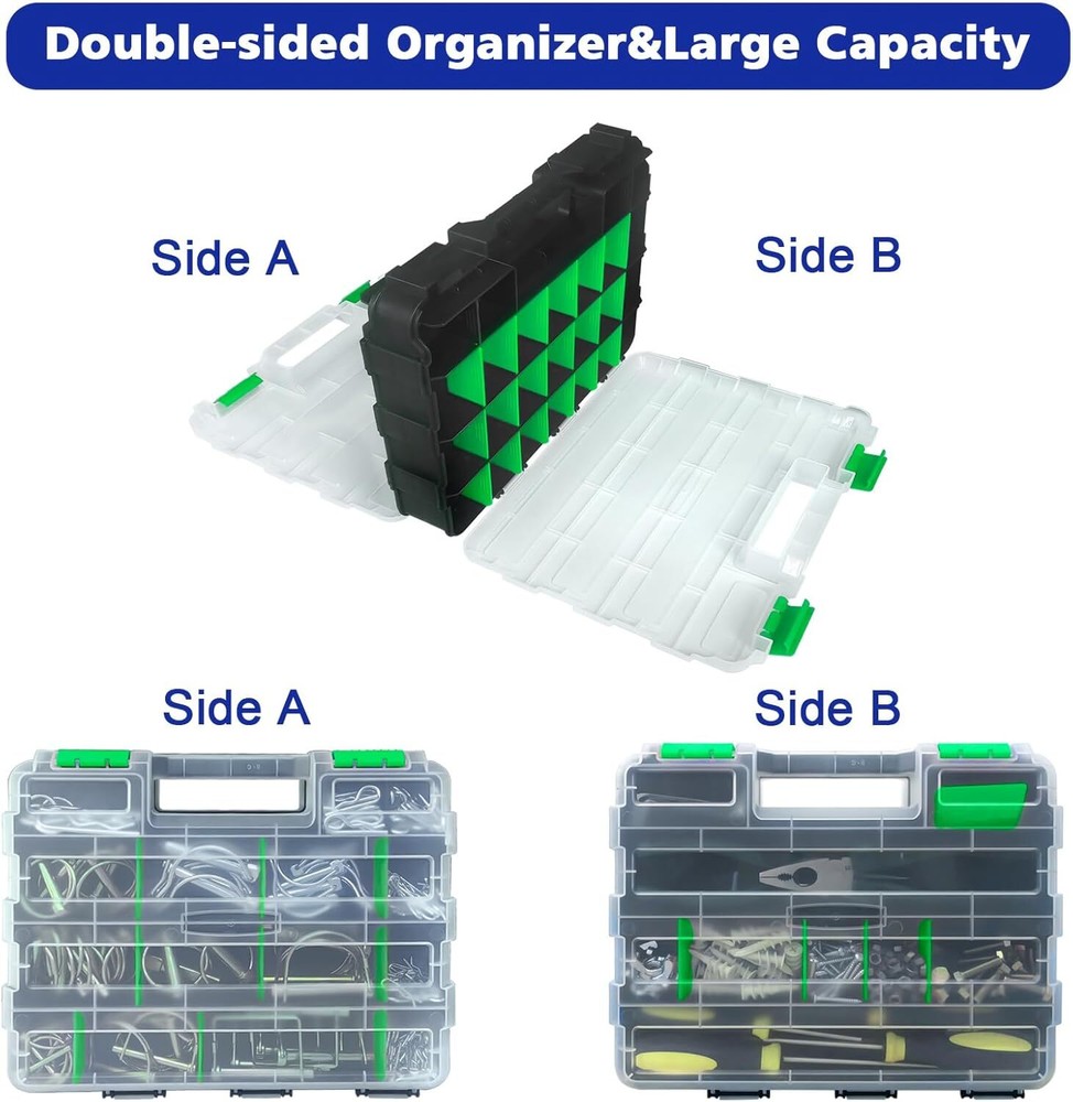 Tools Organizer Box Small Parts Storage Box 50-Compartment Double Hardware FREE AND FAST 1-3 DAY SHIPPING Premium Materials: Hardware storage organizer made of durable and heavy duty plastic material, these tool box are lightweight and portable for home or travel use, easily store it in your garage, closet, shed, or vehicle Design: Green safety clasp and compartment, black body, perfect blend of colors. It is easier to identify the tools or screws inside with a transparent lid, help you find the right parts quickly and efficiently. Great for personal or professional use Multiple Use Options Parts Organizer: 50-Compartment Double Sided Organizer with removable dividers of this organizer allow you to extend your garage storage options, declutter a storage cabinet, carry fishing lures, or Screws, Bolts, Nails, Beads, Jewelry. All removable dividers are easily slide on and off to customize the storage space Locking Latches: This screw organizer box has 4 Locking Latches, the powerful lock device can fix it in the locked state to prevent damage caused by falling when everything needs to be placed correctly Product Description Double Side Design, 50 Compartmets Removable Dividers 6 colors available Transparent Lid - Easier To ldentify The Tools Durable & Heavy Duty Plastic Compact handle For storing tools, bolts, screws, small parts, fishing tackles and many other items DIY - Box with Removable Dividers Total 50-compartment (Side A/B) This handy and versatile double side tool organizer is perfect for parts, fasteners, screws, nails, nuts, electrical connectors, fishing tackle, etc Total Empty- Large Capacity Storage All dividers can be removed, allow you to extend your garage storage options Portable Size Box Size:12.7"(L)*10.63"(W)*3.3"(H) It also has a convenient carrying handle, making it portable friendly. Easily store it in your garage, closet, shed, or vehicle Send us a message at eBay if you have any questions, and we will respond within 24 hours. Thank you for shopping at our store