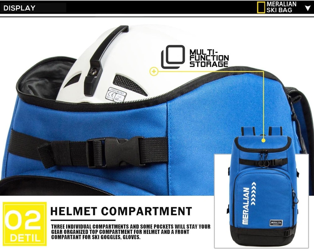 Ski Boot Bag - 50L Travel Backpack Waterproof One Size, Blue-02 Product Details Brand: MERALIAN Product Dimensions: 11"W x 12"H Closure Type: Zipper Strap Type: Adjustable Pocket Description: Slip Pocket Pattern: Geometric Capacity: 50 Liters Handle Type: Carrying Handle Number of Compartments: 3 Shell Type: Soft Item Package Dimensions L x W x H: 12.64 x 11.06 x 4.65 inches Package Weight: 0.86 Kilograms Item Dimensions LxWxH: 20 x 11 x 12 inches Brand Name: MERALIAN Model Name: Ski Boot Bag Pro Manufacturer: MERALIAN Part Number: SF-YJ02 Size: One Size Color: Blue-02 Material: Nylon Sport: Snow Skiing Style: Sport ★.SKI BACKPACK:This ski boot bag is 20*11*12 inch,volume 3570 cu,fit boots up to size 13. ★.50L STORAGE CAPACITY:1 big compartment for boots, top compartment for helmet and a front compartant for Skiing Accessories. ★.HIGH QUALITY DESIGN:The durable waterproof 600D nylon fabric ski boot bag backpack , double stitching and adjustable shuolder straps with a reflective strip to improve nighttime safety. ★.GREAT FOR TRAVELING:Take your boots and helmet on the road with ease. Carry using the TWO CARRYING HANDLES or the ADJUSTABLE SHOULDER STRAPS & CHEST STRAP. ★.FEEL SATISFIED OR MONEY BACK:Thank you very much for liking our Ski Boot Bag.If you are unsatisfied with this product, you can communicate with our customer service team at any time. We will be happy to solve it for you. Thank you very much. Product description : MERALIAN SKI BOOT BAGS It's skiing season again, and everyone is preparing for skiing equipment again. For the purchase of a ski backpack, the first is the capacity, and the second is the fabric. When skiing, the backpack will inevitably contact and rub against the hard snow, ice or even rocks. If the backpack is made of poor material, it will Often bring unnecessary trouble. The ski backpack of our brand MERALIAN is a product developed for ski lovers. We have great advantages in terms of appearance, quality and price. I believe those who buy it will feel incredible for this. Lightweight, streamlined ski backpack, there is enough space for activities in the suburbs or light-packed day trips only. The special pocket can hold all kinds of ski avalanche equipment, the front zipper pocket can hold some ski accessories, the top pocket can hold ski helmets, and the back pocket can hold boots. The strong and wear-resistant 600d waterproof nylon material is used to resist sharp edges and corners and hard rocks. Available colors: Black, Red, Blue