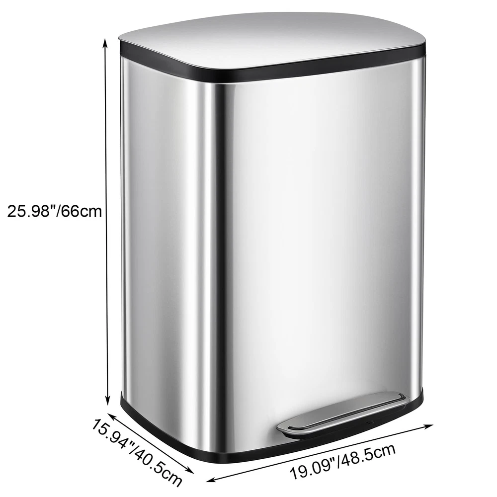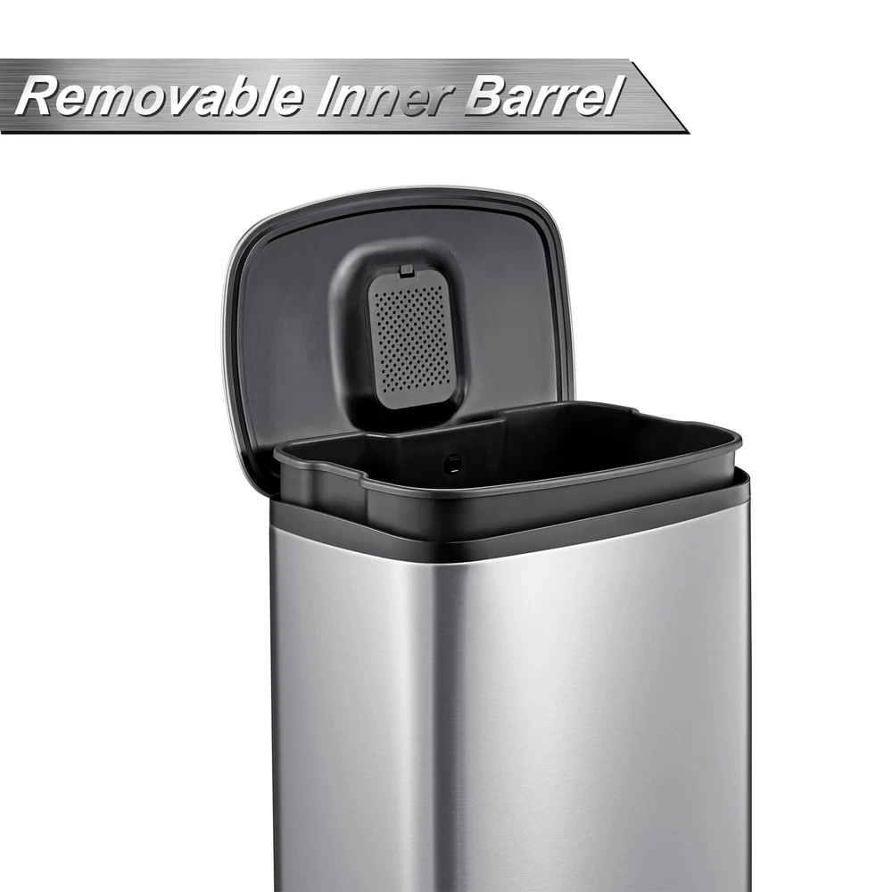50L/13Gal Heavy Duty Hands-Free Stainless Steel Kitchen Trash Can, Commercial Rectangular Kitchen Waste Bin, with Soft Close Lid & Inner Liner, Fingerprint-Resistant Premium Stainless Steel: Our trash can is crafted from high-quality stainless steel, offering exceptional rust resistance and a fingerprint-proof surface for a sleek appearance. Its easy-to-clean design adds a touch of sophistication and style to your kitchen decor while ensuring long-lasting durability. With this premium material, you can enjoy a functional and attractive solution for waste disposal that complements your home's aesthetic. Hands-Free Foot Pedal Opening: This trash can features a user-friendly foot pedal design that allows for easy access without manual contact, providing hands-free operation for enhanced hygiene. This convenient feature is especially ideal for busy kitchens, where quick and efficient waste disposal is essential. Enjoy the convenience of disposing of trash effortlessly while maintaining a cleaner, more sanitary environment. Detachable Inner Bucket: This trash can features a removable inner bucket that simplifies the cleaning process and makes bag replacement effortless. Designed to help maintain cleanliness, it prevents leaks and keeps the interior spotless. Enjoy a convenient and hassle-free waste management solution that takes the hassle out of disposal, ensuring your space remains tidy and organized with minimal effort. Stylish & Spacious: This stainless steel trash can boasts a contemporary and elegant design that enhances any setting while being easy to clean. With a generous 13-gallon capacity, it offers plenty of space for waste disposal and is compatible with standard 13-gallon trash bags available at supermarkets, making it functional and convenient for everyday use. Wide Application: Our automatic trash can is designed to seamlessly integrate into nearly any environment. Whether it's positioned in the kitchen, bedroom, bathroom, office, or study, this trash can provides an effective and aesthetically pleasing solution for waste disposal. Its modern design and versatile functionality make it an ideal addition to your home or workspace, enhancing both practicality and style.