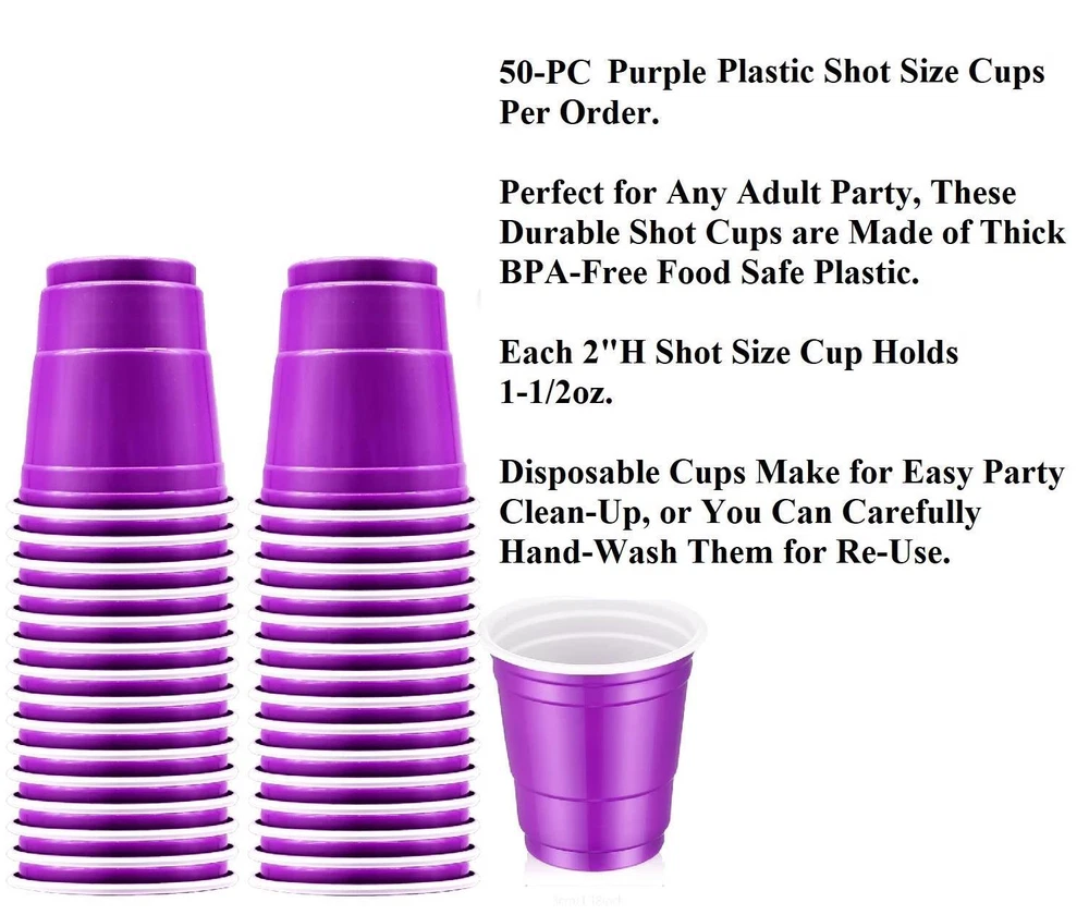 50-PC PURPLE Plastic Adult Cocktail Party Shooter Cups 1.5oz Disposable 2"H #550 50-PC PURPLE Plastic Adult Cocktail Party Shooter Cups 1.5oz Disposable 2"H #550 Click images to enlarge Description 50-PC PURPLE Plastic Adult Cocktail Party Shooter Cups 1.5oz Disposable 2"H. Serve up shots of adult beverages at your bachelor party, wedding, Mardi Gras, birthday, or just to have some fun with these green shot glasses. Made of plastic, each is disposable to make clean up a breeze! Details: Set of 50 Shot Glasses Holds 1.5-Ounces Each 2"High Made of Plastic Disposable - Makes Clean Up Easy BPA-Free ~Buy more than one item at the same time from our eBay store and save in shipping costs!~ (If buying different items, just put them all in your cart before paying, to get the combined shipping discount!) Shipping We use UPS SurePost, UPS, USPS and FedEx SmartPost to deliver our products to your home, depending on which method is more efficient for your order. We use suppliers for some of our orders and our suppliers will choose the service that is used for these orders. PLEASE MAKE SURE YOUR ADDRESS CAN BE VERIFIED BY USPS. Please allow 7-10 days for the item to reach your home. We cannot be responsible for items shipped to incorrect or incomplete addresses, which may result in the cancellation of your order. YES, we do combine shipping! The highest shipping cost item ships at regular price, and each additional item ships at $2.00 more in additional shipping charges. If you are buying several different items from our store, put them all into your cart before paying to get the combined shipping discount. Terms of Sale Unless otherwise noted, we accept returns up to 30 Days after your purchase, through the eBay Returns System. Please use eBay to contact us if there is any problems or issues with your order. In some cases, we order the item purchased from one of our suppliers, and it is shipped directly from our supplier to the customer. There are times when an item unexpectedly becomes unavailable from our supplier. We do our best to check on all of the items availability several timea a day. If an item is unexpectedly unavailable, we will issue a refund immediately. Contact Us Please use the message center in eBay to contact us. We check our message box in eBay several times a day. If you have any questions or concerns with your order, please feel free to contact us. We care very much about our customers being 100% happy with their purchases. We would very much appreciate you letting us resolve any issues you may have with your order by contacting us first, before taking any other unnecessary actions. Pictures sell! Auctiva offers Free Image Hosting and Editing. 300+ Listing Templates! Auctiva gets you noticed! The complete eBay Selling Solution.
