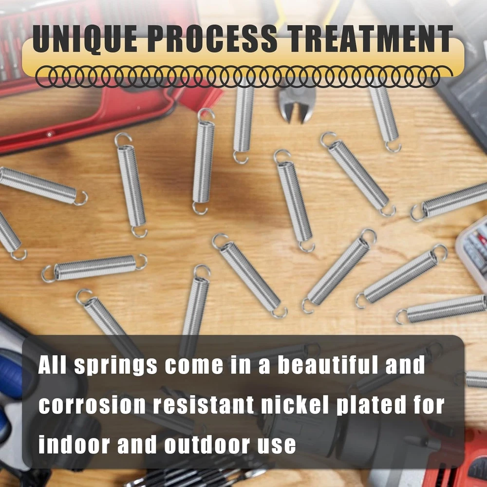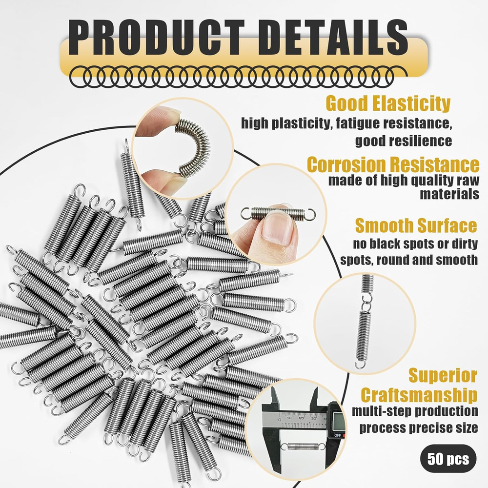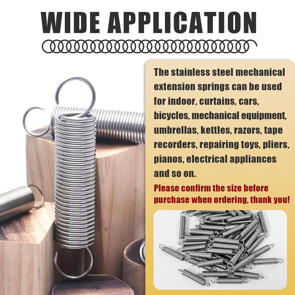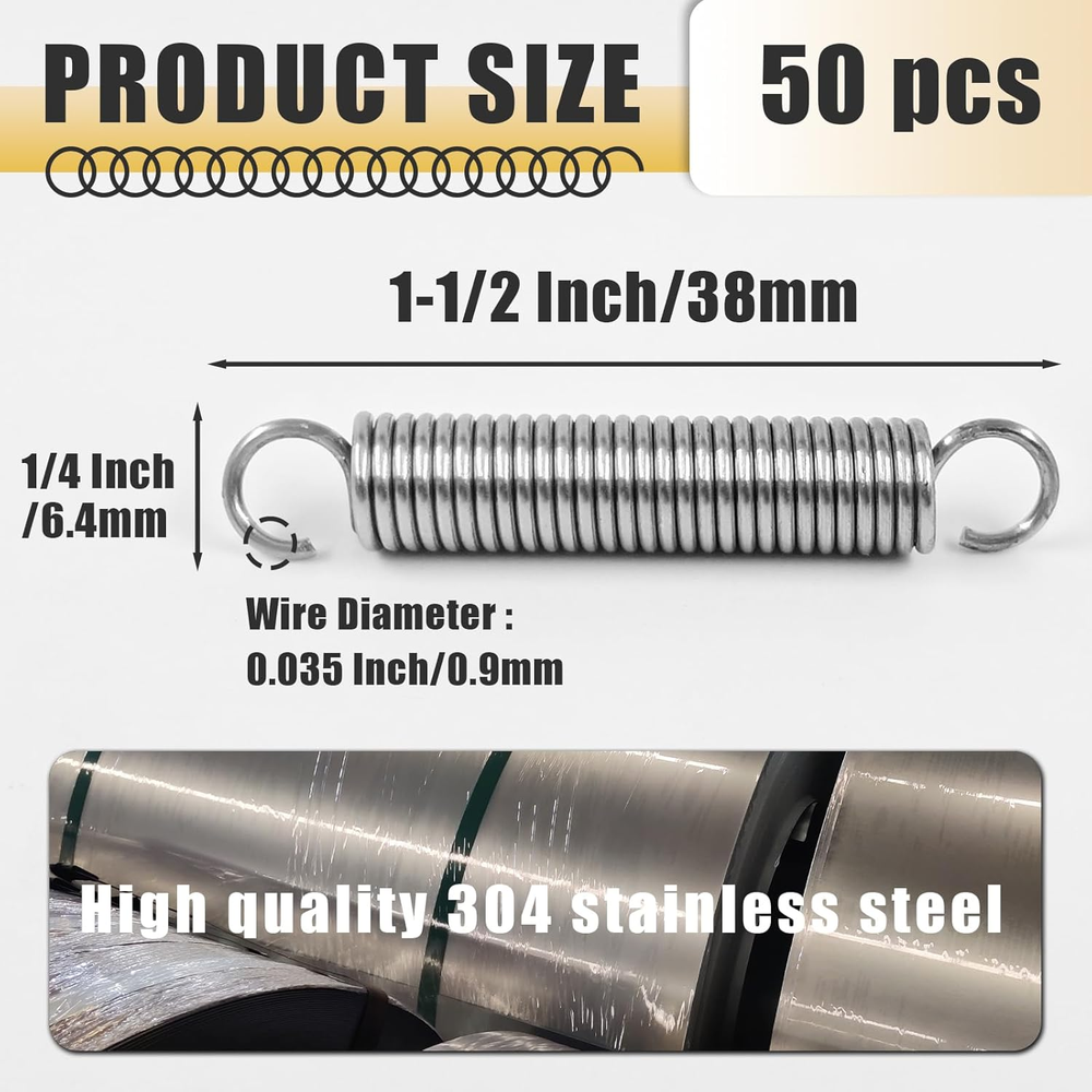 Versatile extension springs: Our high-quality stainless steel extension springs with hook ends are perfect for various applications. The durable construction ensures optimal retraction, while the smooth surface guarantees long-lasting performance Enough for every neeed: This small springs with hook ends is available in 50-pack SP9600 small springs to meet a variety of needs. These extension spring are versatile and reliable for repair and maintenance tasks Easy to use: The small spring is designed with 2 opening hook ends that you can use and fix it easily and conveniently Product specifications: Small tension spring measuring 1/4 inch x 1-1/2 inch, wire diameter 0.035 inch, made of high quality stainless steel material, rustproof, corrosion-resistant Wide range of applications: Stainless steel mechanical extension springs can be used for indoor, curtains, automobiles, bicycles, mechanical equipment, umbrellas, kettles, razors, tape recorders, repairing toys, pliers, electrical appliances and so on Product Description