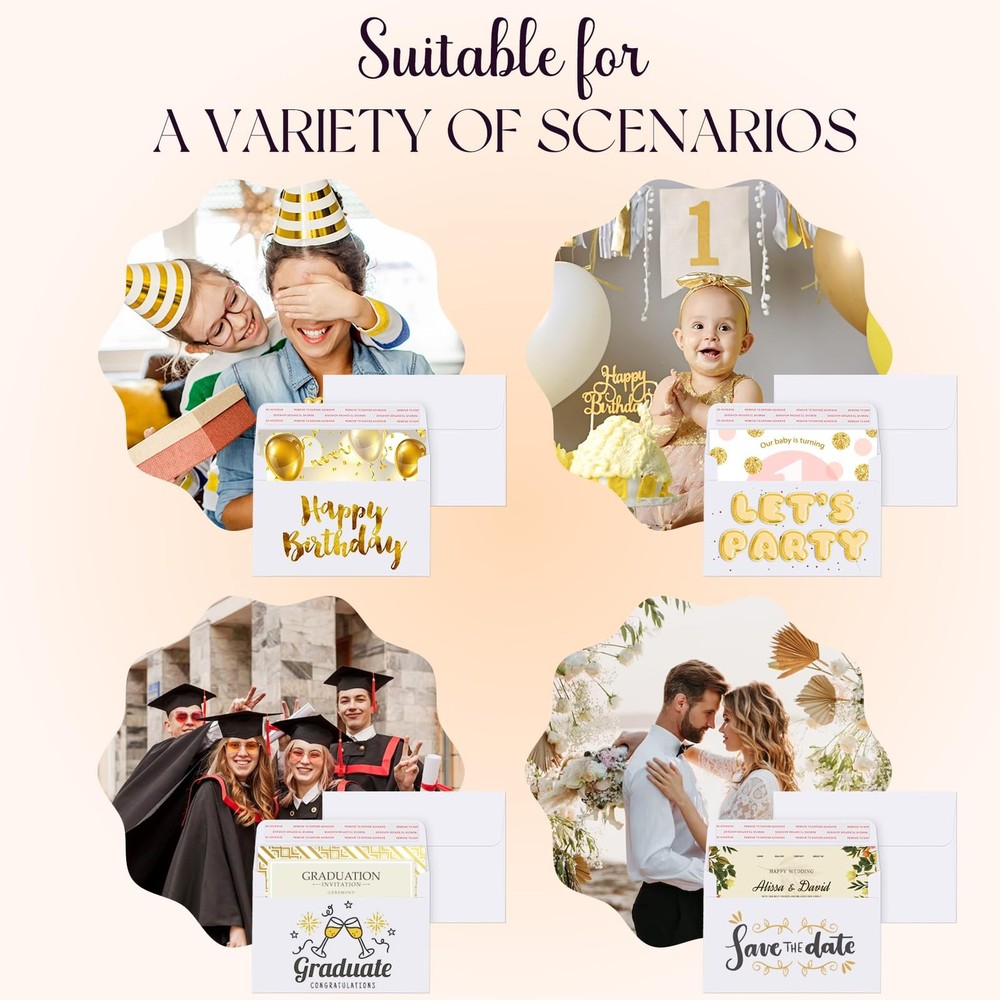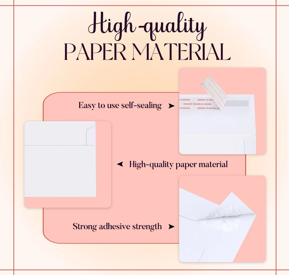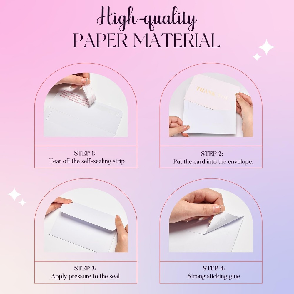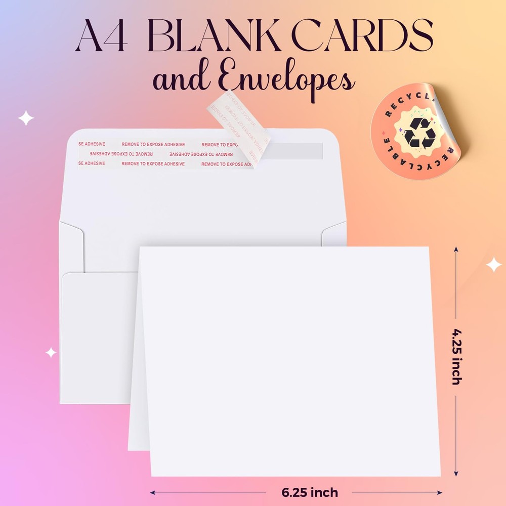 The ACSTEP 4x6 blank cards and Envelopes are the perfect way to send your homemade cards, wedding invitations, Christmas cards, and other important notes. Made of premium kraft paper, our envelopes ensure that cards arrive safe and sound. They are sturdy and durable, so you can trust them to protect your cards during shipping. Our self-stick adhesive makes sealing the envelopes quick and easy, without any mess or fuss. You'll love how easy it is to use our envelopes. And with their perfect 4x6 size, they're just right for all homemade cards. Our blank cards and envelopes 4 x 6 are perfect for wedding invitations, Christmas cards, homemade thank-you cards, mailing invitations or postcards, business use, and more. Trust ACSTEP for all your envelope needs. With our high-quality envelopes and great value, you can't go wrong! One stop shopping: our blank card with envelopes 4x6 meet your needs for both DIY cards and envelopes. Hassle-Free Self-Stick Adhesive: Easy to Use - Our self-stick adhesive makes sealing your envelopes quick and easy, without any mess or fuss. Perfect for All Occasions: Versatile Design - Our blank cards with envelopes are perfect for sending wedding invitations, Christmas cards, or homemade thank-you notes, making them an excellent choice for all occasions. Great Value for the Price: More for Less - packs of 50, our envelopes offer great value for the price. Trust Our Quality: We stand behind the quality of our envelopes. If any question, please contact us and we'll do our best to help you out.