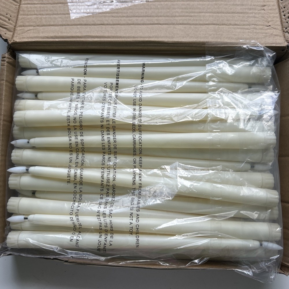 Open box New item! Package Includes: with each purchase, you receive a package that includes 50 flameless taper candles; This large quantity ensures you have enough candlesticks at hand for decorating diverse spaces or for those special events when you want a soft, inviting glow Flickering Flameless Taper Candles: the realistic flameless taper candles simulates 3D black wick and flame, and when the light is on, it has the same flickering effect as real wax candles, without the worry of being blown out by the wind; The warm yellow light emits a cozy glow, making it difficult to tell the difference between it and a real candle Battery Operated: each electronic candle is powered by 2 AAA batteries (not included); When using, just unscrew the threaded cap at the bottom of the candle, put in 2 batteries, and tighten the cap to light up immediately; There are no other switching steps; Remove the battery and turn off the power to ensure the longevity of the candle and battery, and store it more safely Efficient LED Lighting: all of our flameless taper candles are equipped with LED lights; Providing a long lasting glow, the LED lights are energy efficient and compatible with LED; Enjoy the ambience of candlelight at home without the worry of battery life Wide Range of Uses: these LED taper candles have the elegance of traditional taper candles without the risk of fire, ideal for decorative purposes such as weddings, parties, home decor, special events, seasonal festivals and so on