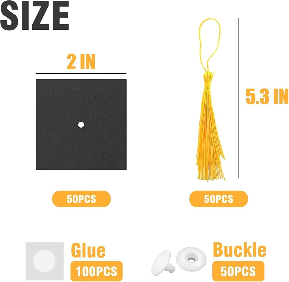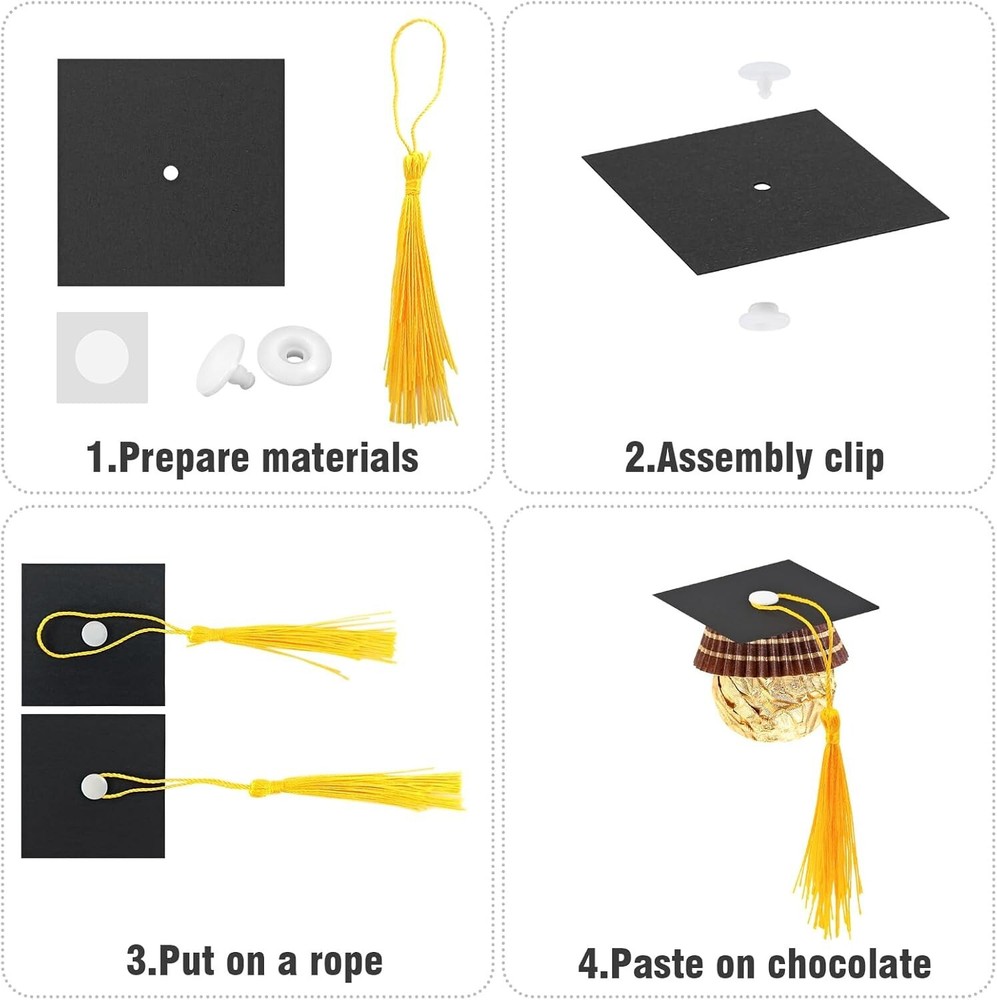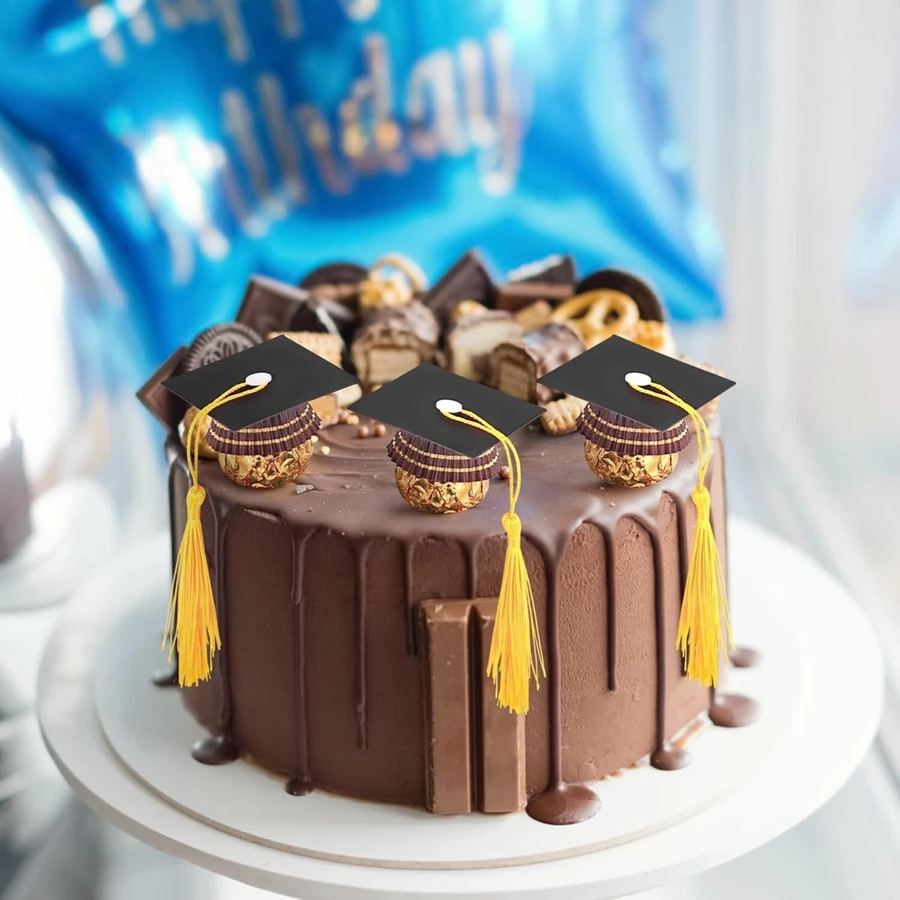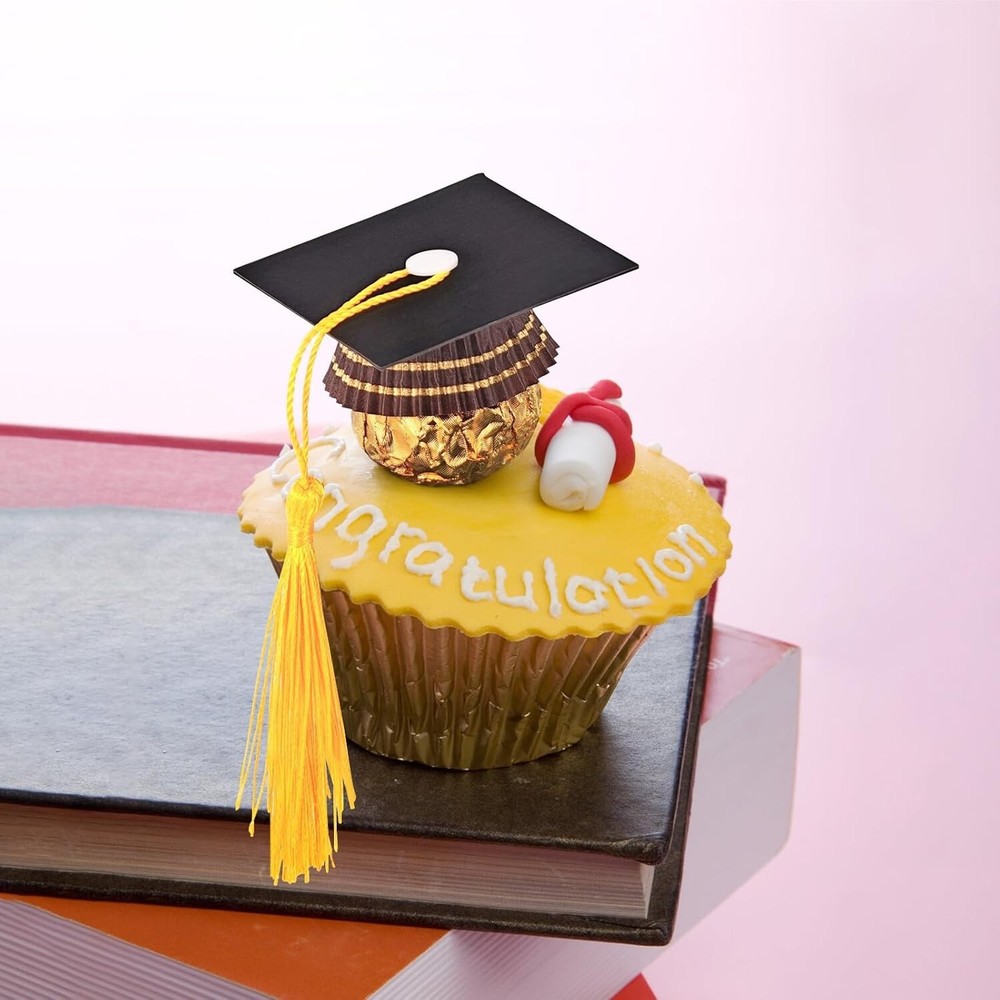 50Pcs Graduation Cap Chocolate Decorations,2025 Graduation Cap Cupcake Toppers Chocolate Decorations with Tassel Adhesive Dots for Class of 2025 Congrats Grad Cap Black About this item Package Included: You will get 50 sets of graduation hat decorations, including 50 pieces of cardstock, 50 pieces of mini graduation tassels, 50 pieces of snap fasteners, 100 pieces of adhesive dots, enough to meet your DIY use needs Size: These graduation cap decor are about 5 x 5 cm/ 2 x 2 inches, a proper size for you to hold small items, such as candies, chocolates, mints and more, to fill the cap with your delicious candies Unique Decoration: Our graduation cap decoration is designed to be the same as the traditional graduation cap used by people. Our graduation cap decoration is small and exquisite, but especially, its size is very suitable for holding small items, such as chocolates and candies. So it can also be used as a decoration for desserts to make them look more beautiful Memorable Moment: The graduation cap chocolate decoration is used in graduation parties, ceremonies and other activities related to graduation. These moments are meaningful and memorable for you. This decoration can create a stronger atmosphere for your graduation party Easy to Install:This graduation cap cupcake is easy to install. First, buckle the snap fastener in the hole in the middle of the card. Second, buckle the tassel in the snap fastener, then fasten the snap fastener. And finally, stick the adhesive dot on the snap fastener and install the small items you want DIY Gift:If you want shorter tassel