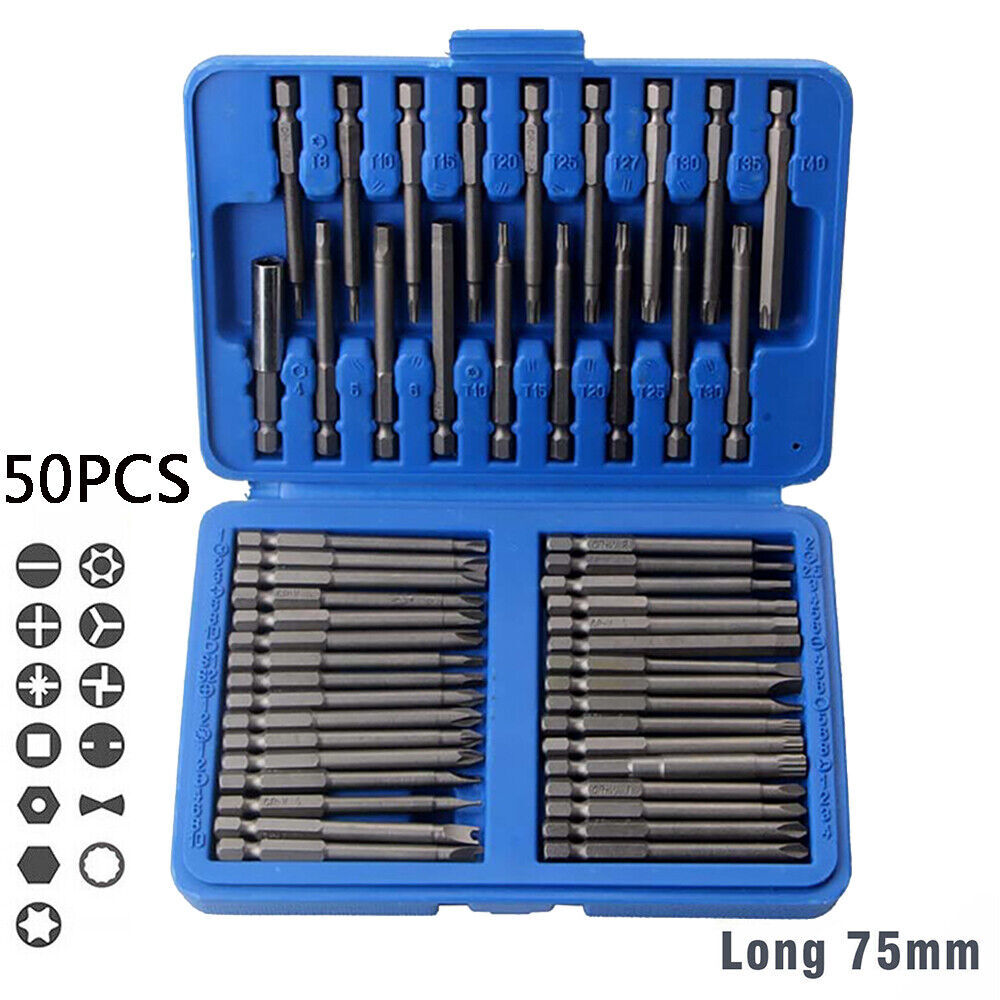 Feature: 1. Made of high-quality materials, high hardness, high strength, strong and durable. 2. A variety of product specifications can be selected and used according to your needs. 3. With storage box, easy to carry. 4.Those bits fit for electric screwdrivers, hand screwdrivers, electric drills,and so on. Specification: Material: chrome vanadium alloy steel Bit length: 75mm Packing size: 19.5*13.5*4.5cm Gross weight: 950g Product Specifications: Star Bits - T8. T10. T15. T20. T25. T27. T30. T35. T40 TP Star Bits - 10. 15. 20. 25. T30 Clutch Bits - 1.2.3 Torq Bits - 6.8.10 Spline Bits - M5. M6. M8 Tri-Wing Bits - 1.2.3.4 Square Bits - 1.2 Spanner Bits - 4. 6. 8. 10mm Flat Bits - 4. 5. 6mm Phillips Bits - No.1.2 Pozidriv Bits - No.1.2 Hex Bits TP - 2. 2.5. 3. 4. 5. 6mm Hex Bits - 4. 5. 6mm Magnetic holde CR-V Bits Packing list: 50PC screwdriver bit set*1