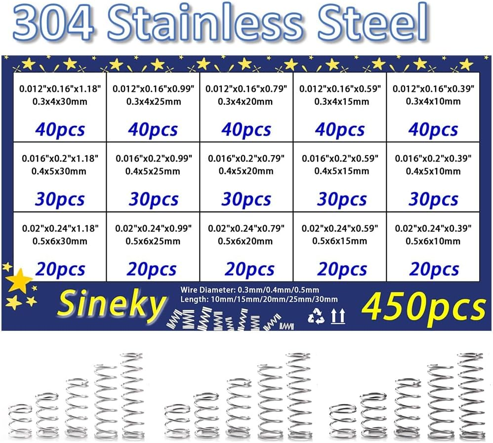 This assortment of stainless steel compression springs is a game-changer for DIY projects and repairs! The anti-rust 304 steel ensures durability, and the 15 sizes (450 pieces total) cover almost any need. The labeled, compartmentalized box makes finding the right spring a breeze—super convenient and portable. Perfect for hobbyists, mechanics, or anyone needing reliable small springs!