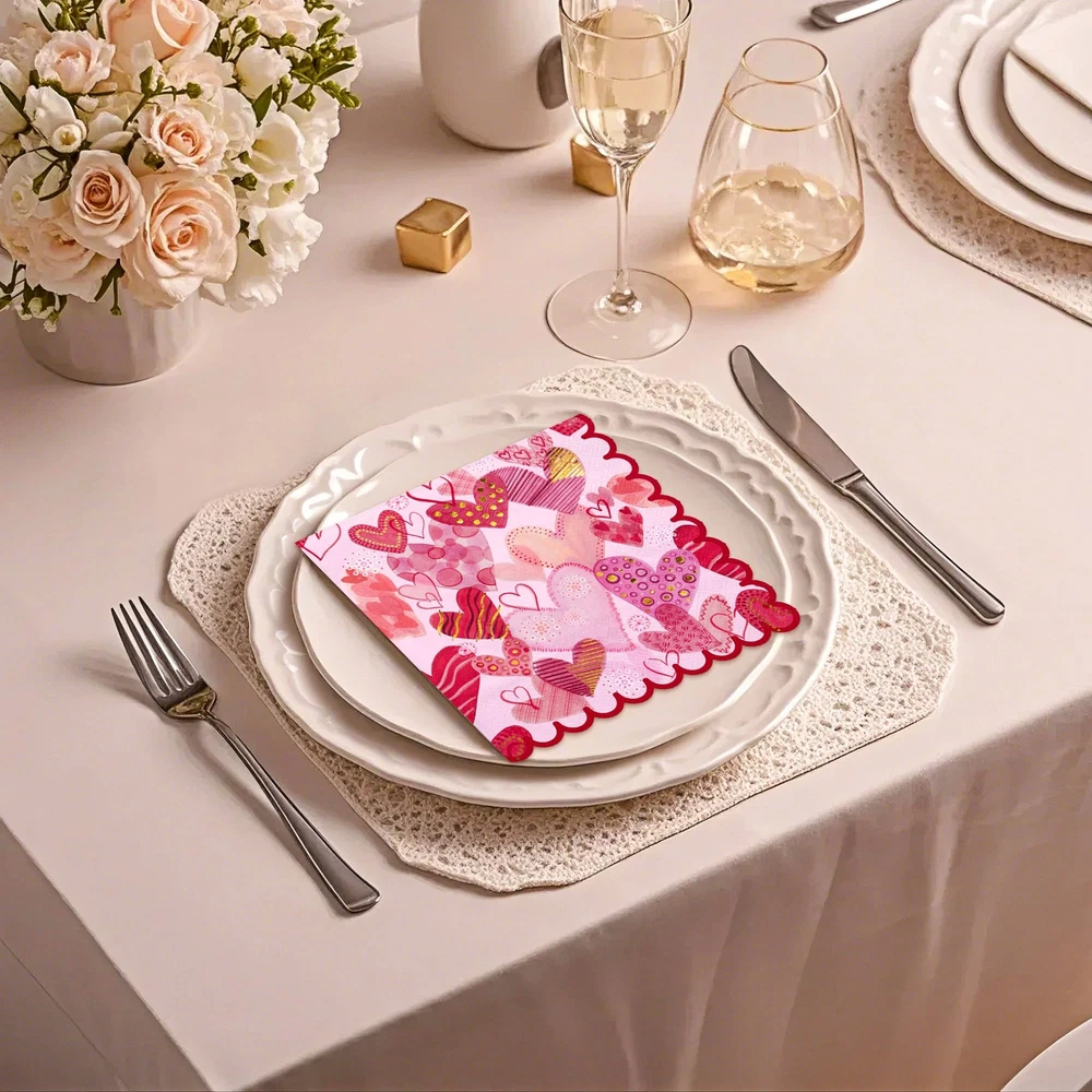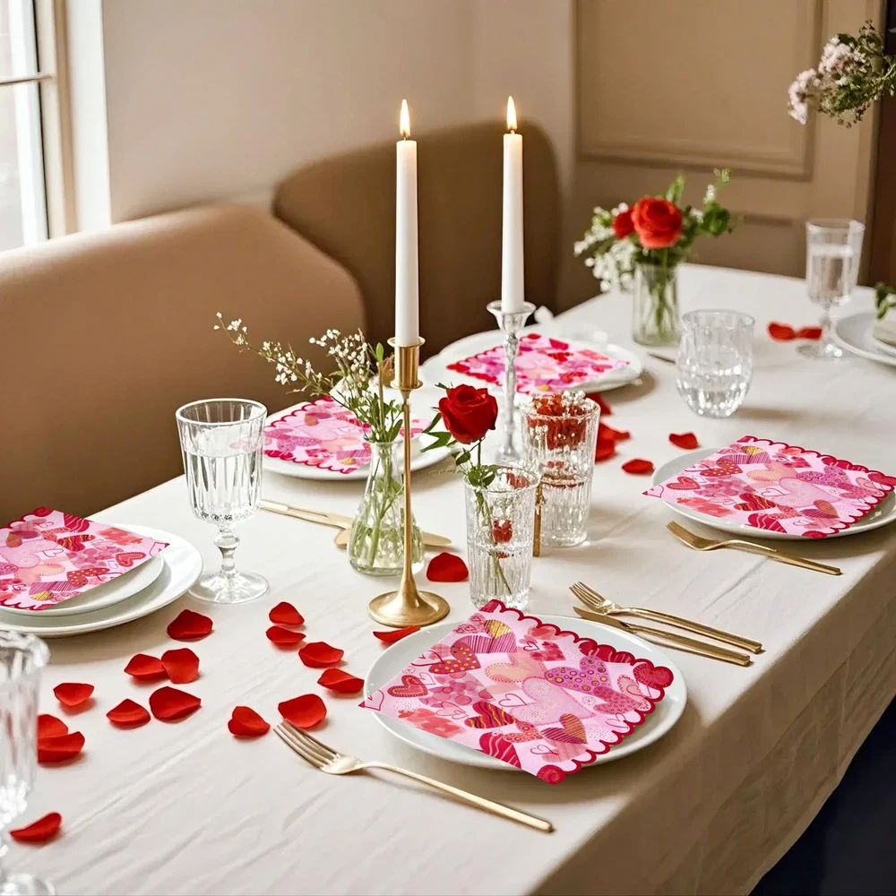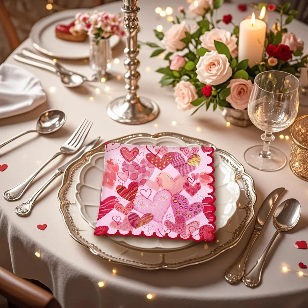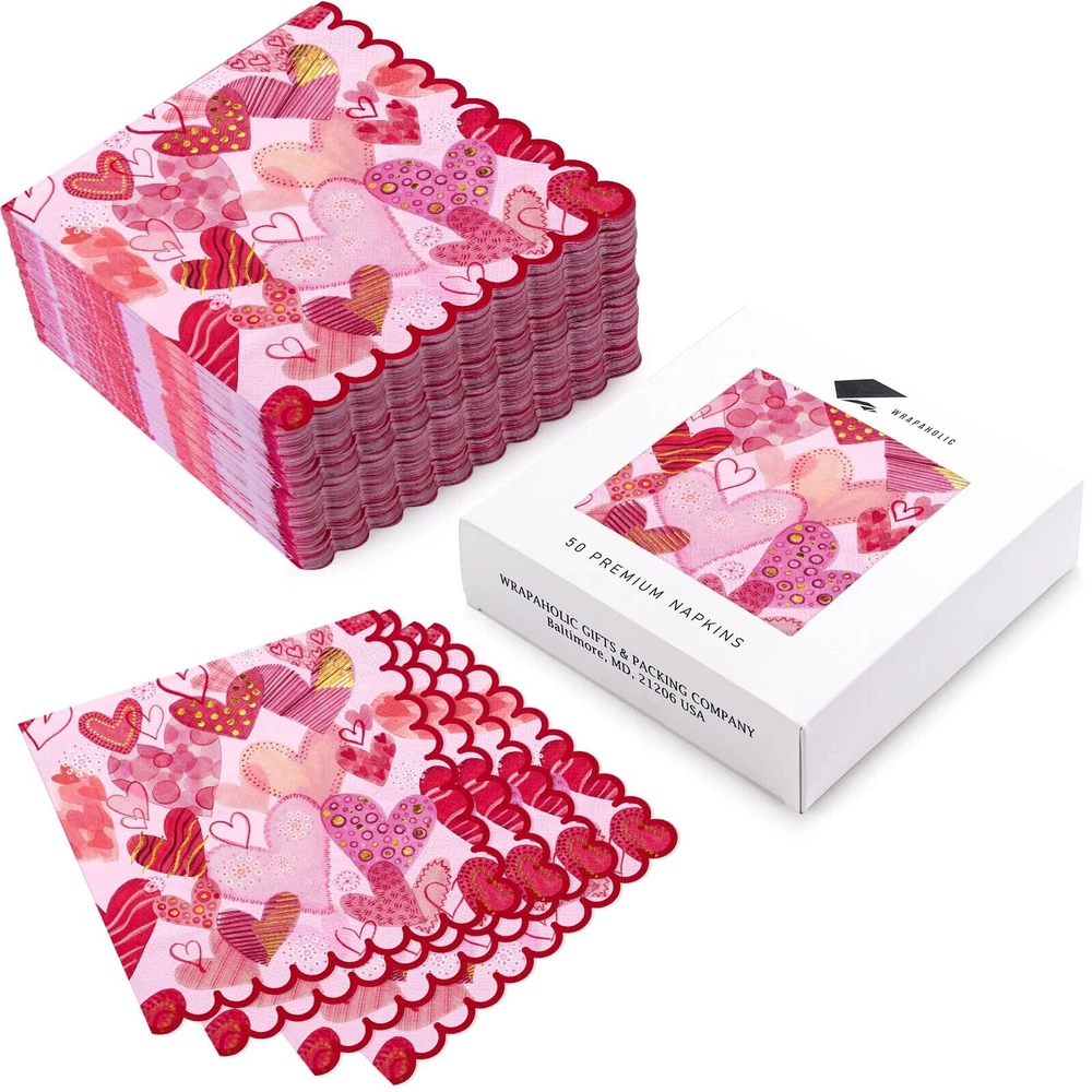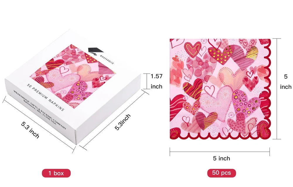 VALUE PACK: Each pack includes 50-Count 3-ply valentine's day disposable paper napkins. FOLDED SIZE:Each napkin measures 5" x 5" and great for dinner and luncheon events celebrating valentine's day, wedding, anniversary. UNIQUE DESIGN: Creatively and beautifully designed with sweet heats with gold foil on pink napkins. QUALITY NAPKINS: Each paper napkin is 3-ply, they are extra-sturdy, super absorbent, and soft to touch, keep your dining table clean and ensure a comfortable dining experience. USE ALL OCCASION: These napkins are very suitable for valentine's day, wedding, anniversary or family gatherings. It can perfectly combine with plates, also use napkins for crafting.