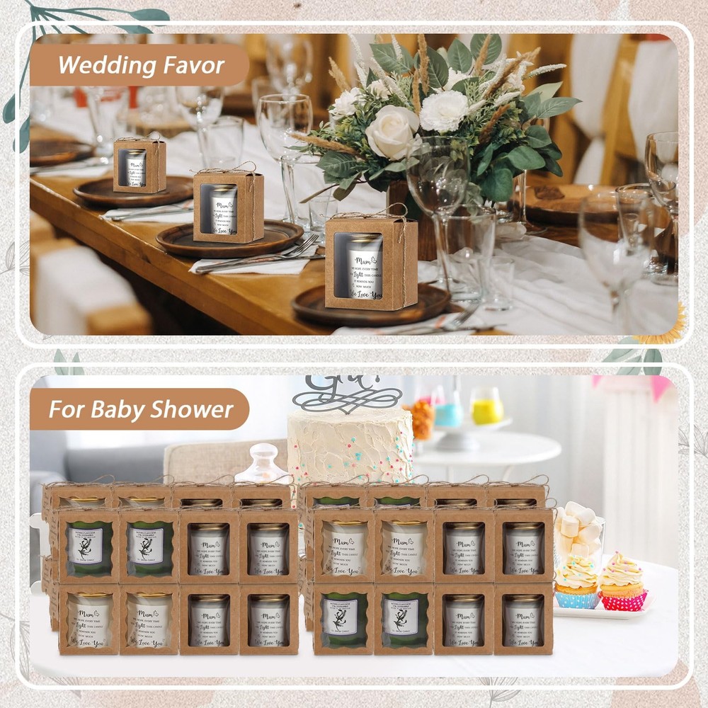 Features: The candle boxes packaging are ideal for DIY enthusiasts or small business owners. Whether it's party favor boxes, ornament boxes for gifts, or candle packaging for a business, these boxes will get you covered. Our candle boxes are made of quality 350g kraft card material, ensuring your candles are securely protected during transport or storage. Paired with a charming paper thank you for celebrating with us tag and a long jute hemp rope, these ornament gift boxes promise a nice feel and quality. Specifications: Material: Gift boxes with clear window: mainly 350g kraft card Thank you for celebrating with us tag: paper Hemp rope: jute Color: mainly kraft Size: Thank you for celebrating with us tag: about 2.36 inches/ 6 cm in side length Gift boxes with clear window: about 3.35 x 3.35 x 3.94 inches/ 8.5 x 8.5 x 10 cm Hemp rope: about 98.43 ft/ 30 m in length Capacity: hold about 10 oz cylindrical candles Package includes: 50 x Gift boxes with clear window 50 x Thank you for celebrating with us tag 1 Bundle hemp rope Notes: Manual measurement, please allow slight errors on size. The color may exist a slight difference due to different screen displays. Winding risk may exist, please keep our product away from children. Convenient Packaging: our package includes 50 gift boxes with clear window, 50 pieces of thank you for celebrating with us tags, and a bundle of hemp rope; This combo pack gives you the convenience of having most of your candle packaging needs in one place Transparent Window Design: our candle packaging boxes are creatively designed with a transparent window on the front to uniquely showcase your candles; This kind of boxes allow your guests to preview the candle's design and color even before opening the box; An excellent choice for candle sellers looking to impress their clients and increase sales( The inside of the box is the same color as the outside Elegant Color and Size: each candle box is mainly crafted in kraft color that complements many events or occasions; The box offers 2 different shapes of transparent windows to display your candle gifts, and it has a sufficient space with a size of about 3.35 x 3.35 x 3.94 inches/ 8.5 x 8.5 x 10 cm, ideal for holding about 10 oz cylindrical candles; In contrast, our thankful for tags catch the eye with a side length of about 2.36 inches/ 6 cm and the hemp rope's length is about 98.43 ft Easy to Assemble: our candle gift box comes in flat and pre folded form, which is not only elegant, but also easy to assemble, making it effortless to prepare for your event or package your products; When not in use, it can be folded into a flat package, taking up no space Ideal for Wide Applications: these gift boxes for ornaments can hold candles for weddings, birthdays, and other special occasions; This nice multipack is the ideal choice for bulk gift boxes that cater to different purposes