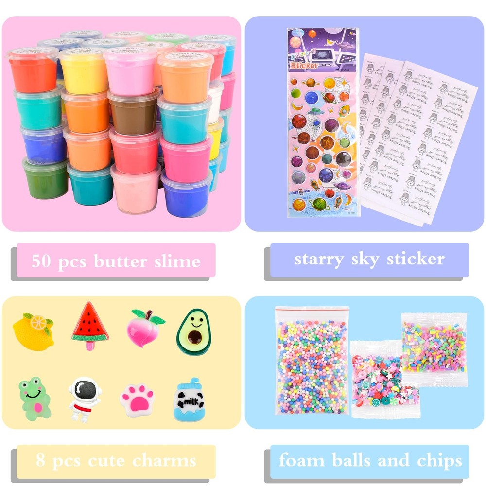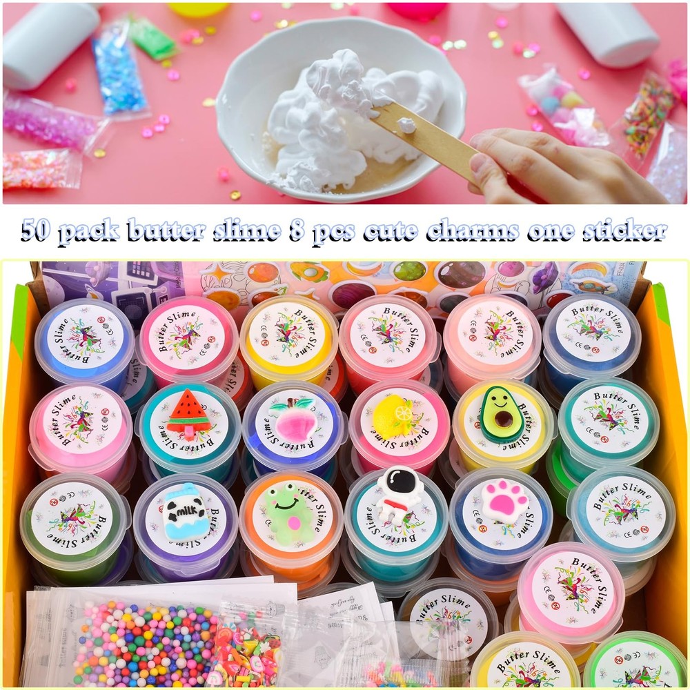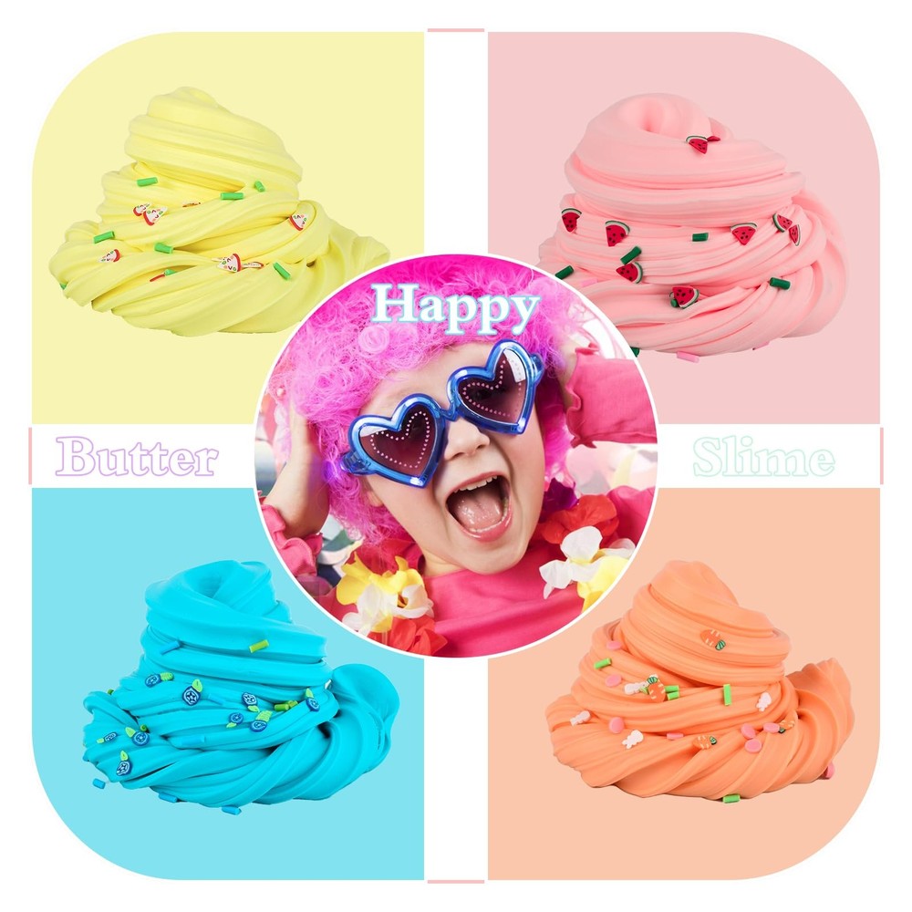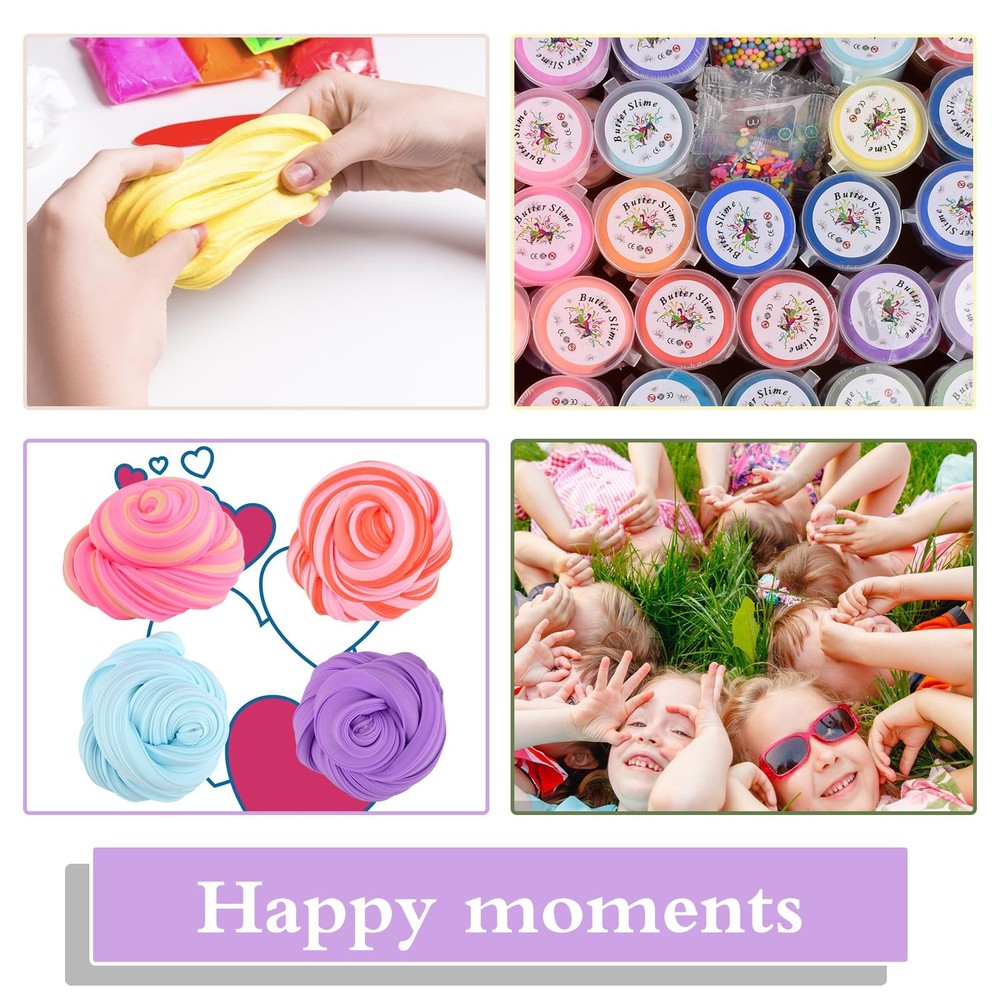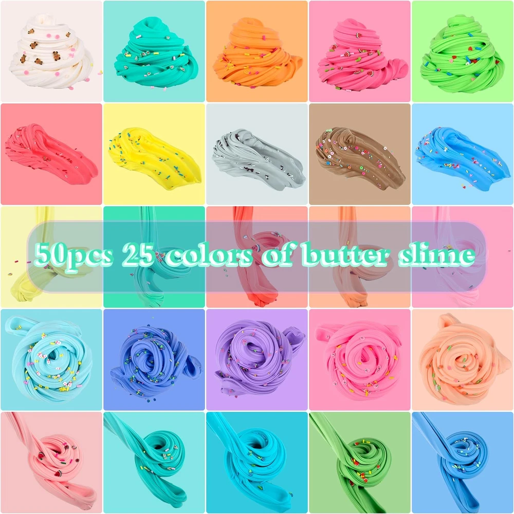 Product description Colorful mucus can relieve pressure at any time Soft, non-sticky and elastic mucus with excellent texture and fragrance. Reusable, washable, easy to clean and Safety and certification. Candy bag packaging Package includes: There are 25 colors of butter slime, including pink,green,blue,redslime, and the charm of Peachy,Watermelon, avocado, lemon,Astronaut, milk, pink paws and frog 8 charms Product capacity: 30ml Product weight: Single butter slime > 20g Mucus x 50 Features: ^Soft and cool touch ^Safe, mild ^Strong plasticity ^Excellent flexibility and elasticity ^Good texture ^Easy to ^Improve children's creativity, help them develop motor skills and enhance hand-eye coordination Warm prompt: 1. Can't eat Children under 3 years old must play under the supervision of adults to avoid eating by mistake 2. Rub the mucus several times before pulling. This will make it more cohesive 3. If it is a little dry, add some glycerin or water, and then roll 4. If it is too sticky, add some flour or starch and knead it well 5. When not in use, please put the mucus back into the container 6. Please note that mixed use cannot restore its original appearance 7. If the clothes are dirty accidentally, take off in time 8. Wash hands after playing with mucus