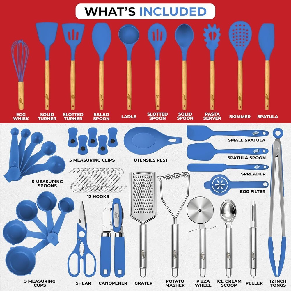 This silicone kitchen set is a game-changer! It has everything you need—50 high-quality, non-stick, and heat-resistant tools that make cooking a breeze. The variety is impressive, from tongs to measuring spoons, all neatly organized. Dishwasher-safe and durable, it’s perfect for everyday use or as a thoughtful gift. Love how it saves space and keeps my kitchen clutter-free!