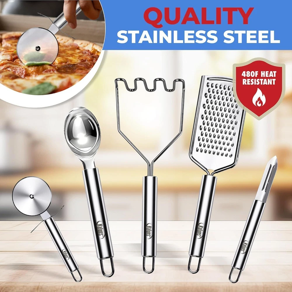 Size small Is Dishwasher Safe Yes About this item Complete 50Pcs Set: The Kaluns utensil set includes everything you need for a complete cooking experience. You’ll receive: slotted turner, ladle, salad spoon, solid turner, solid spoon, pasta server, slotted spoon, skimmer, spatula, utensil rest, can opener, egg separator, small spatula, spatula spoon, kitchen shears, 12” tongs, 12 x kitchen hooks, 5 x measuring cups, 5 x chip clips and 5 x measuring spoons, can opener, grater, pizza cutter, veggie peeler, ice cream scoop, a total of 50 pieces! Safe and Durable Materials: Our cooking utensils set is made employing premium grade, highly durable materials, a combination of non-BPA silicone, stainless steel and wood, with smooth finishes and with no unwanted paints or nasty smells that transfer to your delicious foods Heat Resistant and Perfect for Your Cookware: Unlike similar products on the market, this silicone spatula set is easy to clean and doesn’t stick, withstanding temperatures of up to 480℉ without melting or damaging your premium pans and pots. Perfect Gift for Loved Ones: Order these spatulas for kitchen use for yourself or as an original gift idea for a friend or loved one, and you can be sure to win their appreciation! An excellent choice for cooking enthusiasts, housewarming gift, wedding registry gift and other special occasions, this set comes in an elegant ready to gift box, for your convenience. The Possibilities Are Endless: These silicone utensils for nonstick cookware are incredibly versatile and will come in handy for a wide range of cooking activities, allowing you to surprise close ones with delicious home-cooked courses, desserts and more! Size small Is Dishwasher Safe Yes Handle Material Wood Material Type Free Plastic Free, Latex Free, Lead Free, BPA Free, PVC Free Recommended Uses For Product Serving, Flipping, Mixing, Cooking Manufacturer Kaluns UPC 850014784539 Global Trade Identification Number 00850014784539 Package Dimensions 13.94 x 7.99 x 4.88 inches Item Weight 4.8 pounds