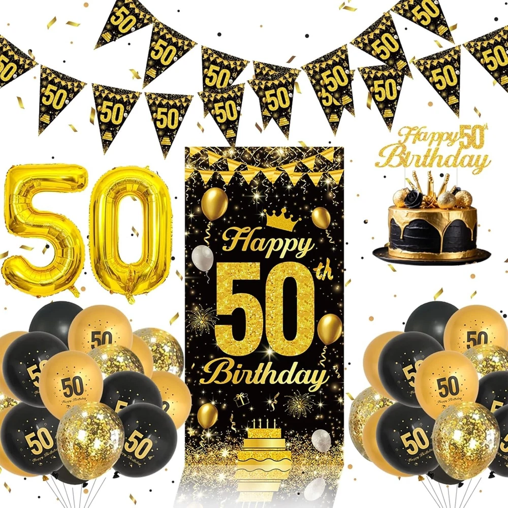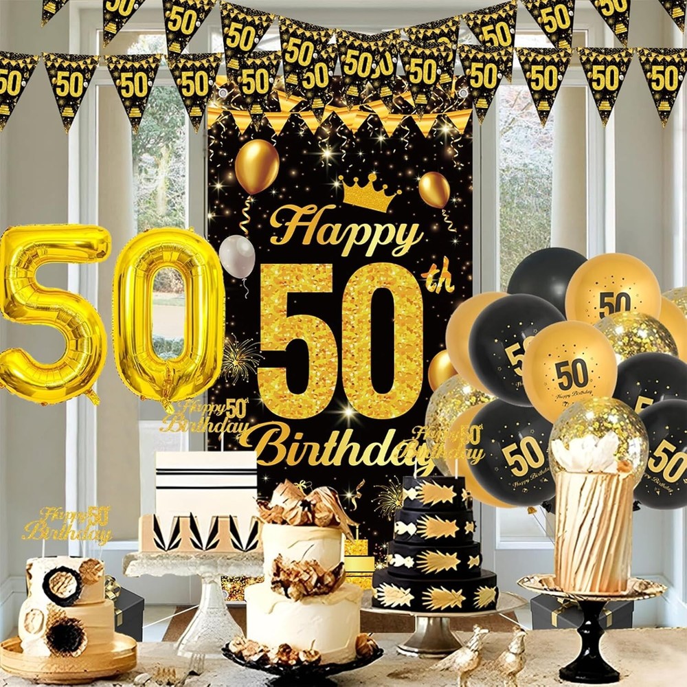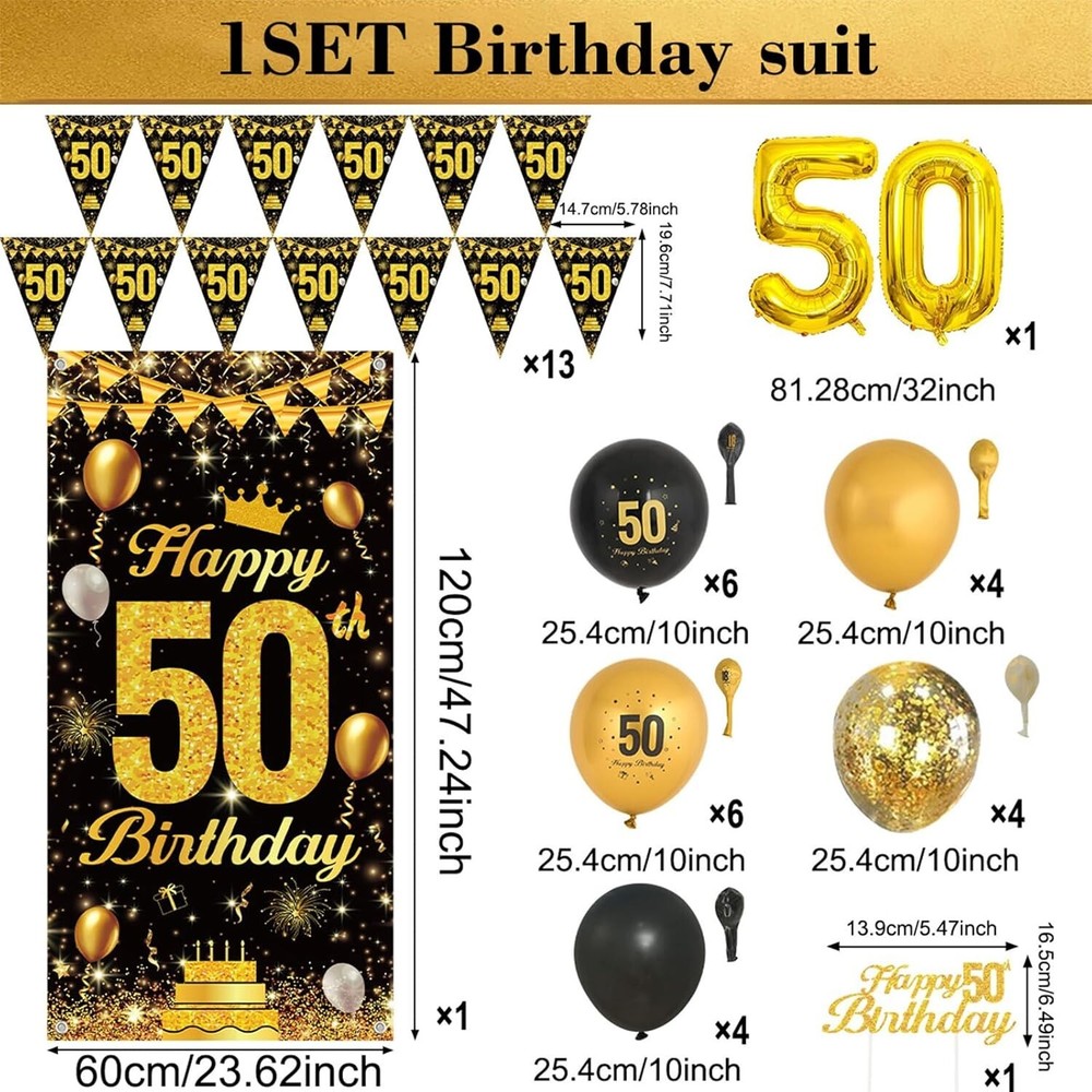 About this item đ€ă50th Birthday Decorations Setă- Our 50th black gold birthday decorations set includes 1pcs 50th Happy Birthday banner(23.6 x 47.2 inches), 1pcs happy 50th birthday cake topper, 1pcs birthday bunting, 1pcs number 50 balloon,10pc black balloons, 10pcs metallic gold balloons, 4pcs gold confetti balloons provide a perfect DIY balloons pack for black gold birthday party decorations. đ€ăPremium Qualityă- Our birthday party set is made of quality materials, all balloons are made of reliable latex, good quality, which are not easy to break. This glitter gold black birthday party background is made of high quality polyester, which is durable, wrinkle-free and not easy to fade. Glitter black gold birthday set is perfect for photography and party decorations. đ€ăBlack Gold 50th Birthday Decorations For Men Womenă- 50th birthday decorations mean a brand new chapter to one's life and you deserve a special way to enter it. The glitter black gold birthday party set has a shiny and eye-catching appearance, which can add a touch of elegance and glamour to your party. Put on these 50th birthday decorations on the wall, window, garland or garden which appeals to everyone. đ€ăEasy to Assembleă- Say goodbye to complicated and frustrating decoration set up. Save time and money with our easy-to-assemble black gold Birthday Decorations. You can get your party venue ready in no time, and with minimal effort, you can create a stunning party space, suitable for any birthday party, they can be sparkling photo backdrop, create a happy atmosphere, definitely impress the guest deeply on your birthday party. đ€ăWarranty And Serviceă- Customer satisfaction is our highest pursuit. Before our product leaves our company, they are inspected by a special warehouse quality inspector. If you are not satisfied, we support 30 days no reason to return and exchange goods, please rest assured to buy.
