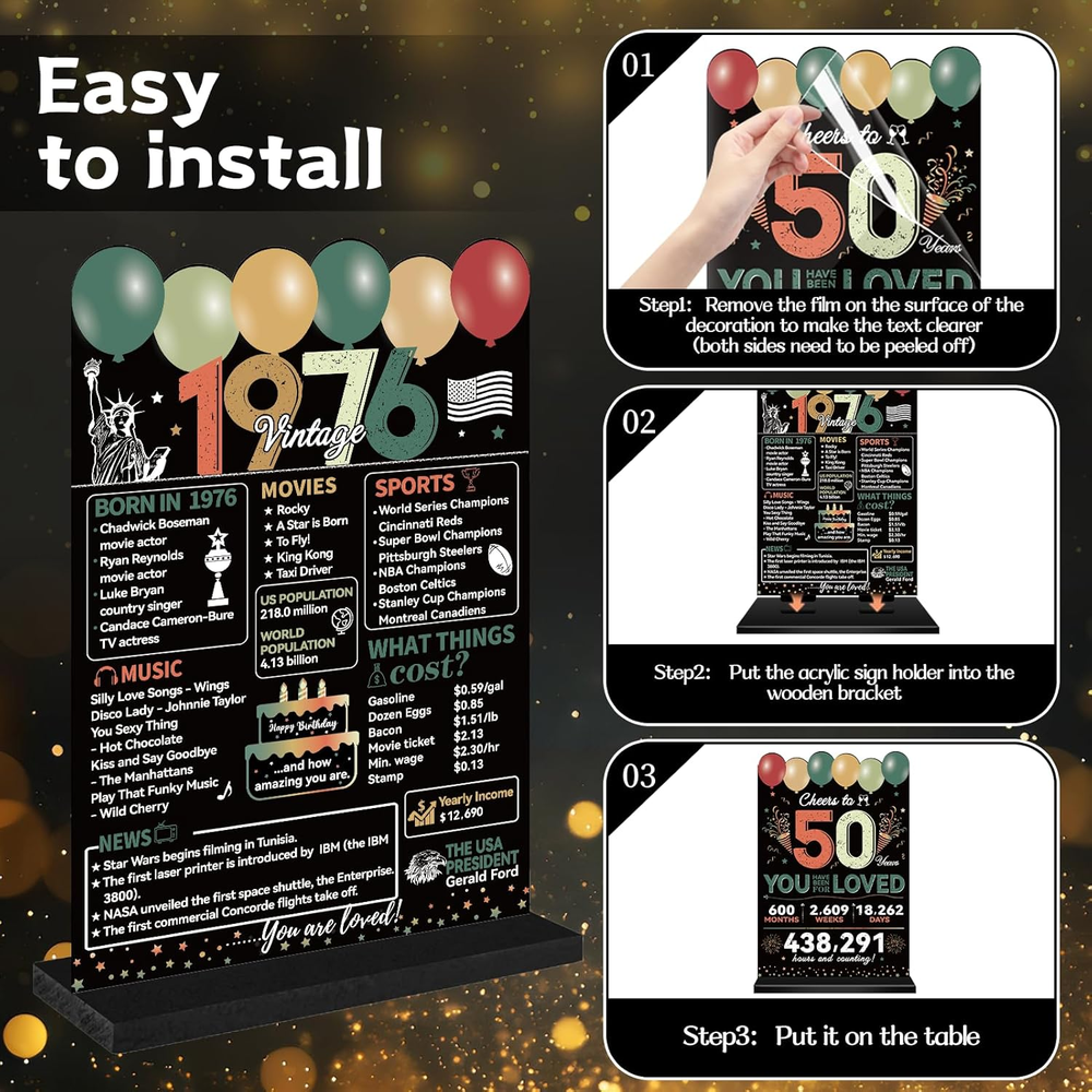 Store New Arrivals Add to Favorite View Feedback Contact Fast deliveries to the customer's home Quality customer service John Make the customers happy! 50Th Birthday Decorations for Men Women, Happy 50Th Birthday Two-Sided Acrylic Table Poster with Stand, Colorful Vintage 1976 Birthday Party Supplies, Cheers to 50 Years Old Table Decor Description [You will Receive] -50th birthday acrylic table decorations, including a elegant 1976 vintage acrylic sign and a black wooden stand, that will bring you a special 50th birthday party experience. [Cheers to 50 Years Old] - Our 50th birthday table decor features an elegant black green design, with the super large numbers "Cheers to 50" and "Vintage 1976" are combined with balloon, fireworks, cake and other patterns, create an unforgettable birthday party for you! [Multi Functional] - Suitable for indoor and outdoor 50th birthday decorations, You can place it on the bedside table in your bedroom, in the living room, in the kitchen, or at the 50th birthday party, to preserve those wonderful memories. [High Quality Materials ]-This fifty year old birthday decorations set is made of sturdy acrylic materials and advanced printing technology, which are durable, and reusable. [Easy to Use] - Insert the base with two holes, just insert the 1976 birthday decoration into the base to decorate your party! Product description Item model number DX06007 Style Vintage Mounting Type Tabletop Color Black Colorful Product Dimensions 12.6"L x 6.7"W Material Acrylic Item Weight 4.2 ounces Shape Rectangular Pre-printed Cheers to 50, Vintage 1976 Recommended Uses For Product indoor, outdoor Included Components Black wooden stand ABOUT US We offer the best prices around on high quality products. Our E-store includes media such as books, movies, music and games while offering electronics, toys, sporting apparel, clothing, tools, general home, garden items and more. SHIPPING We are always working hard to ensure your package arrives as soon as possible. Please understand that some factors like weather, high postal traffic, and the performance of shipping companies are outside of our control. We offer free shipping to the lower 48 states and ship within 2 business days of payment, usually sooner. We do not accept P.O. Boxes. Please provide a physical address. For shipping outside of the continental USA, we only use eBay's Global Shipping Program. The item is shipped to KY and then sent to the rest of the world. International customers are responsible for all duties and taxes. Continue to 'check out' to calculate costs for shipping the item to your country. Messages regarding eBay's Global Shipping Program MUST be directed at eBay EXCLUSIVELY. RETURNS We offer a 30-Day Return Policy on items in which you are not completely satisfied with. You have the option of a full-refund or an exchange of the item. No returns are available on items shipped outside of the USA PAYMENT We accept PayPal. CONTACT US This page content is yet to come Please ad us to your favorite seller and visit again later Thank You CUSTOMER SATISFACTION We try our very best to make sure every customer is completely satisfied. If there's a problem, message us! We're happy to help. WE ACCEPT