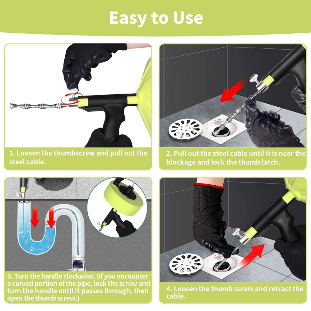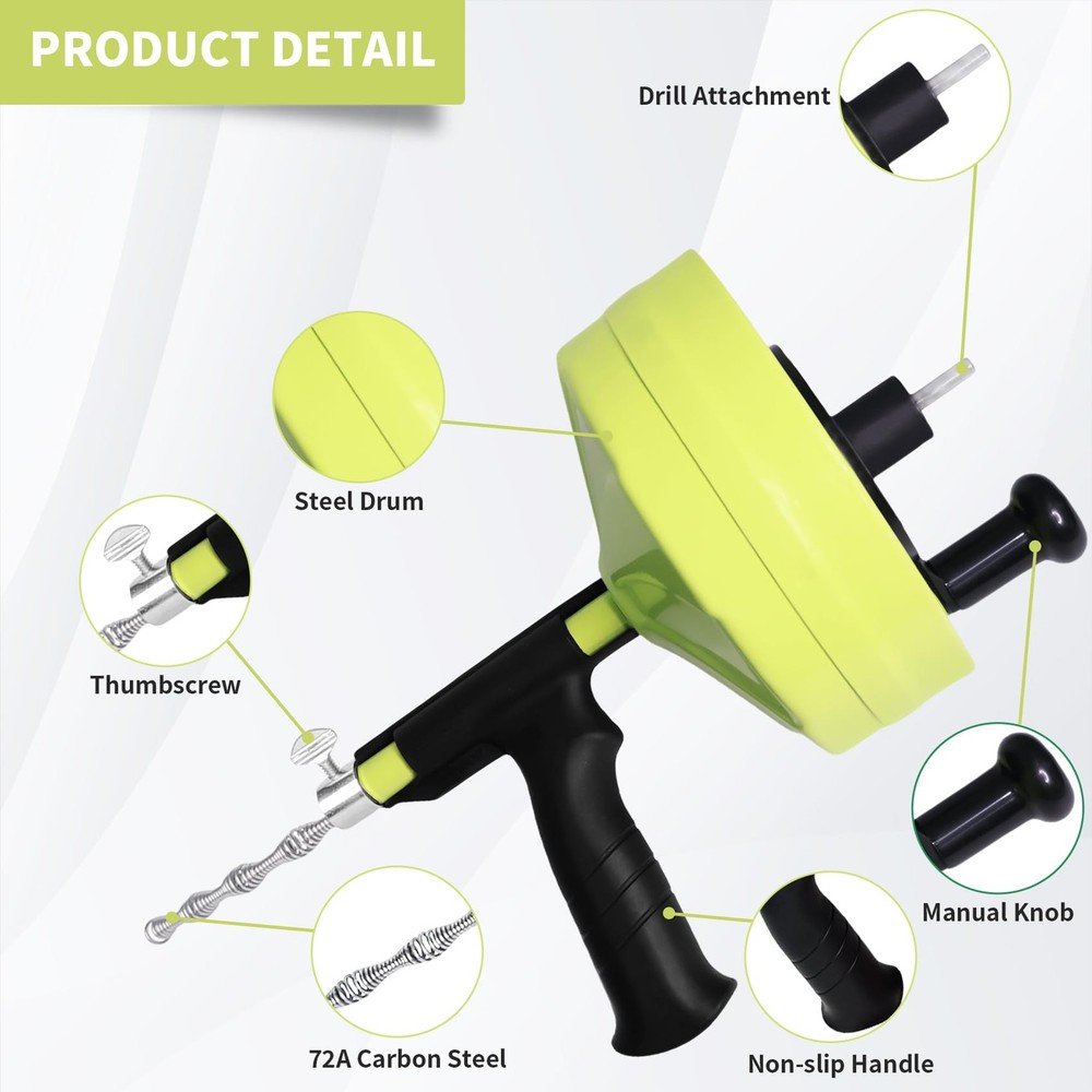 The drain snake is an incredibly powerful tool, designed to tackle even the toughest clogs with ease. With its robust steel cable, the drain snake can quickly navigate through pipes, breaking through blockages that would be difficult to clear with other methods. Whether you're dealing with hair, grease, or debris, the drain snake's functionality ensures your drains stay clear. Its flexibility and strength make the drain snake a must-have for anyone needing a reliable solution for persistent clogs. The drain snake's efficiency allows you to handle drain issues on your own, saving both time and money. The 50 ft drain snake is built to be incredibly durable, designed for long-lasting use in both residential and commercial settings. With its tough steel cable, the 50 ft drain snake can easily handle tough blockages, making it a reliable tool for any plumbing job. The 50 ft drain snake's sturdy construction ensures it can withstand heavy-duty use without breaking or bending. Whether you're clearing drains at home or on the job, the 50 ft drain snake's durability makes it the perfect tool for the task. You can count on the 50 ft drain snake to deliver consistent, reliable performance every time. The snake drain is a convenient and quick solution for clearing clogged drains. With the snake drain, you can easily reach blockages without any complicated tools or professional help. The snake drain makes it simple to clear pipes in just a few minutes, saving you both time and effort. Its flexible design allows the snake drain to navigate through tight bends and obstacles, ensuring fast and effective results. Whether you're dealing with a minor clog or a more stubborn blockage, the snake drain is a reliable tool that gets the job done quickly and efficiently. The plumbing snake is a time-saving tool that helps you clear clogs quickly and efficiently, eliminating the need for costly professional plumbing services. With the plumbing snake, you can easily tackle blockages yourself, saving both time and money. This reliable plumbing snake ensures your drains stay clear, reducing the chances of needing expensive repairs. The plumbing snake is not only effective but also affordable, making it a smart choice for homeowners looking to save money on plumbing issues. By using the plumbing snake regularly, you can maintain your pipes without the high costs of hiring a plumber. The plumbing snake 50ft is incredibly easy to use, making drain cleaning a hassle-free task. With the plumbing snake 50ft, you simply insert the cable into the drain, and its smooth operation allows you to clear clogs with minimal effort. The plumbing snake 50ft is designed with an ergonomic handle, ensuring a comfortable grip as you maneuver the cable through pipes. Whether you're a DIY enthusiast or a professional, the plumbing snake 50ft provides a straightforward solution to unclogging drains. Thanks to its user-friendly design, the plumbing snake 50ft lets you tackle plumbing issues quickly and efficiently without the need for specialized skills. The snake drain clog remover lets you clear blockages without having to wait for a plumber. With the snake drain clog remover, you can immediately start working on your clogged drain, eliminating the need for delays. This tool is designed for fast action, allowing you to quickly remove clogs without waiting for long periods. The snake drain clog remover makes it easy to tackle drain issues right away, saving you valuable time. Forget about waiting for expensive repair services—the snake drain clog remover puts the power in your hands to resolve blockages instantly. The drain snake is a safer and more effective alternative to harsh chemical cleaners. Unlike chemical solutions, the drain snake does not pose any risk to your health or the environment. Using a drain snake to clear blockages ensures you avoid the harmful effects of chemicals that can damage your pipes over time. The drain snake offers a natural solution for maintaining clear drains without resorting to dangerous chemicals. By choosing the drain snake, you’re opting for a safer, eco-friendly way to keep your plumbing in top condition. POWERFUL 50 FT DRAIN SNAKE: This drain snake 50 ft features a unique auger head designed to quickly tackle clogs caused by hair, pet fur, food residue, and more. This 50-foot drain snake is perfect for home use and is an ideal DIY tool for clearing clogs in showers, bathtubs, kitchen sinks, drains, and drainage pipes. Compared to calling a plumber or using chemical drain cleaners, choosing our reusable 50 ft snake drain clog remover is a more economical option, saving both money and time. FRIENDLY DRAIN SNAKE: Using harsh chemical cleaners to clear your drains can harm your family's health, damage the environment, and corrode your pipes. Our 50 ft drain snake provides a safer alternative that won’t harm or erode your plumbing, making it the perfect tool for everyday pipe maintenance! While using a drain snake to clear your drain may be challenging, once it's done, you'll not only enjoy an unobstructed drain but also save on expensive plumbing repair costs. Keep your pipes in top condition and avoid expensive professional services by using a drain snake for regular maintenance. EASY TO USE: Simply pull out the steel cable from the plumbing snake and insert it into the drain until you reach the blockage. Rotate the attached handle on the drum to twist and pull out the cable along with the blockage, easily clearing the pipe. The plumbing snake is not recommended for unclogging toilets, as it may damage the porcelain. Note: When using the plumbing snake, ensure it is used within 3 inches of the drain opening. (For more detailed instructions, please refer to the included manual.) DURABLE AND STURDY: The 50 ft plumbing snake is made with a tough steel drum housing, and its ergonomic handle ensures a comfortable and easy grip. The plumbing snake features a 50-foot high-quality steel cable that is both