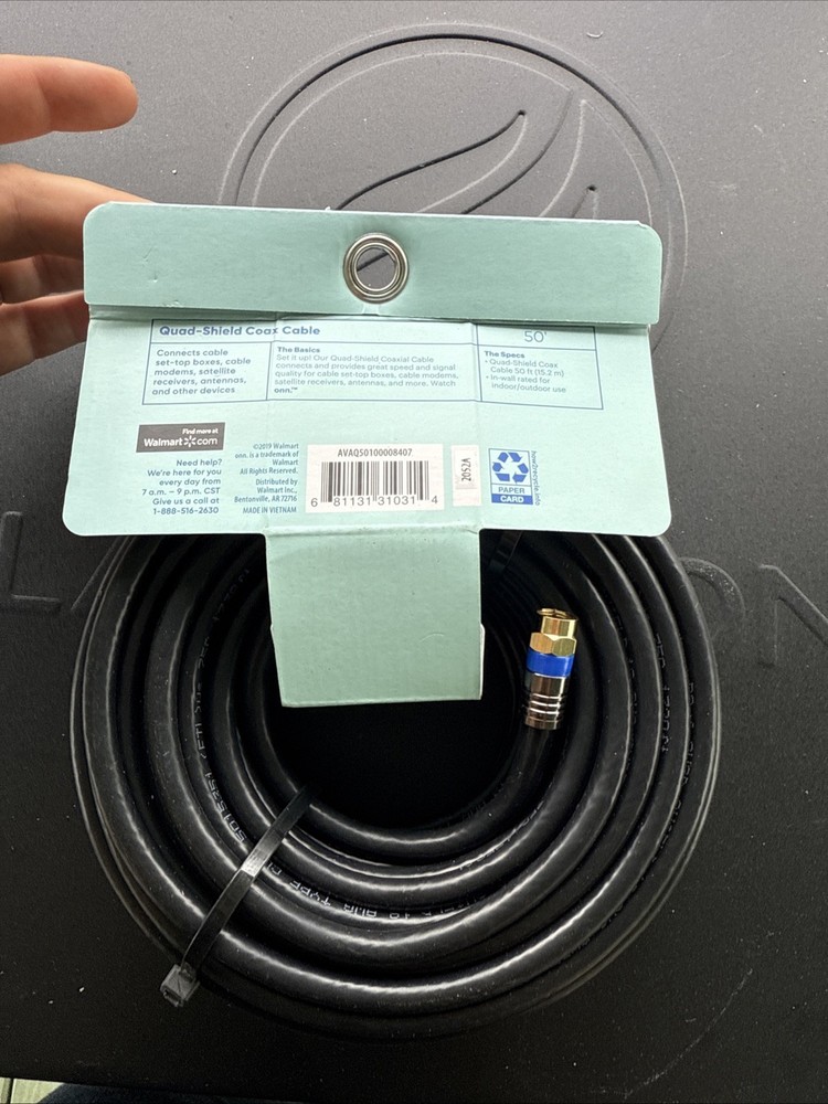 The Quad-Shield Coax Cable with a length of 50ft is designed for use with ONN black antennas, providing a reliable connection for both indoor and outdoor installations. This cable, manufactured by the brand Onn, offers a shielded design to ensure maximum signal strength and durability. Perfect for various electronic devices, this cable is ideal for setting up a strong and stable connection for your television or other electronic devices.