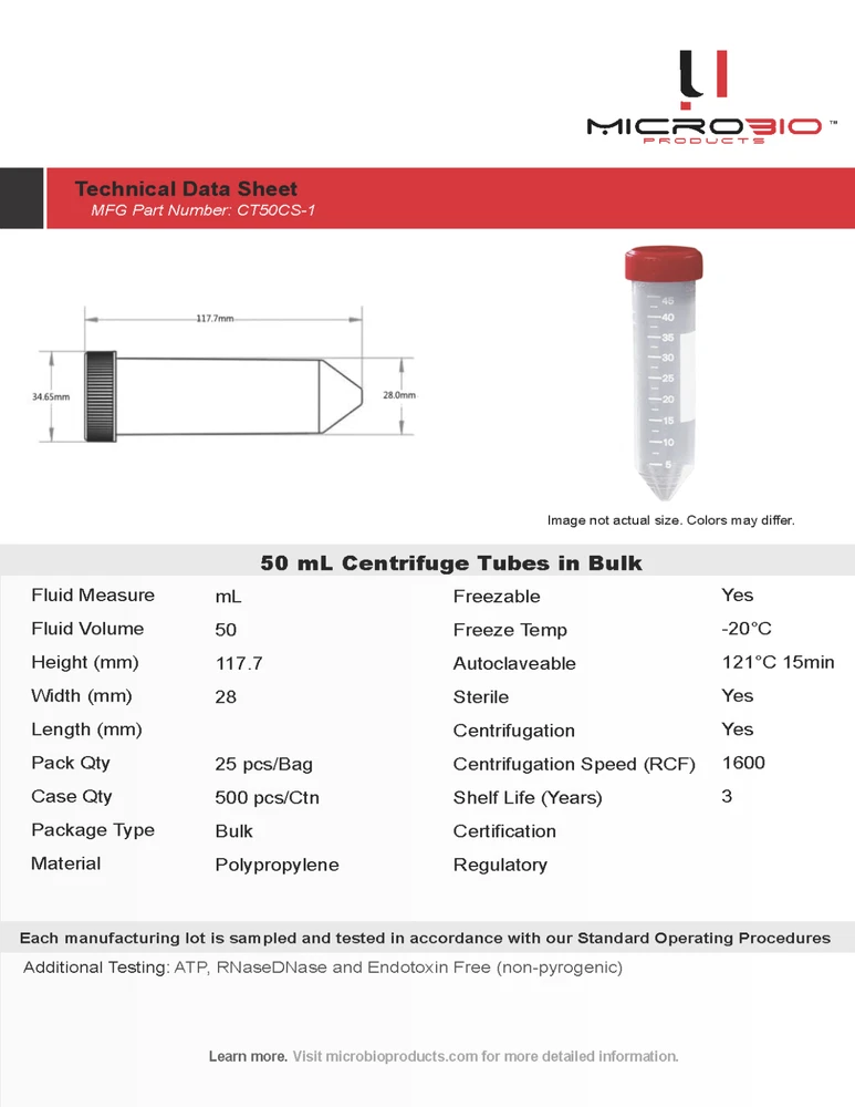 This limited time offer includes sterile 50mL centrifuge tubes from MicroBio Products, made of durable polypropylene material and designed with a screw cap for secure closure. The tubes come in a Case of 500 (25 pieces per bag), making them ideal for use in microbiological, medical, and biological laboratories. The units are suitable for a variety of applications, including centrifugation, filtration, and sample storage. They are compatible with different unit types and volumes, making them a versatile addition to any laboratory or clinic. This item is perfect for those in need of reliable and high-quality laboratory supplies.