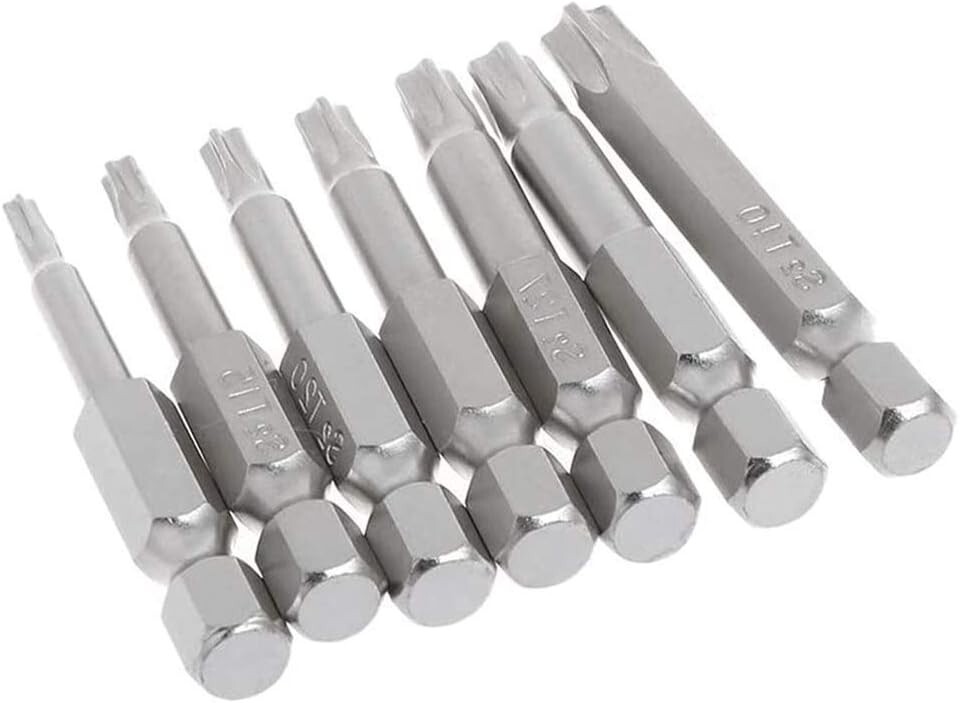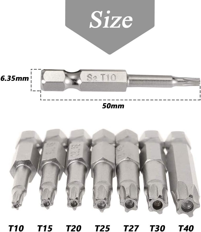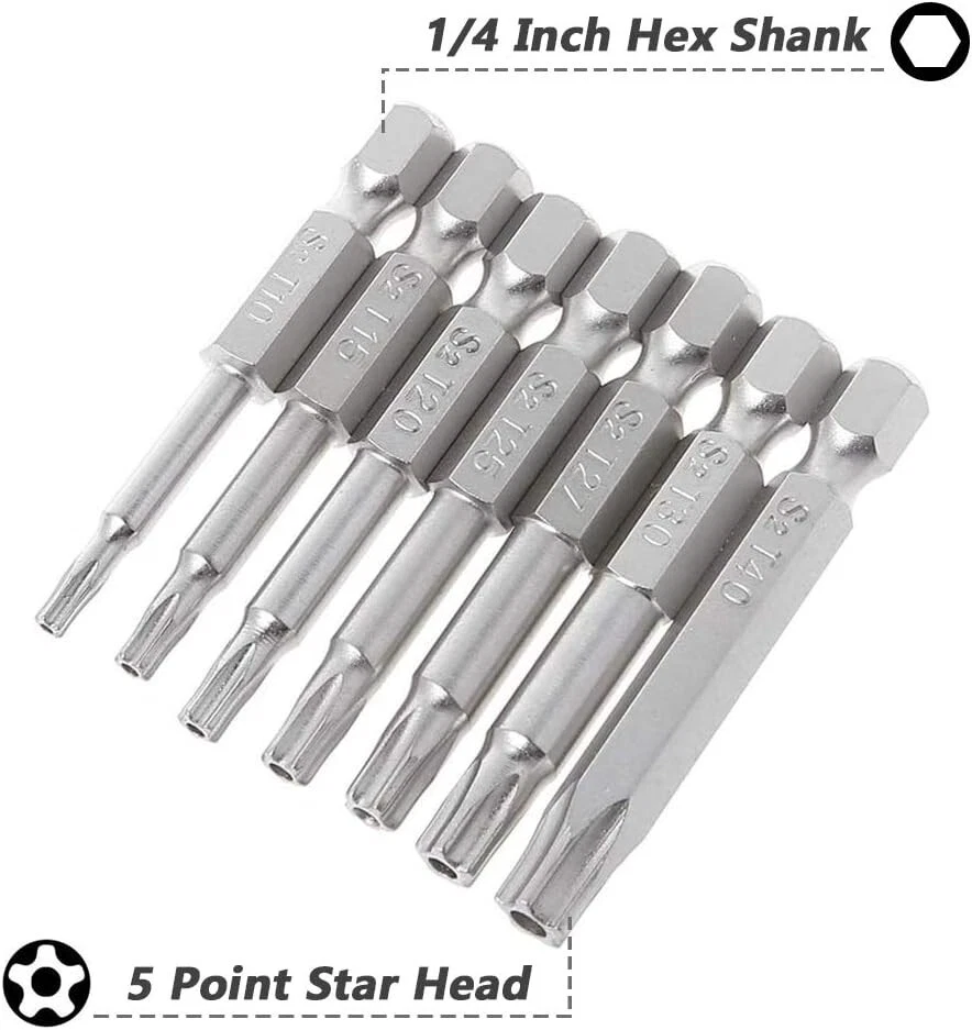 2 Sets of star screwdriver bits in 7 different size(7 pieces each set) can meet your various needs Type of Head: Torx Star 5 Point; 7 Size: T10, T15,T20, T25, T27,T30, T40; Overall Length: 50mm/ 2 inch Made of high quality S2 steel for durability, ideal tool for repairing household appliances, precision instruments, furniture Strong Magnetic & Exquisite workmanship, each edge can be accurately locked screws, easy to suck the screws, no damage to the screw 5-Pointed Torx Screwdriver Bits with 1/4-Inch Hex Shank, suitable for electric screwdrivers, hand screwdrivers, electric drills, air drills and so on